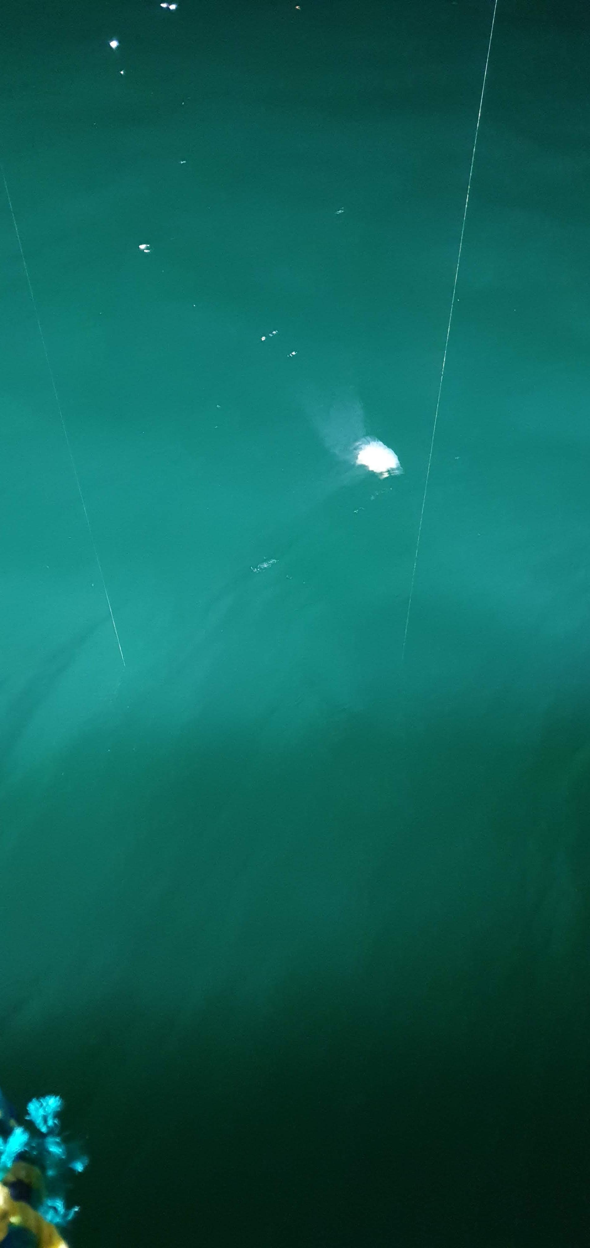 물고기는 안 보이고 해파리가 보입니다. 해파리가 보일 때는 낚시대를 걷어 올립니다. 해파리가 미끼를 먹고 갈 수도 있기 때문입니다.
