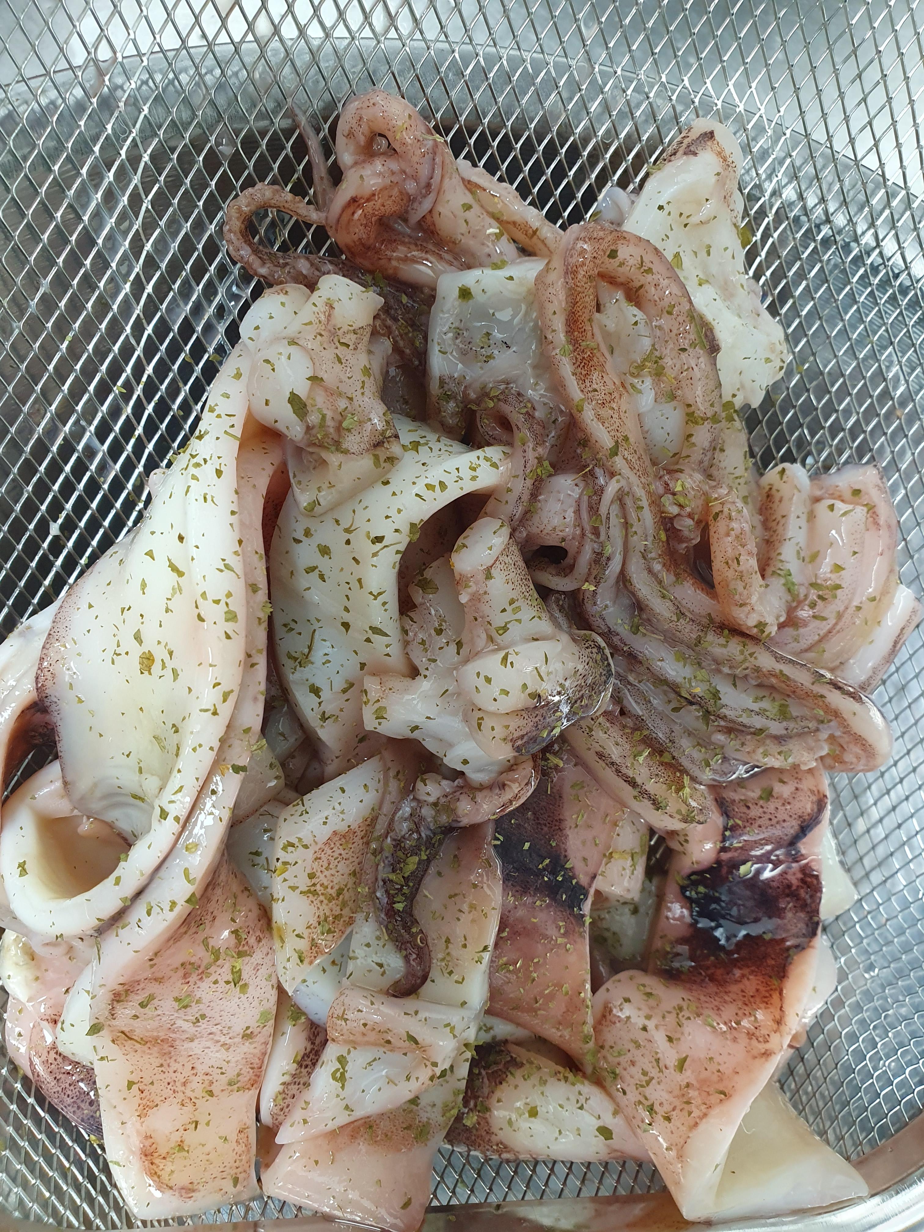 오징어튀김도 같이 하기 위해서 오징어를 먹기좋게 길게 썰은 후 파슬리를 뿌립니다.