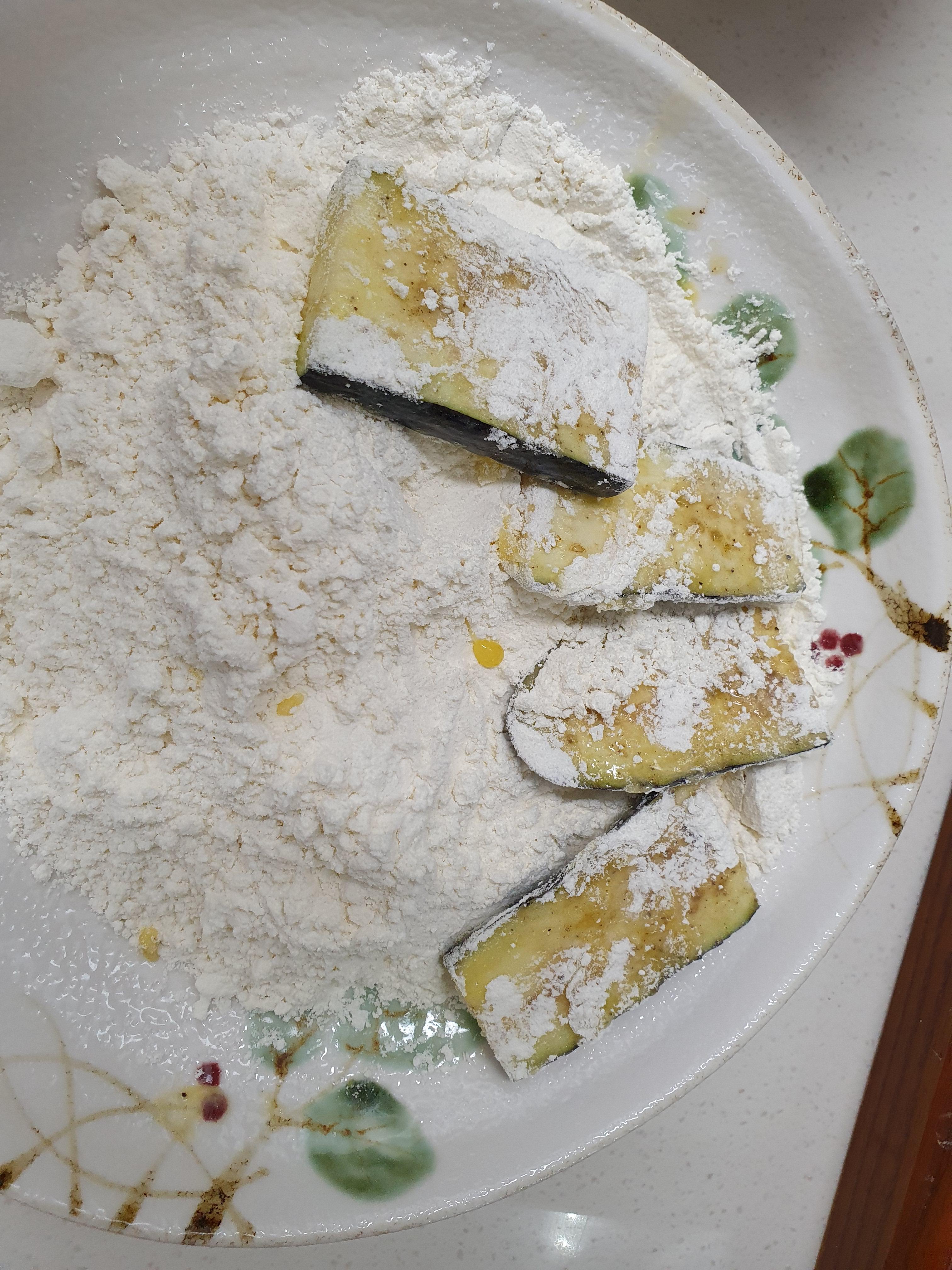 가지튀김은 계란을 묻힌 후 밀가루를 가볍게 입혀 줍니다.