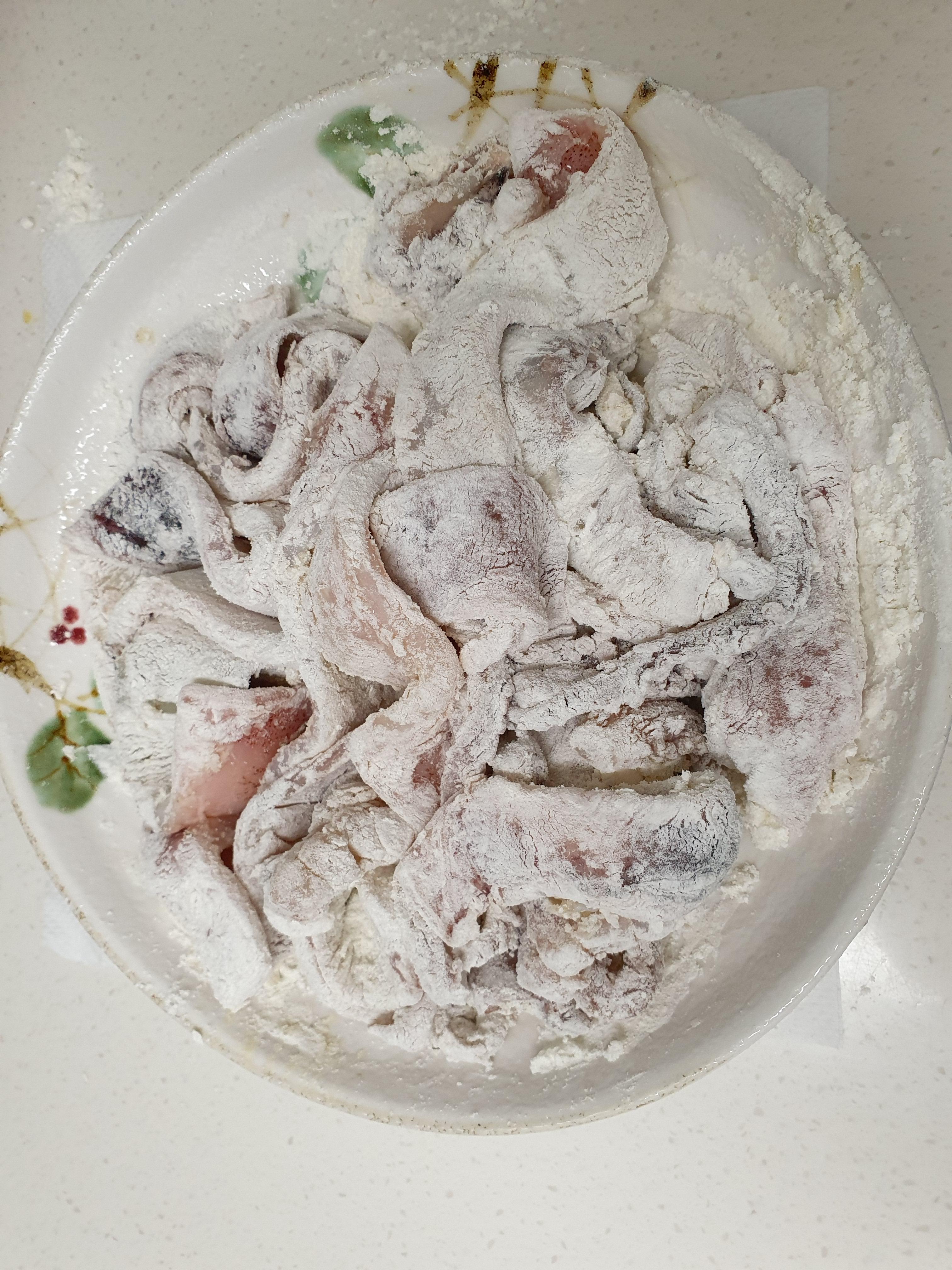 밀가루를 오징어에 묻힌 후 오징어반죽을 한 번 더 입혀 줍니다.