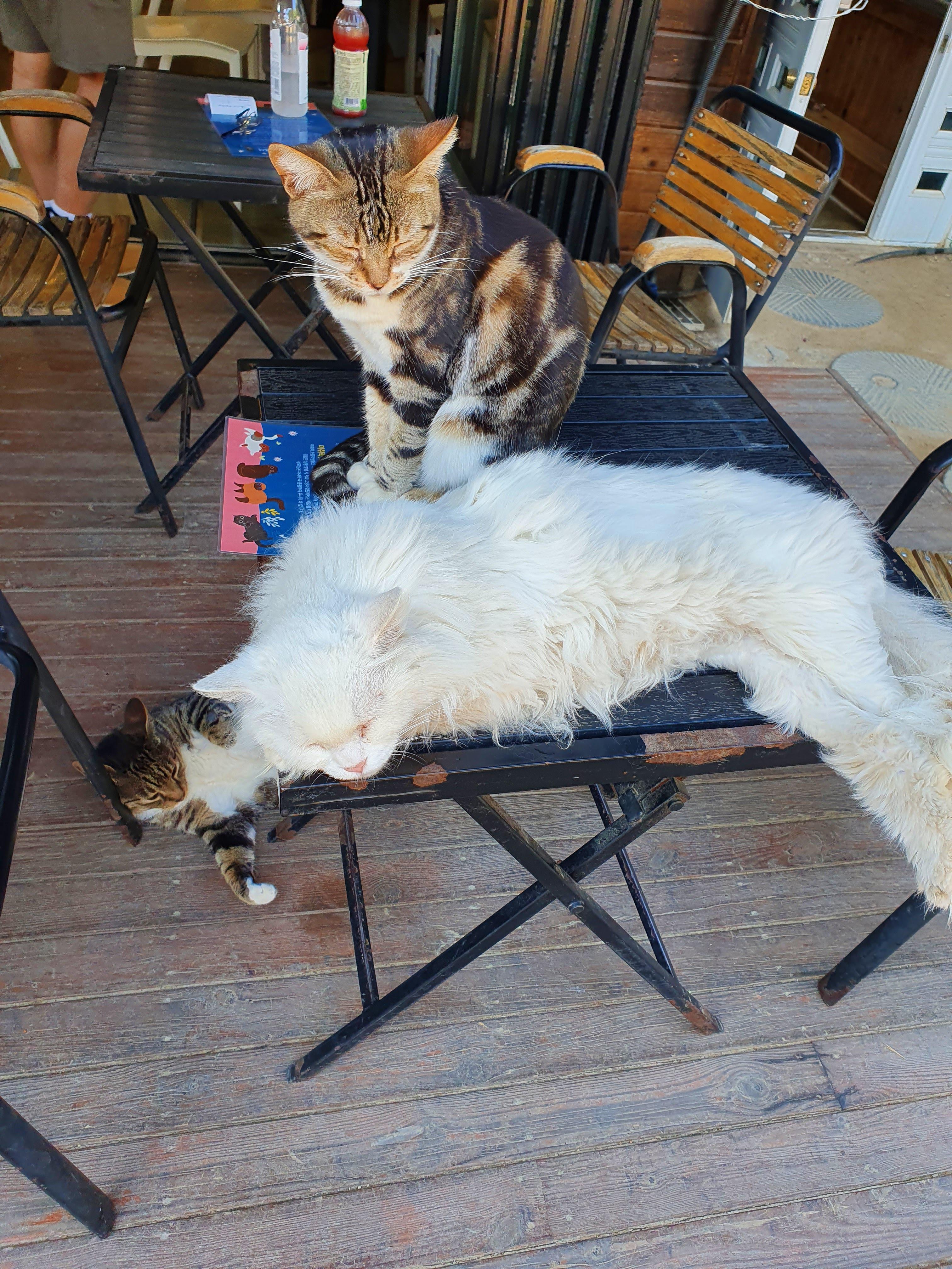 고양이 삼형제가 우애도 좋게 같은 테이블에서 자고 있네요.