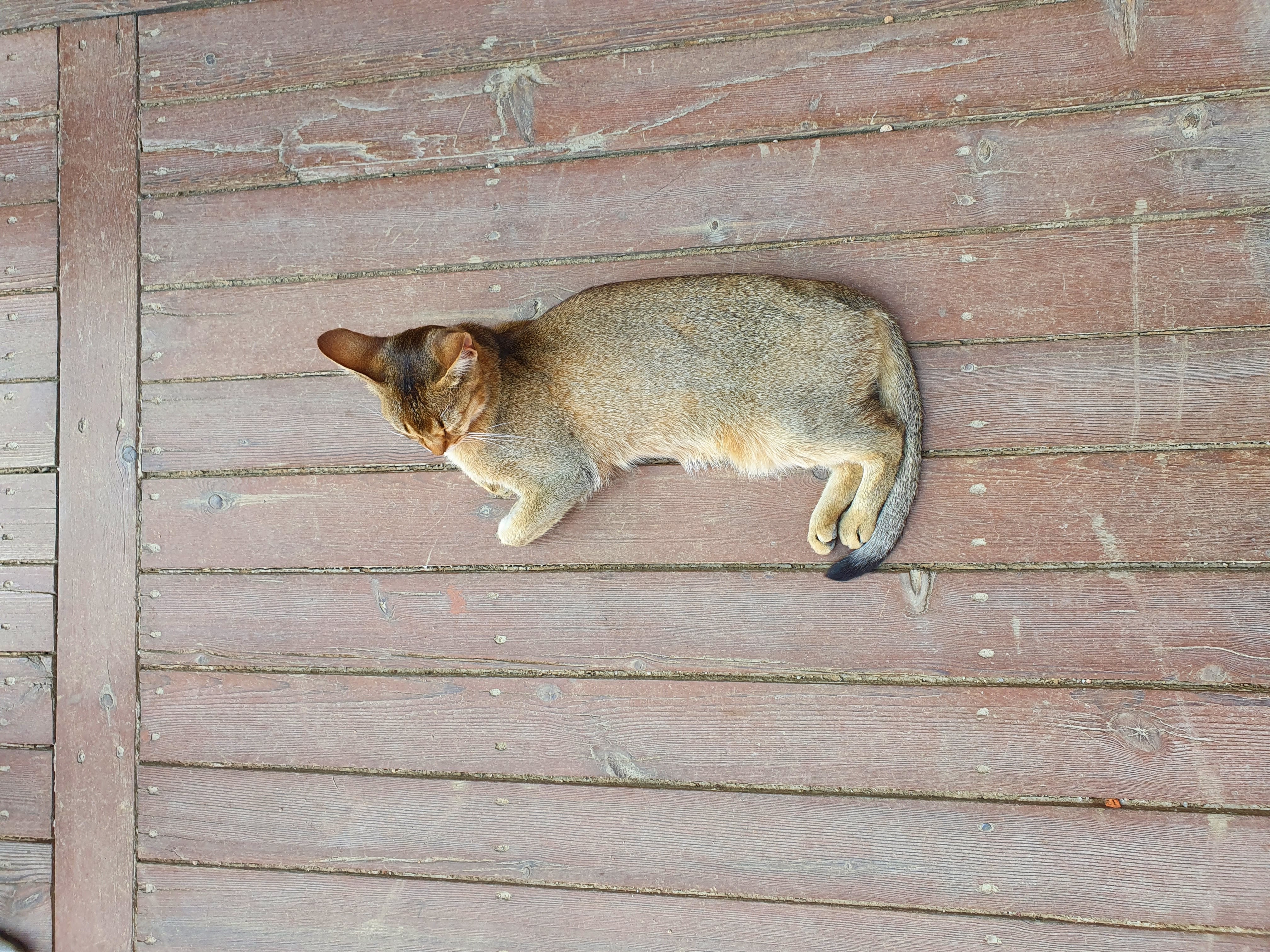 표범을 닮은 듯한 눈이 매력적인 아비시니안이 마루에서 졸고 있네요.