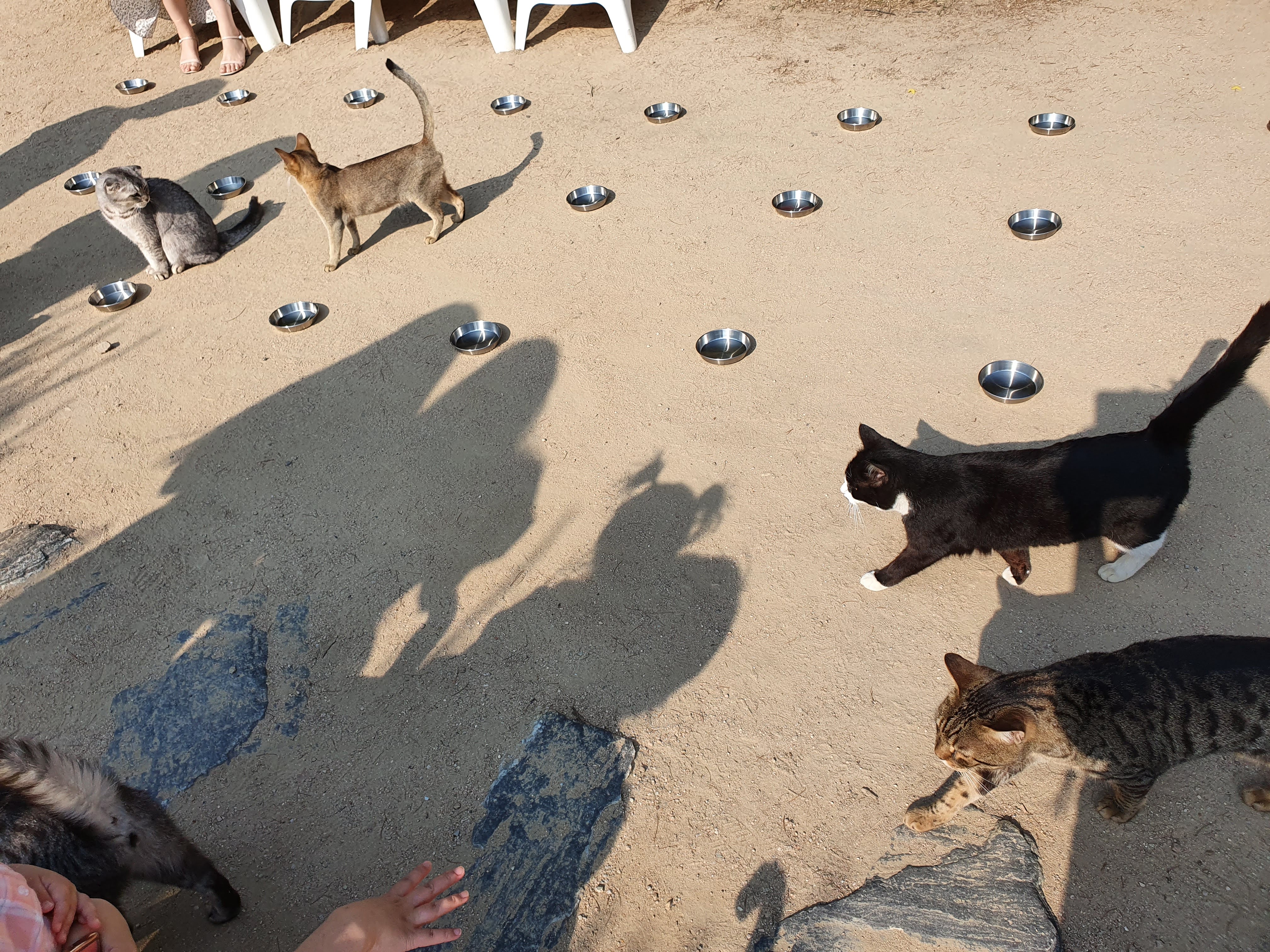 고양이정원에서 간식시간이 왔네요, 종소리가 울리자 자고 있던 냥이들이 모여들었어요.