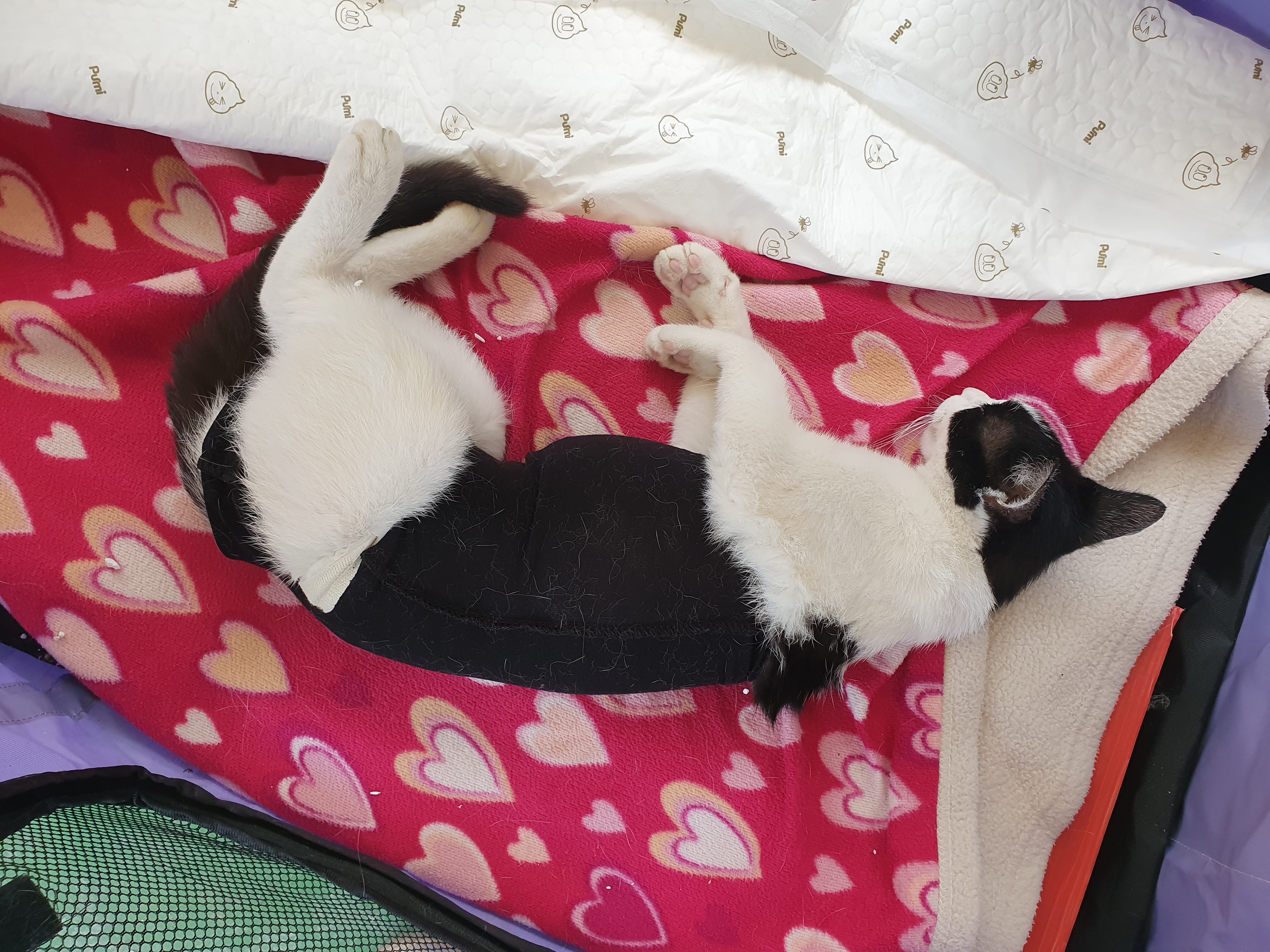 중성화수술은 생객보다 짧았습니다. 한 시간 만에 끝났습니다. 배에 붕대를 감았는데 더 안전하게 하려고 고양이환부복을 만들어 주었습니다.
