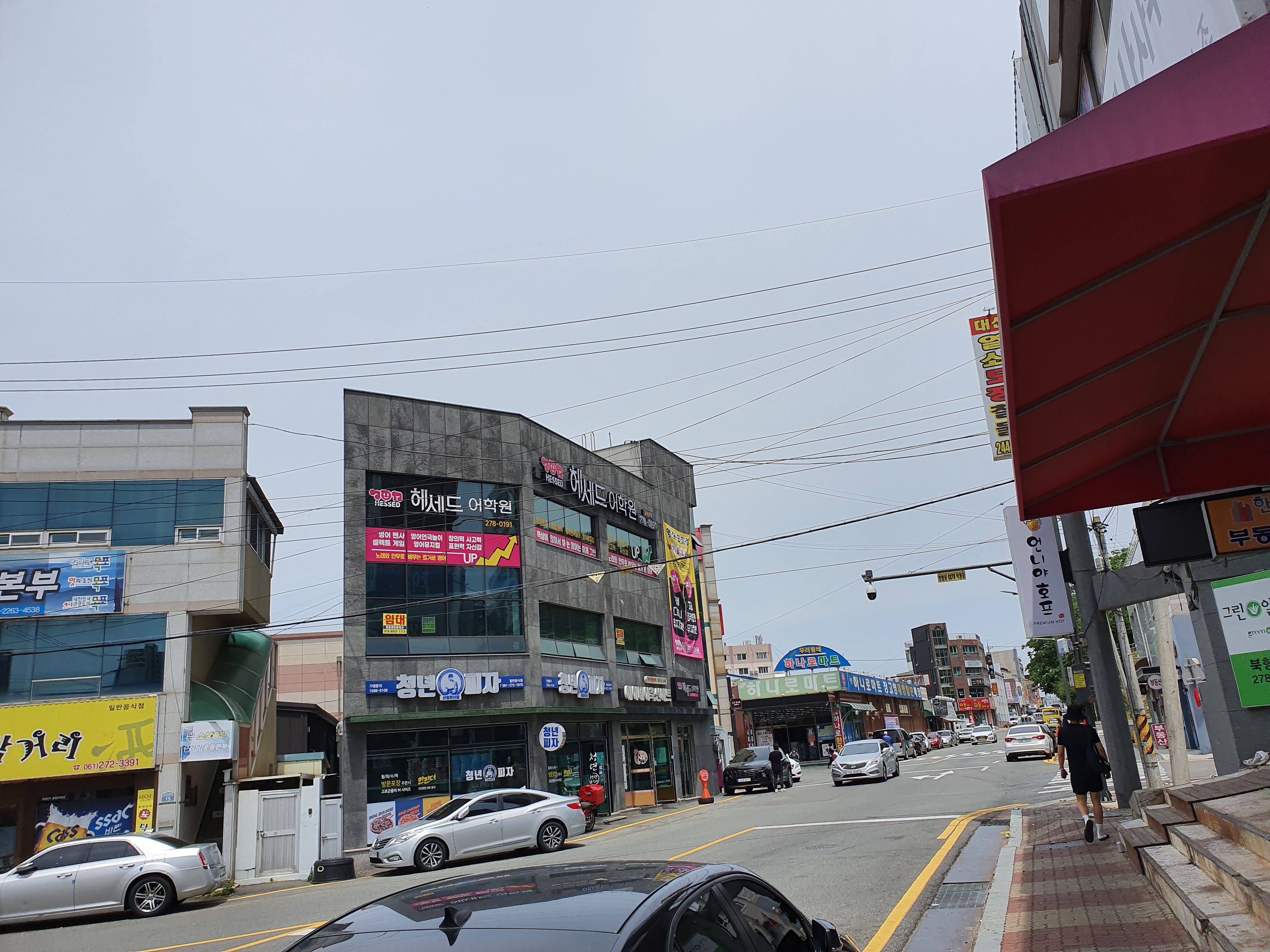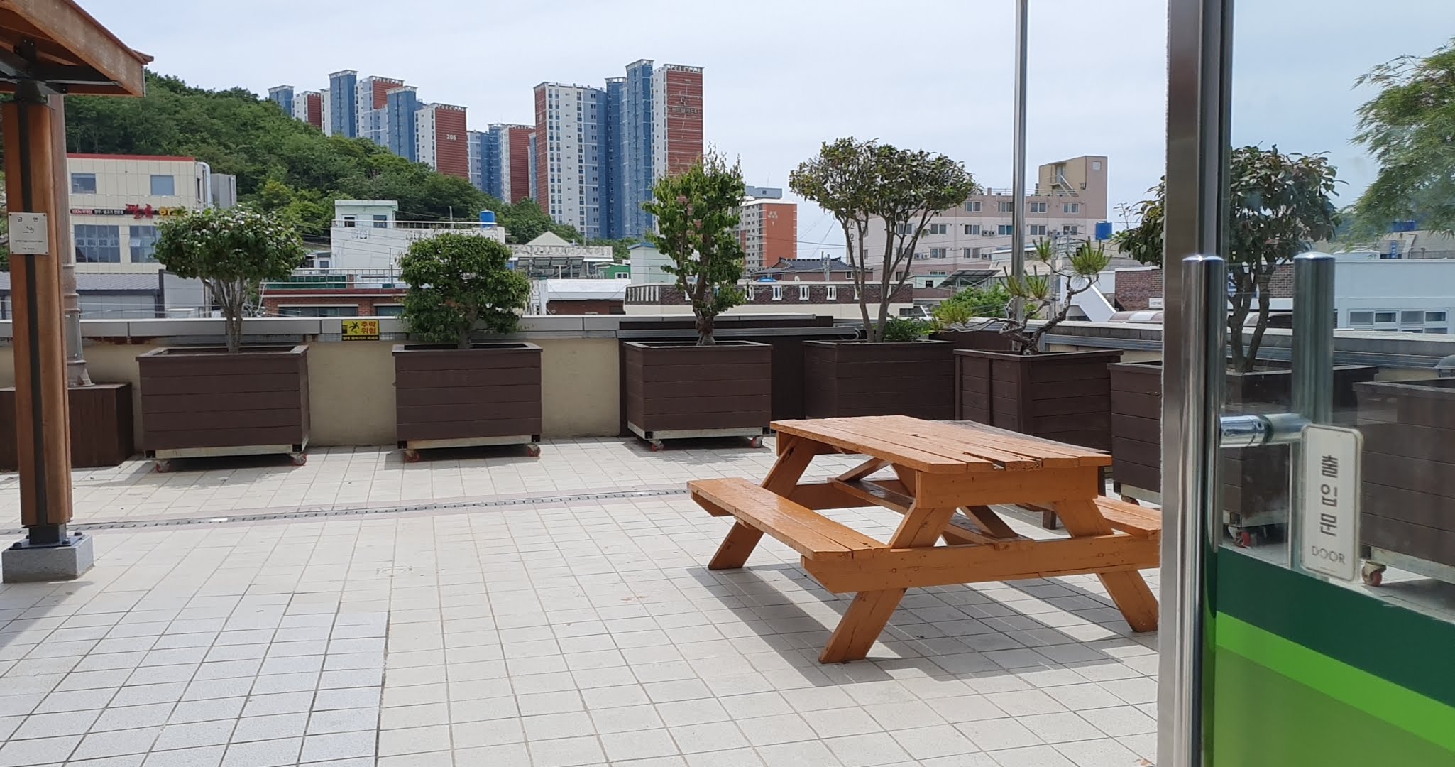 2층에 휴게실이 있습니다. 휴게실 밖으로 나가면 '하늘정원'이라는 실외 휴게실도 있습니다. 멀리 라송아파트도 보입니다.