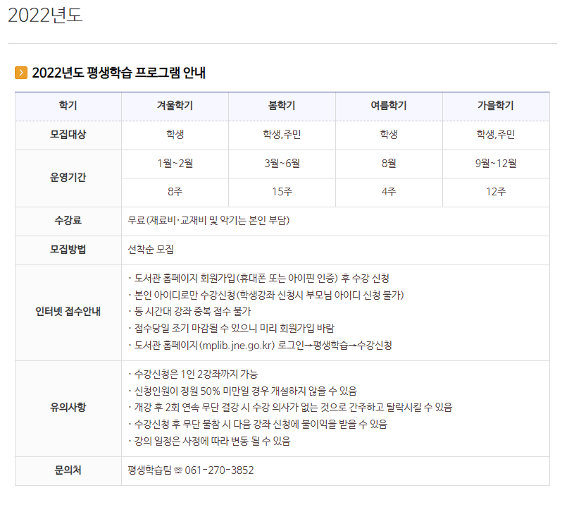2022년도 프로그램 접수나 문의사항은 위 모집대상, 운영기간, 수강료 등을 확인하시고, 061-270-3852로 문의하시면 좋을 거 같습니다.