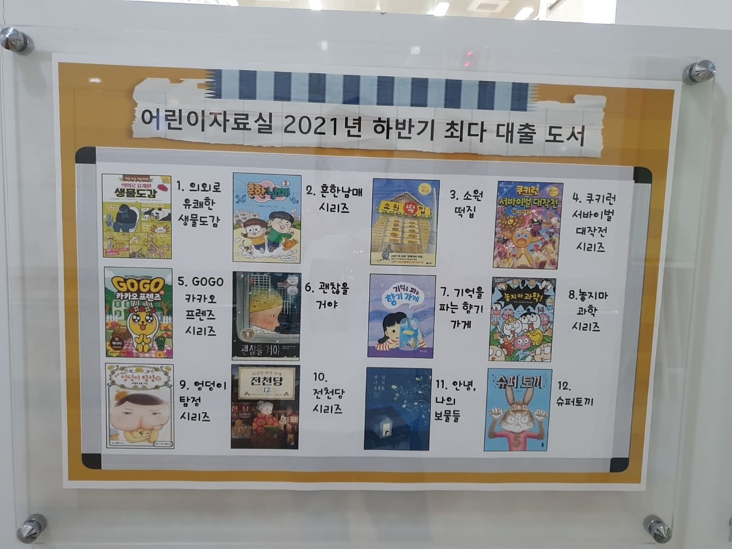 어린이자료실 2021년 하반비 최다 대출 도서 순위도 있네요. 의외로 유쾌한 생물도감, 흔한 남매 시리즈, GOGO 카카오프렌즈 시리즈 등등. '흔한남매 시리즈'는 조카가 어릴 때, 좋아하던 책이라서 선물로도 사 준 적이 있어서 눈에 확 띄네요. 조카랑 같이 흔한남매 유튜브도 보고 했는데 지금은 멀리 떨어져 사니 갑자기 보고 싶네요.