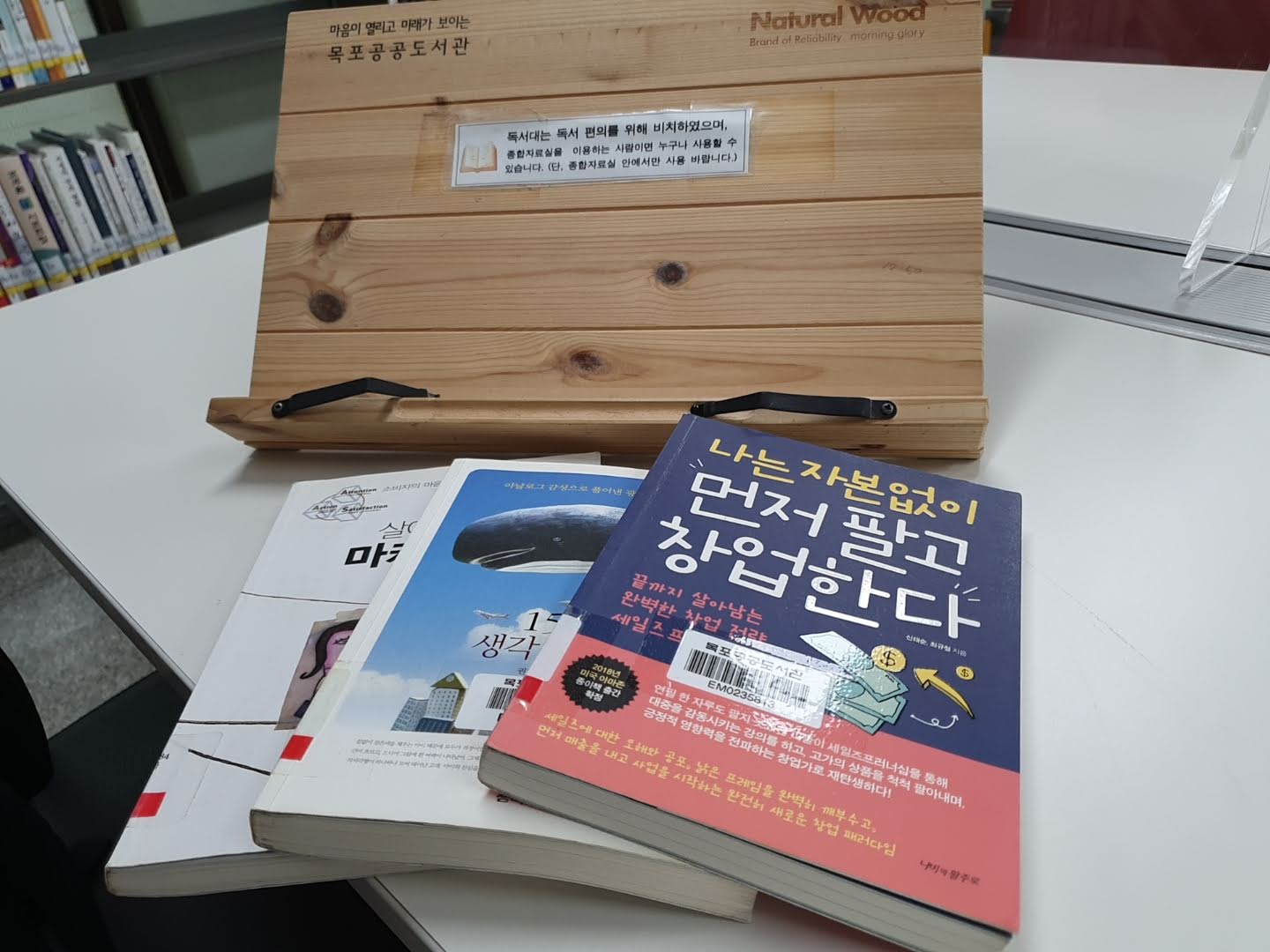 오늘은 시간이 조금 있어서 빌린 책을 조금 보고 가려고 열람실에 자리를 잡았습니다. 독서대도 제공을 하는군요.