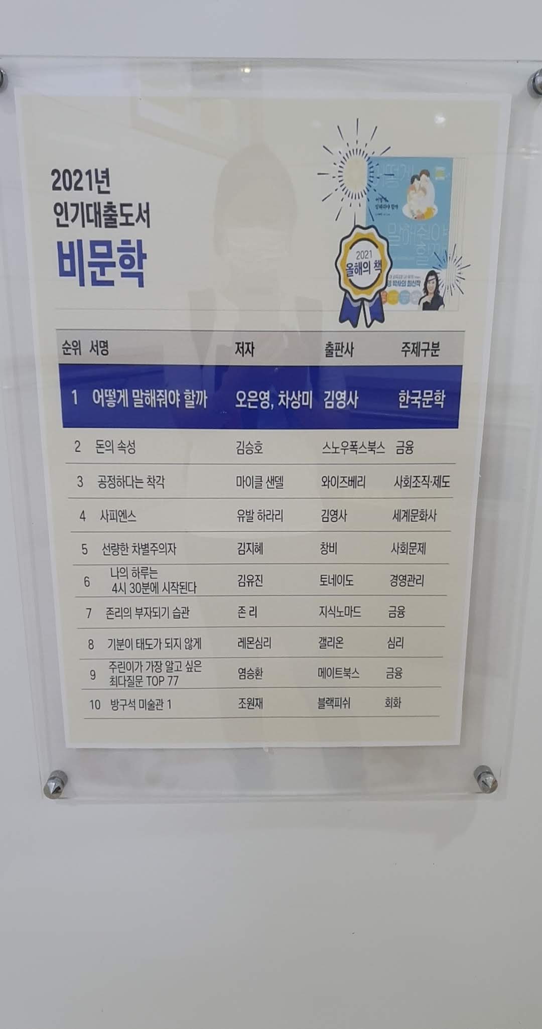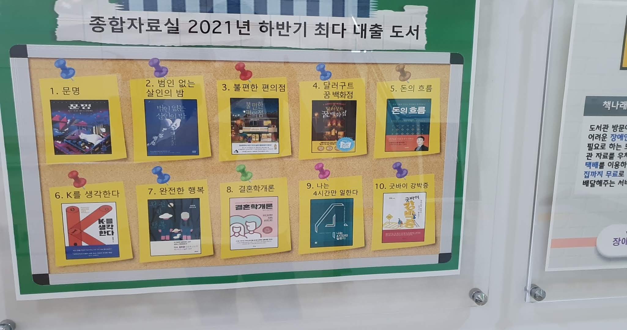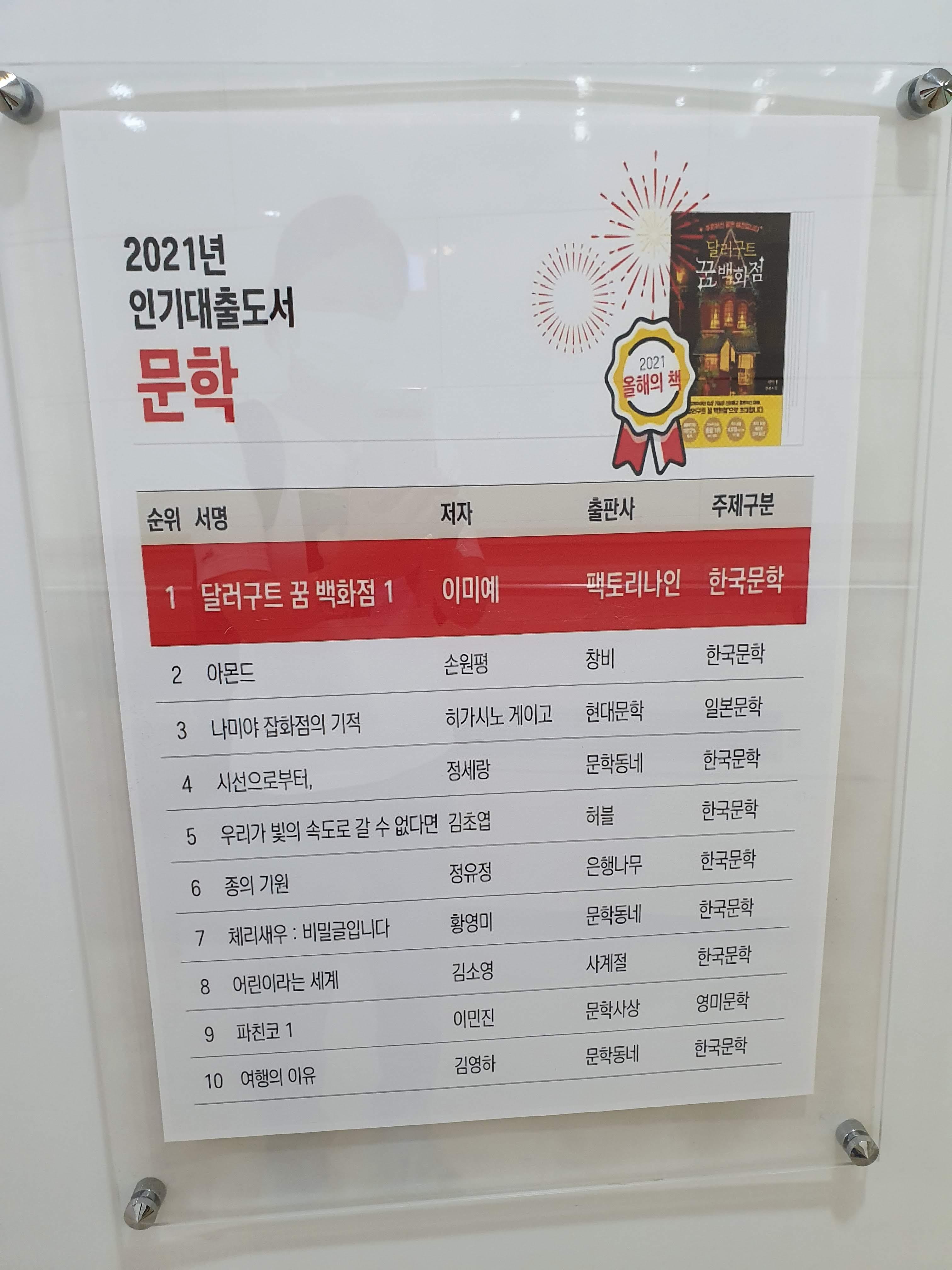 그리고 2021년에 많이 대출한 책들 순위도 보였습니다. 문명, 범인 없는 살인의 밤, 불편한 편의점 등등