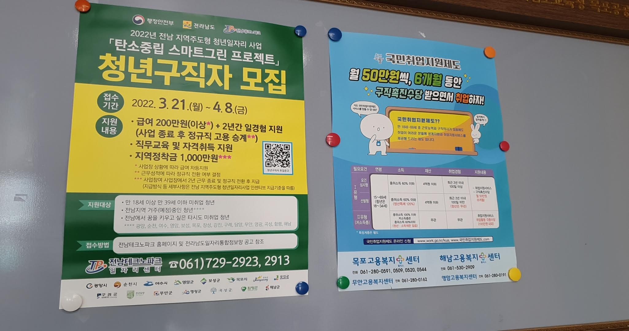 [탄소중립 스마트그린 프로젝트]나 [국민취업지원제도] 등도 있네요. 해당되시는 분들은 월 50만원씩, 6개월 동안 구직촉진수당 받으면서 취업하는 것도 목포 고용복지센터에 알아보는 것도 좋을 거 같습니다.