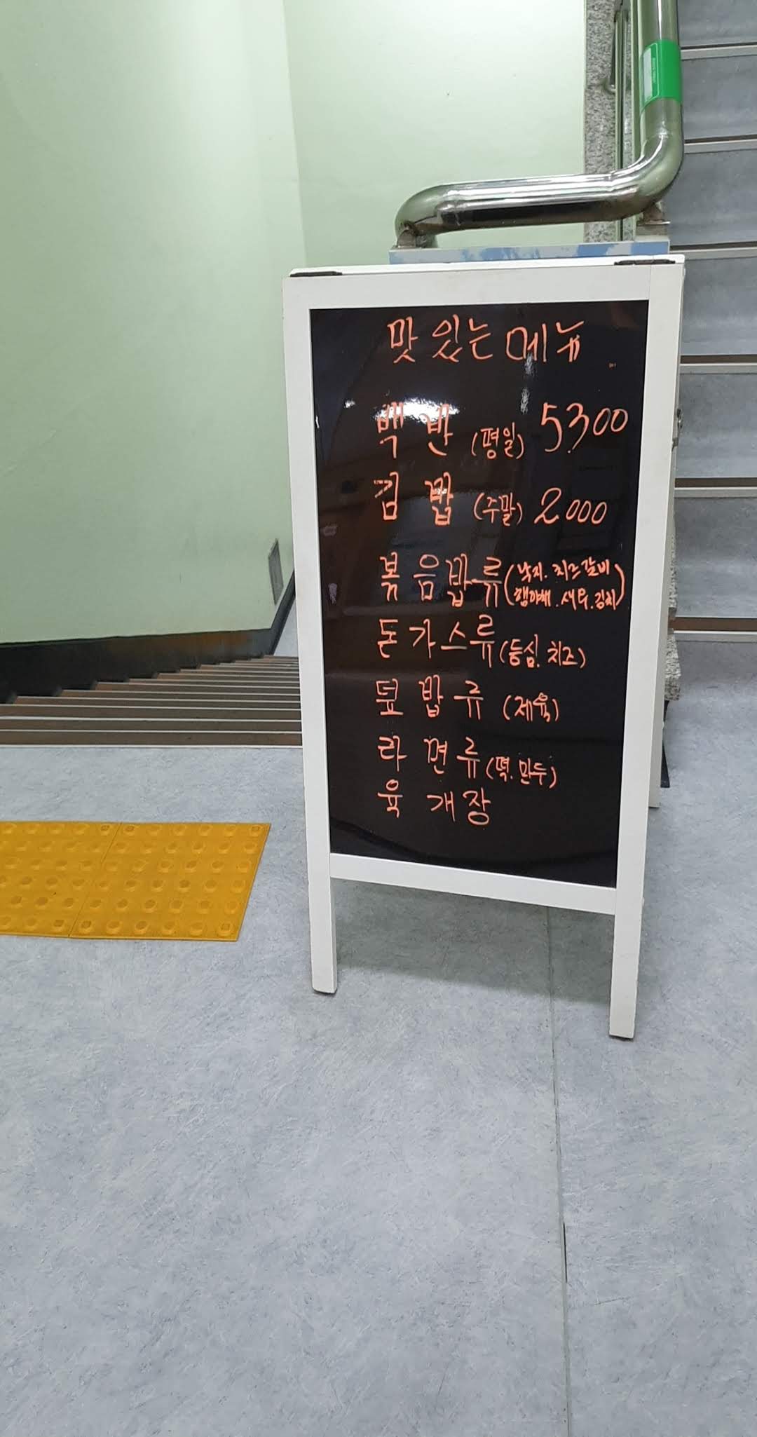 어릴 때는 도서관에서 공부하다가 보면 왜이리 배가 고프던지, 매점 메뉴를 빼놓을 수 없네요. 백반 5300원이면 저렴한 편이네요. 그런데 다른 메뉴는 금액이 안 적혀 있네요. 아직 한 번도 도서관에서 밥을 먹을 정도로 오래 있지를 않아서 다른 메뉴 금액은 아직 모르겠습니다. 식당은 지하에 위치하고 있었습니다.