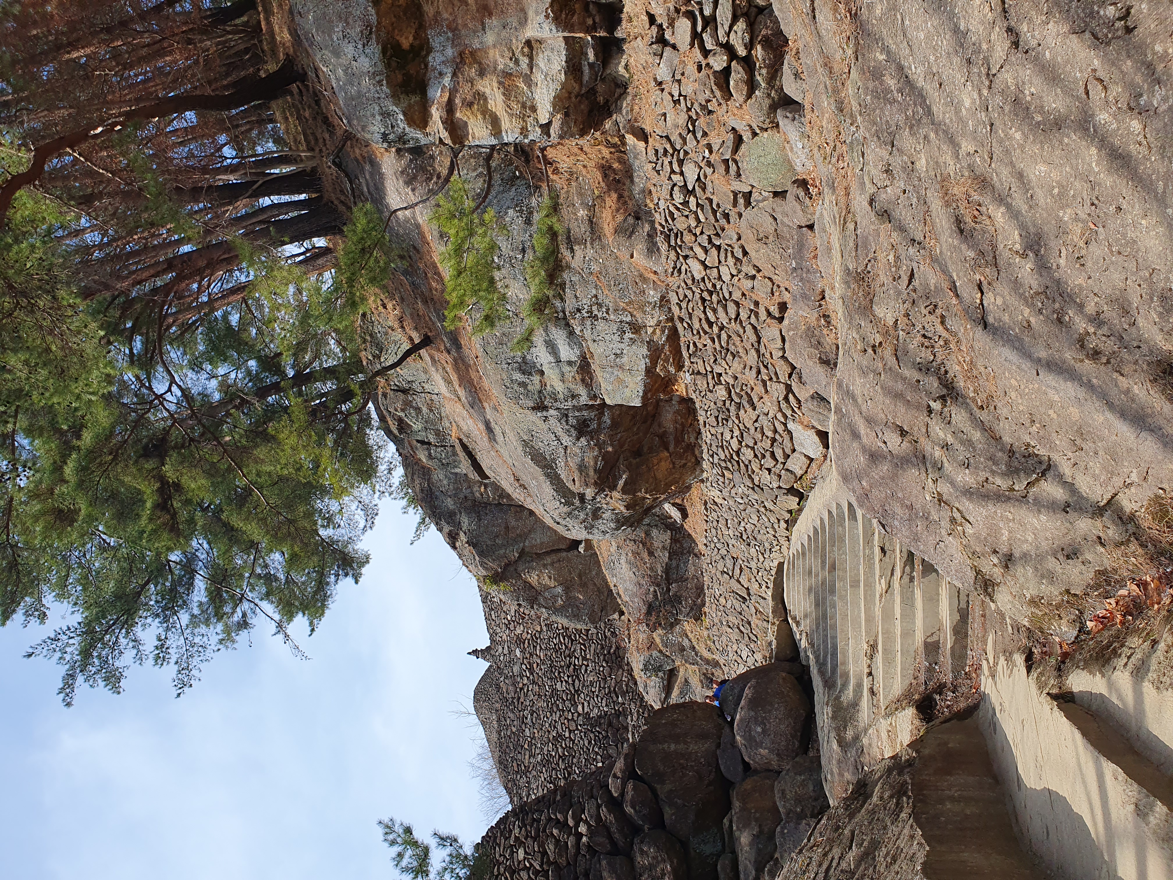 쌓아 있는 돌 사이로 계단이 있어서 가기는 편했습니다. 삼성궁 갈 때는 편한 신발이 필수인 거 같아요. 저는 산에 간다고 해서 트레킹화를 신고 가기는 했습니다.