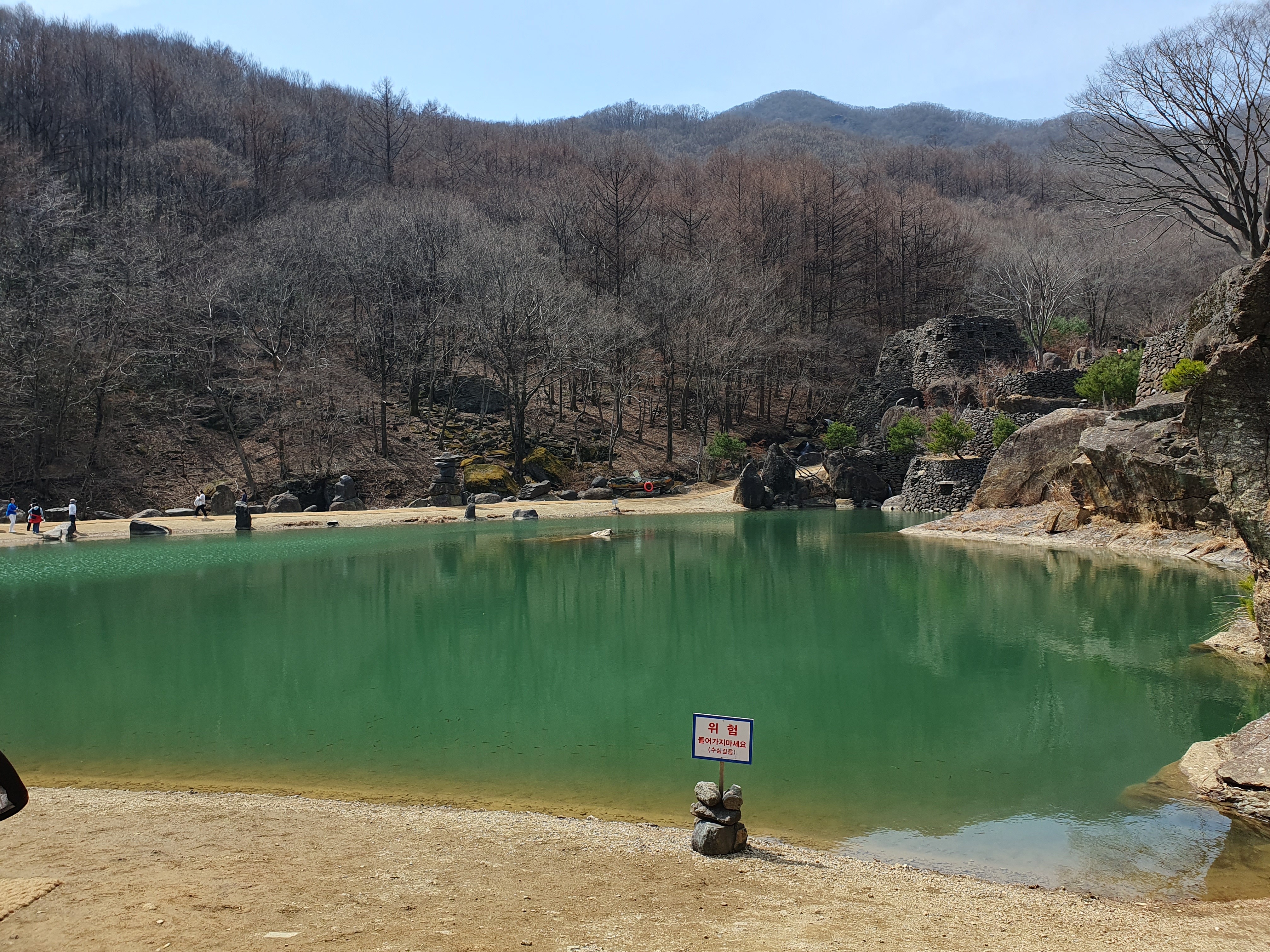 돌길을 따라가다 보면 녹색의 커다란 연못이 나옵니다. 관절이 안 좋은 분들은 여기까지 올라왔다가 내려가시는 거 같아요. 이곳에서 사진을 많이 찍더라구요