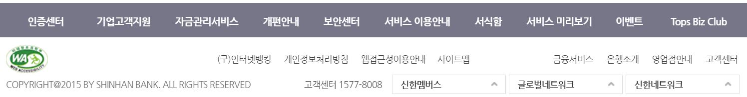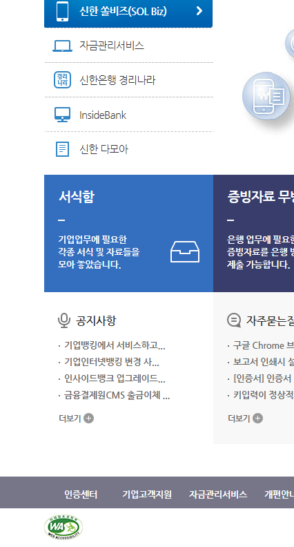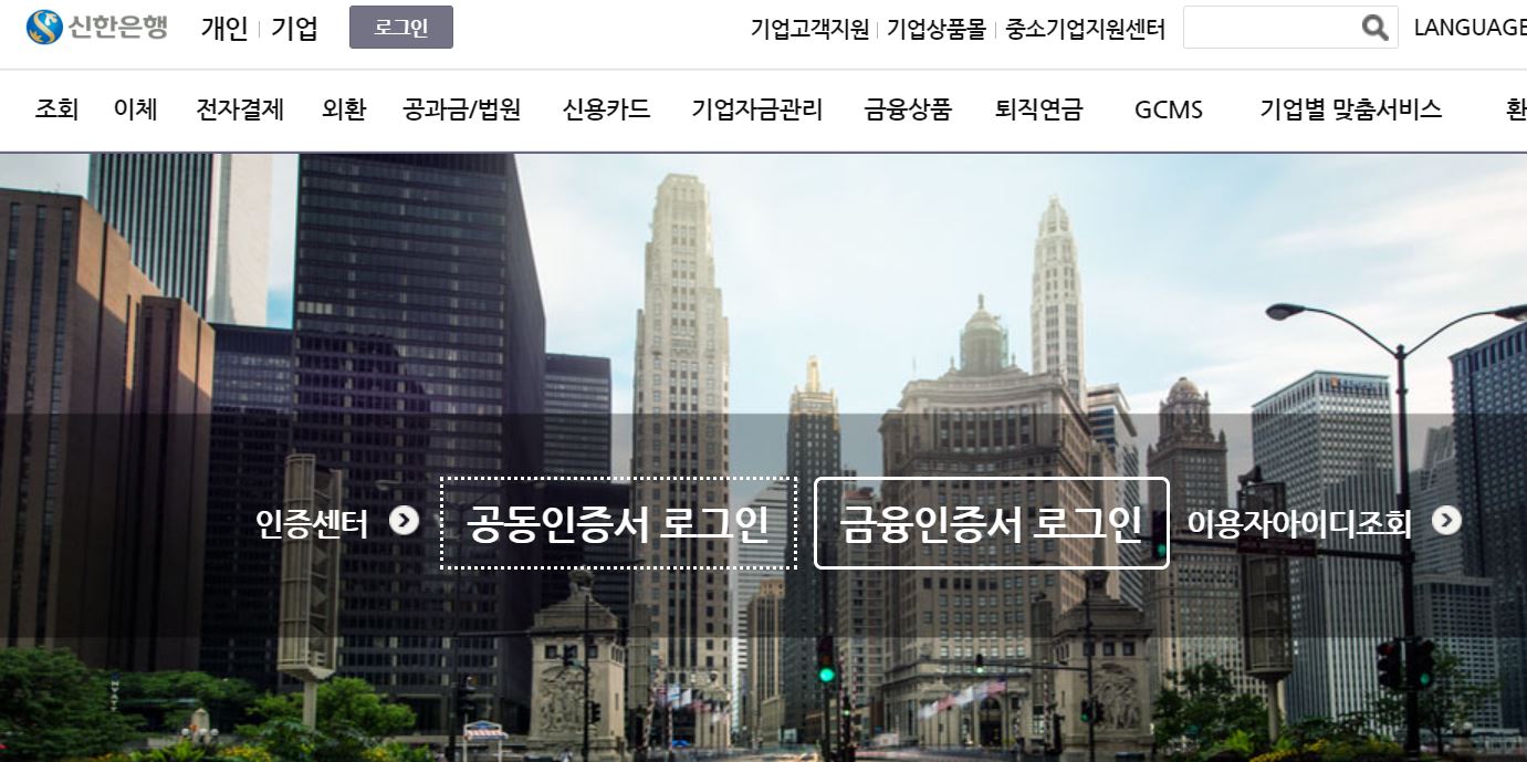 신한은행 사이트의 기업 클릭, 공동인증서로 로그인하기로 했다.