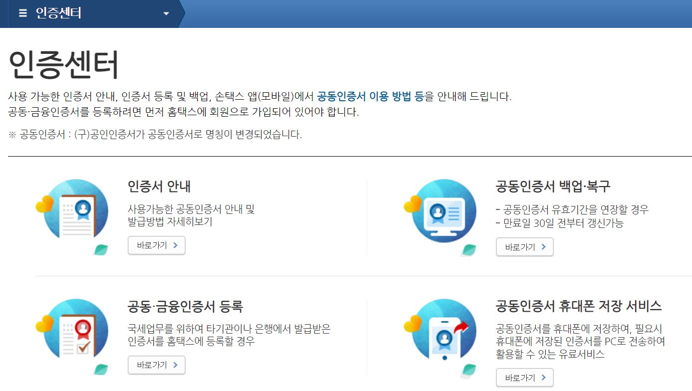 우선 홈택스이 인증센터에서 공동인증서 백업/복구쪽으로 들어갔다.