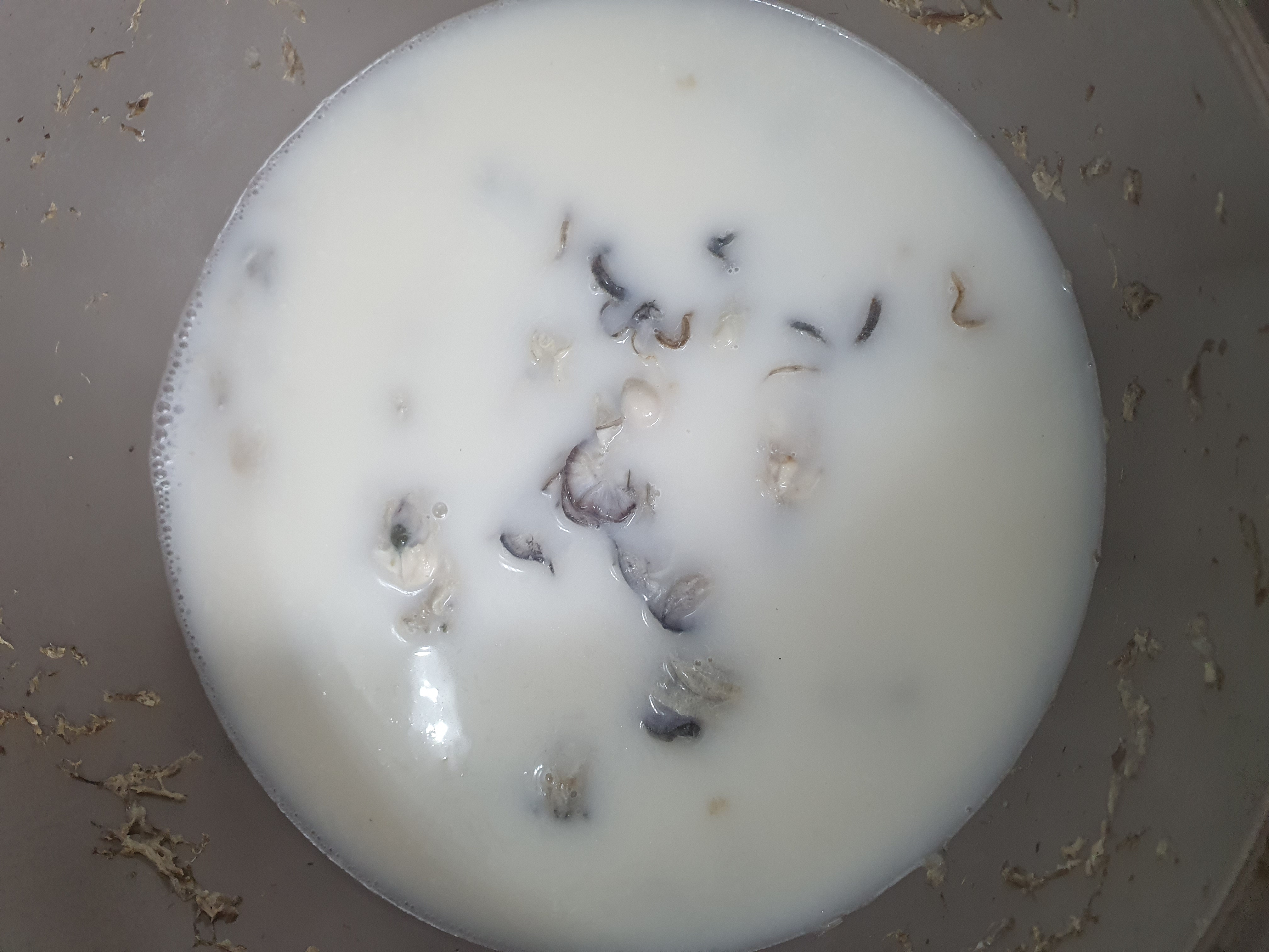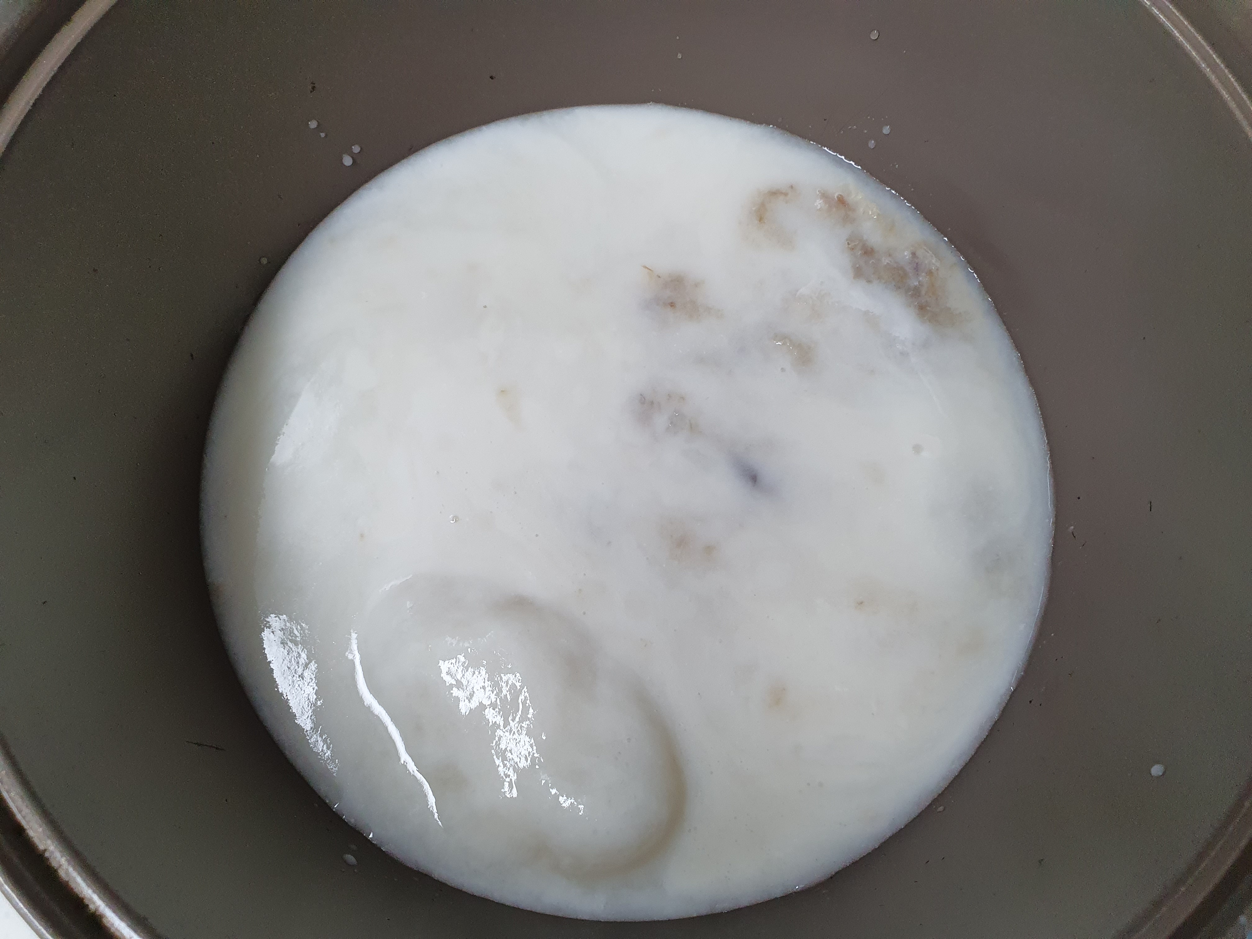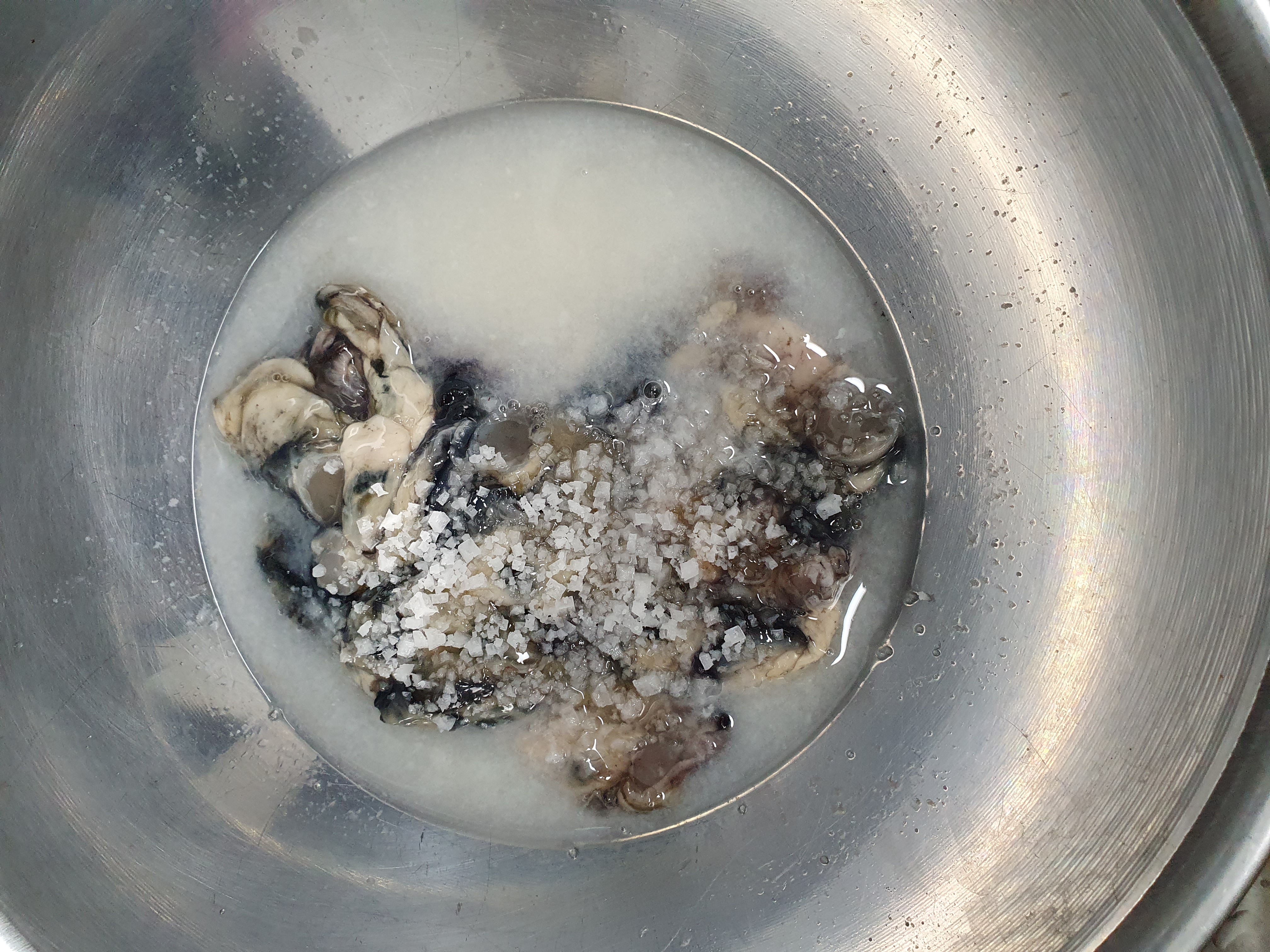 굴떡국을 끓이려고, 굴을 해동시켰습니다. 굴을 깨끗하게 씻기 위해서 굵은 소금으로 여러 번 씻었습니다.