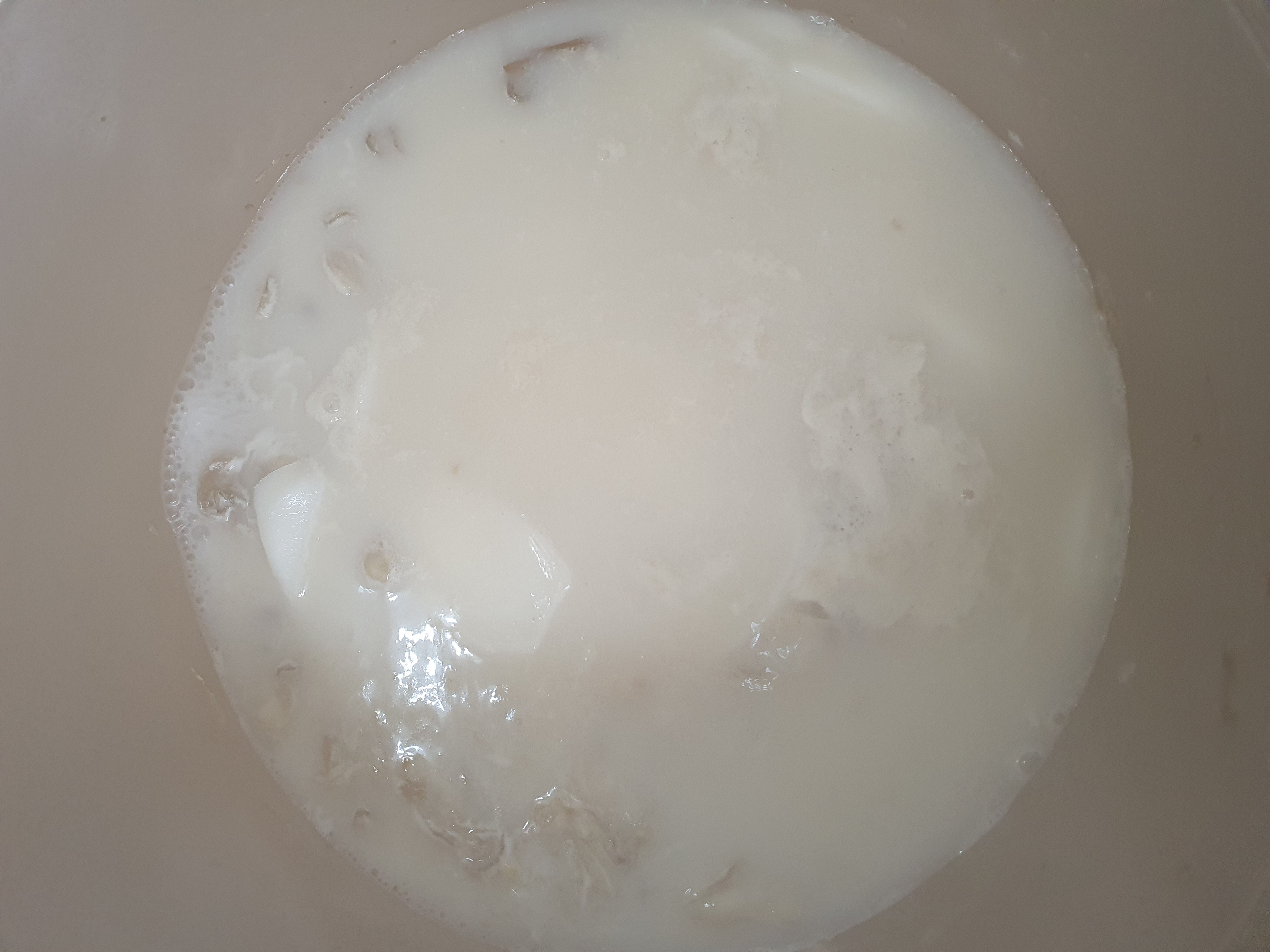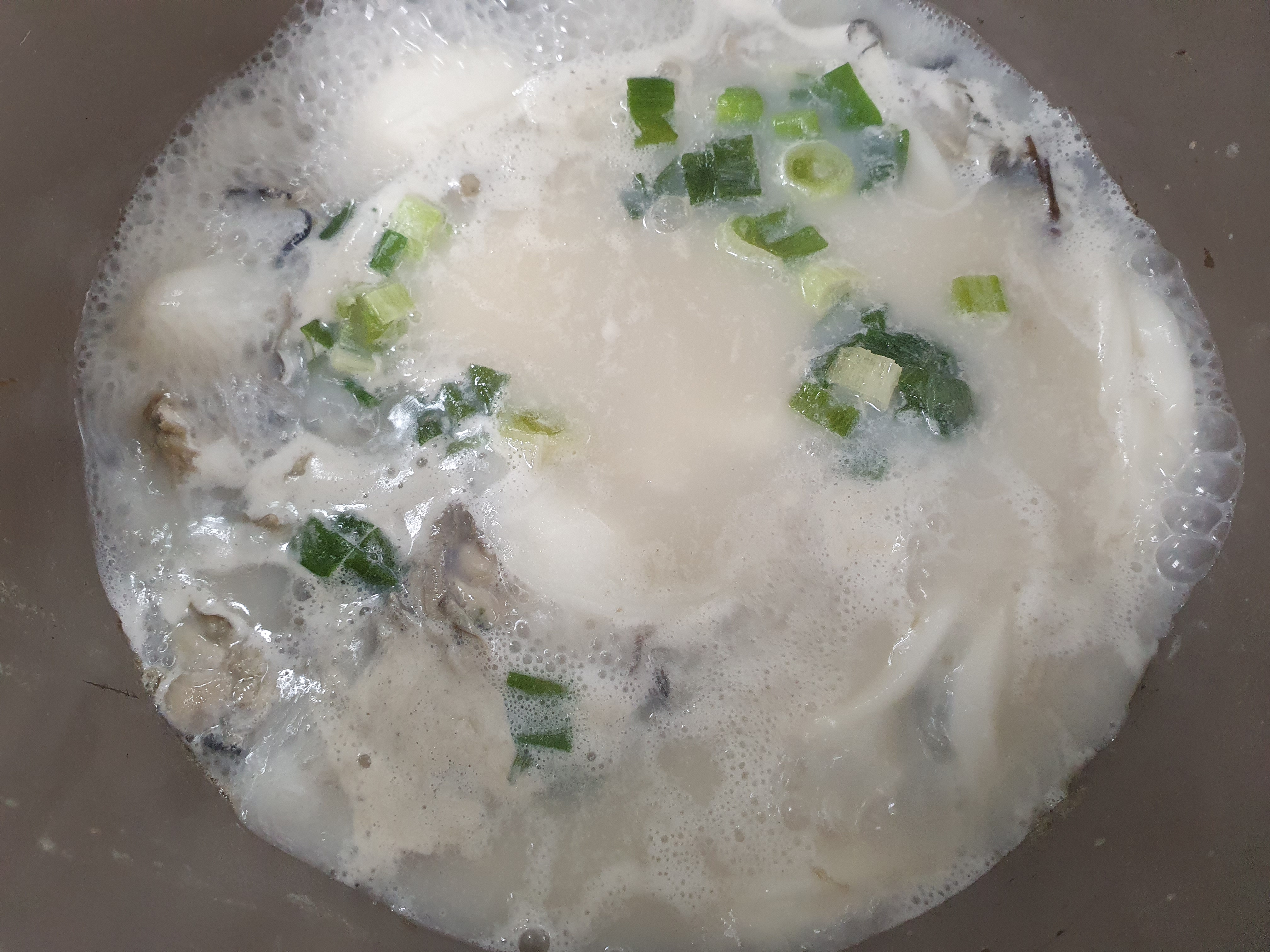 사골국을 한 번 끓인 후 불순물을 걷어 내고, 굴을 넣어 줍니다.