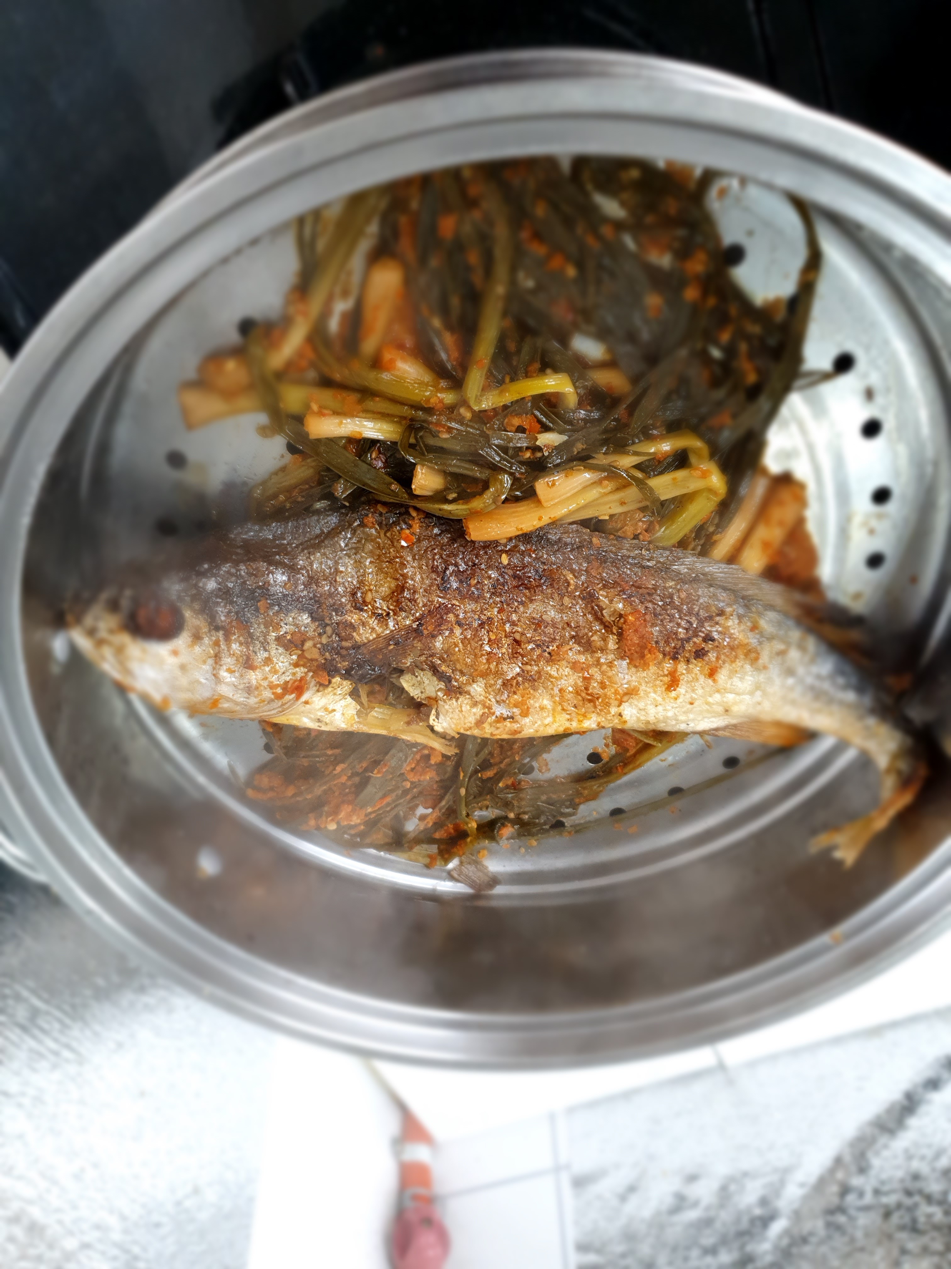 우선 굴비의 비린내를 제거하기 위해서 푹 익은 파김치를 찜기의 바닥에 깔았습니다. 그리고 굴비 한 마리를 중불로 5분씩 해서 30분 동안 찌었습니다.