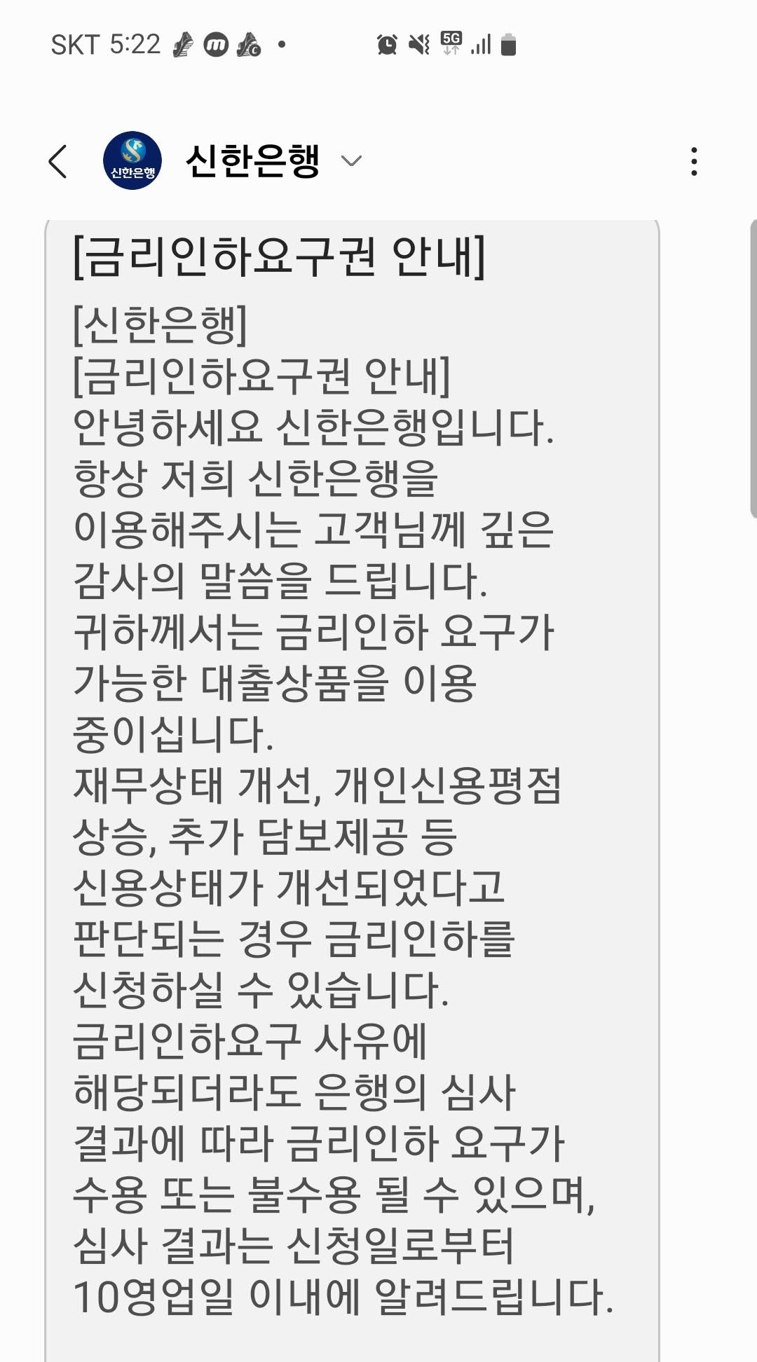 금리인하요구권, 신한은행에서 문자를 받았습니다. 이런 문자를 받으신 구독자님들은 아시겠지만 대출을 받고 있는 사람들한테는 좋은 소식이지요. 전에도 이런 문자를 받고 쏠에서 금리인하를 신청한 적이 있어서 이번에도 휴대폰을 통해서 신청을 해보려고 합니다.
