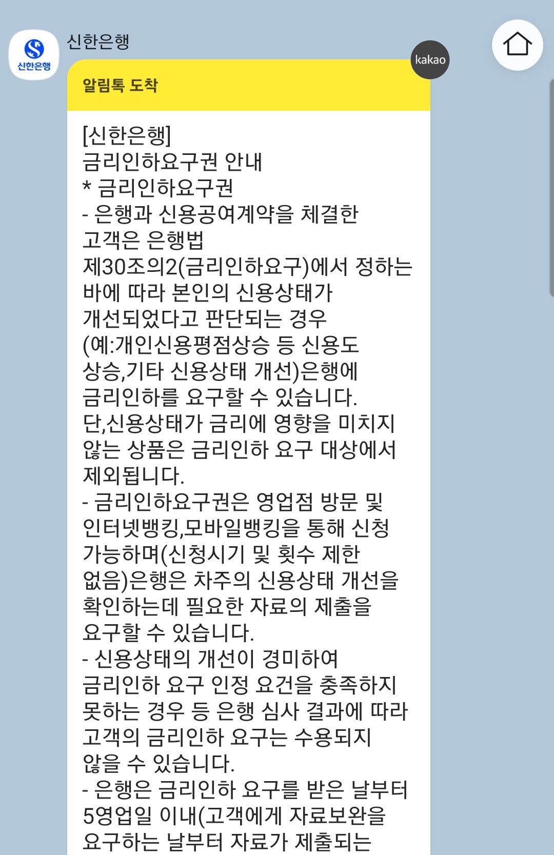 이번에도 주거래은행인 신한은행으로부터 금리인하 요구권 카톡을 받았습니다.