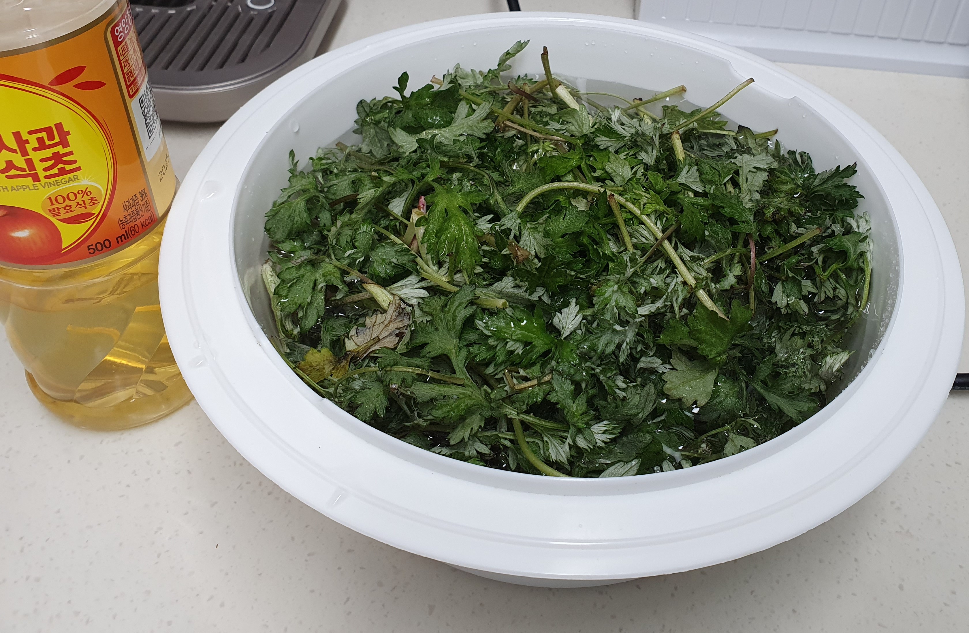 쑥을 물에 30분간 담가둘 때, 식초 몇 방울을 떨어뜨려 줍니다. 나중에 쑥에 붙어 있던 불순물을 제거하기 위함이죠.