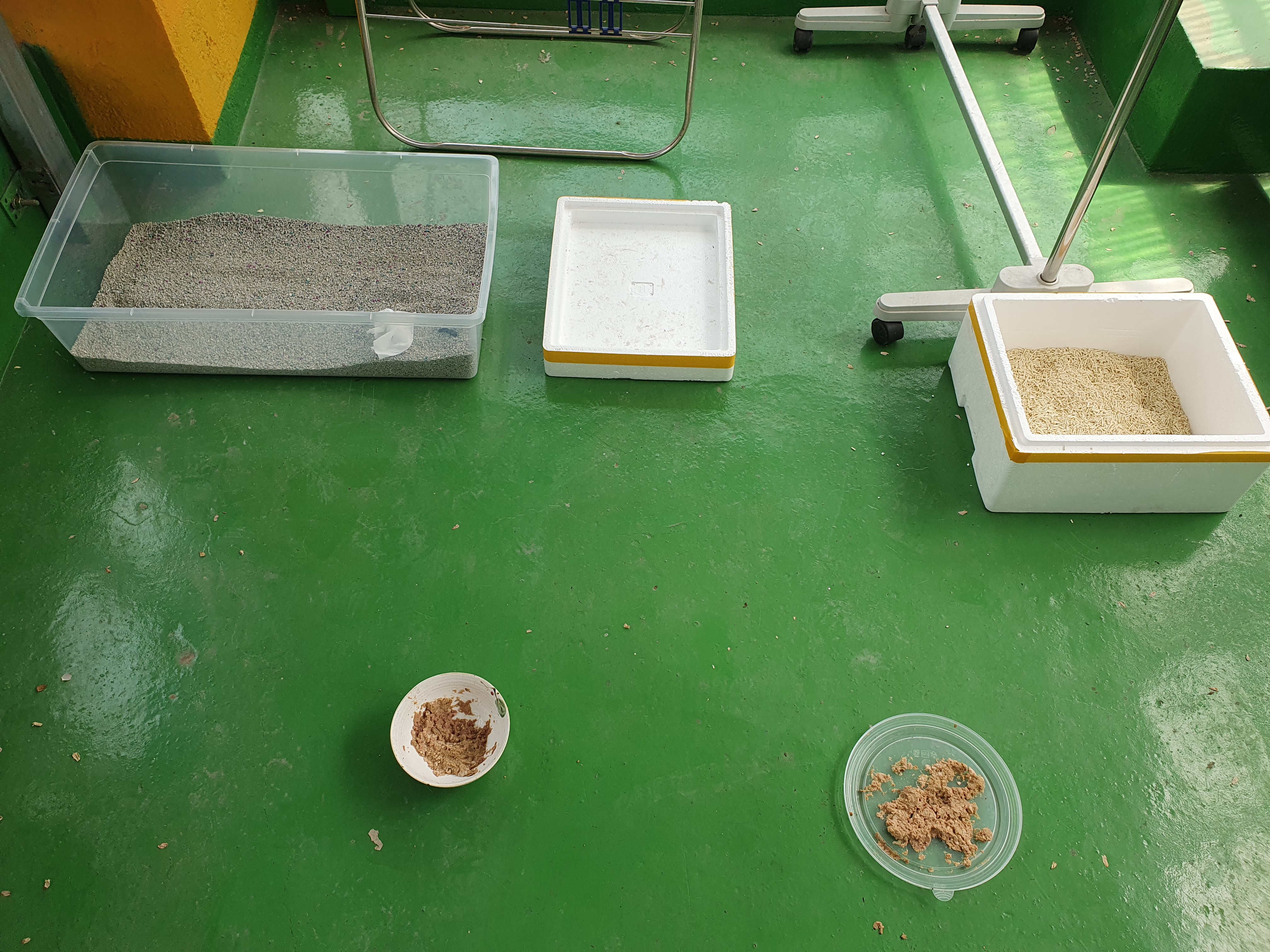 야옹이들 화장실은 스티로폼에 앉아 있는 걸 좋아하길래, 스티로폼에 두부모래를 넣어 놨습니다.