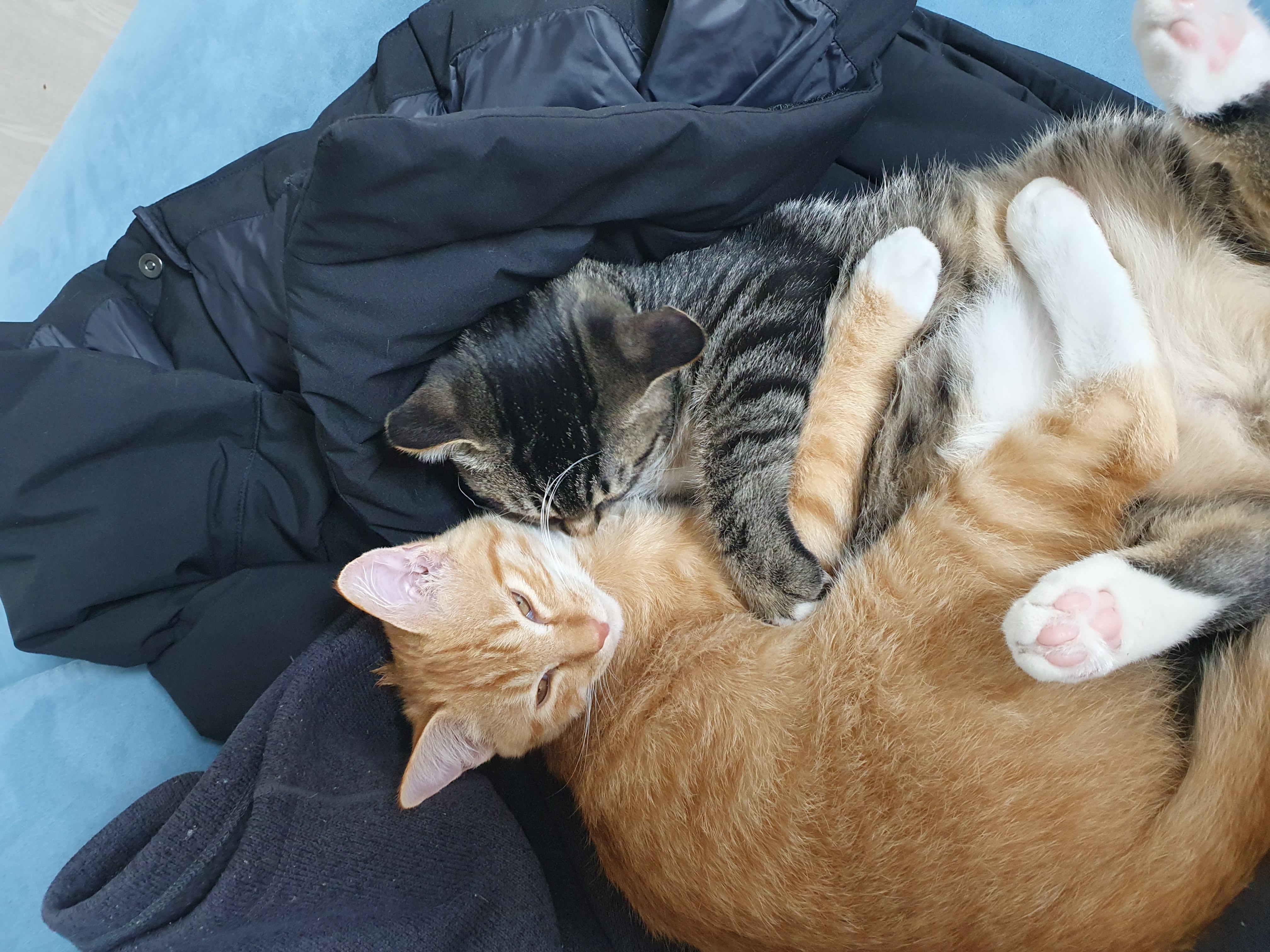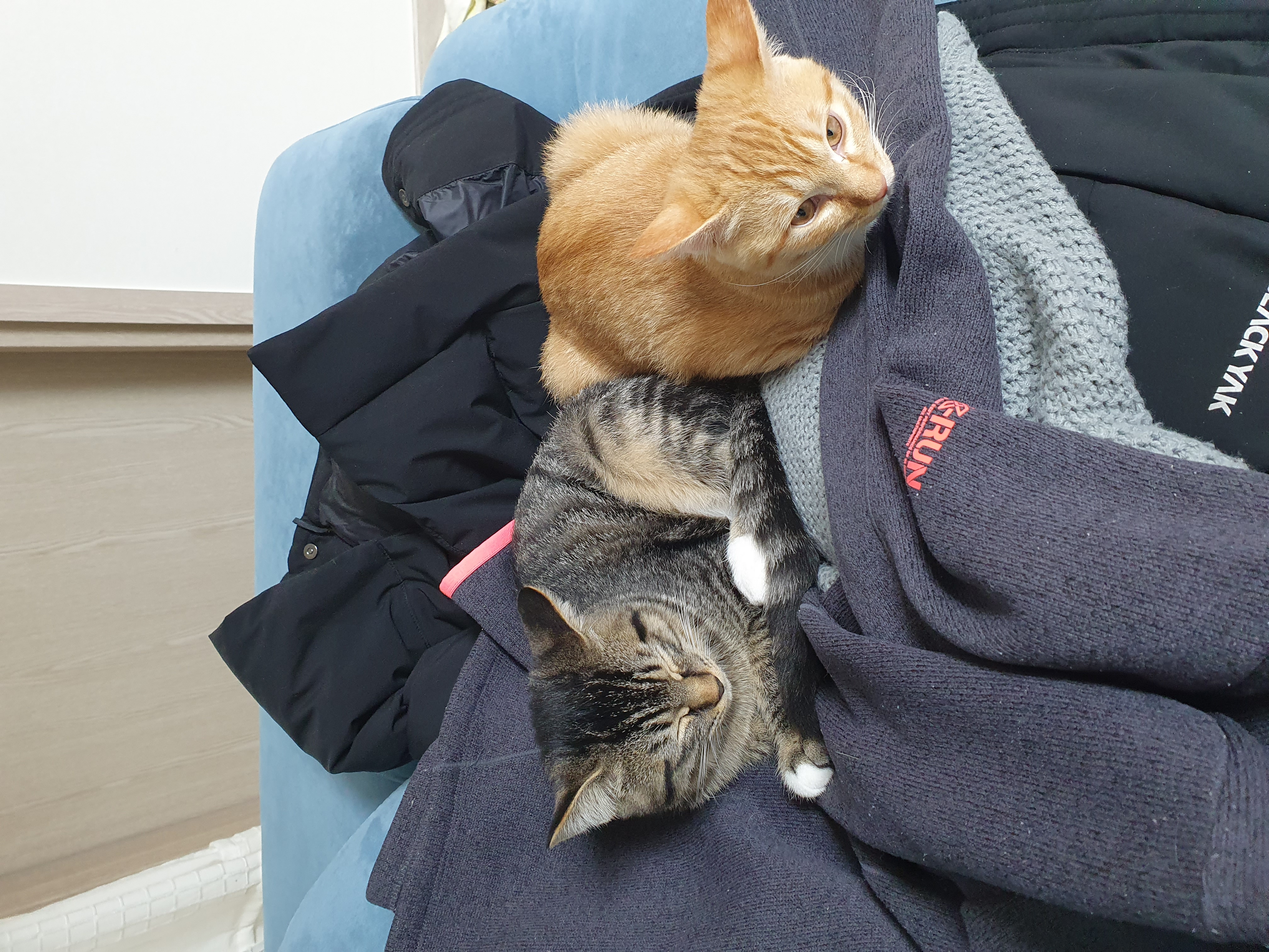 엄마 나가기 못하게 패딩 위에서 자고 있네요. 저는 김장하러 가고, 고양이형제들은 오늘도 낮잠모드입니다.