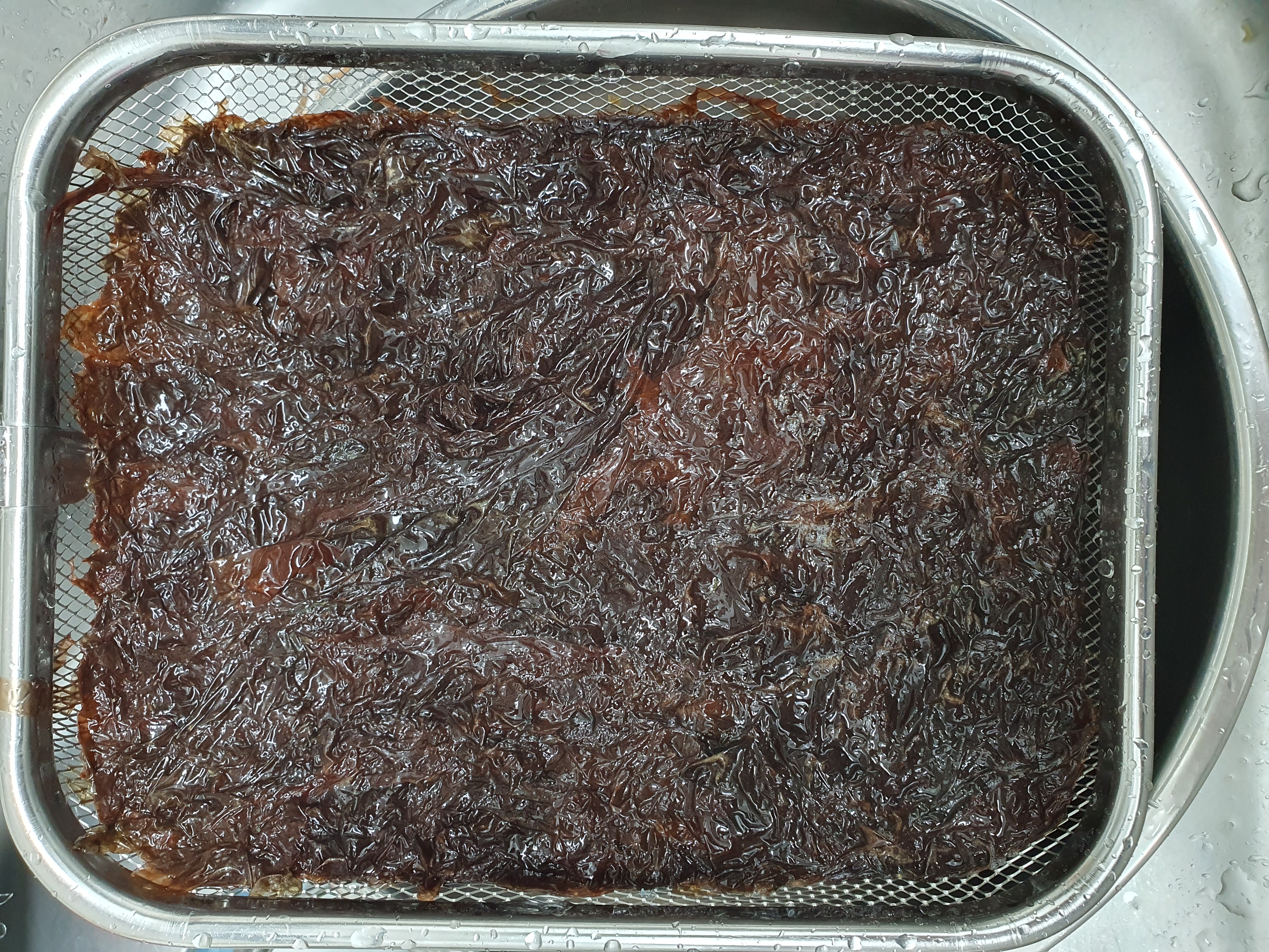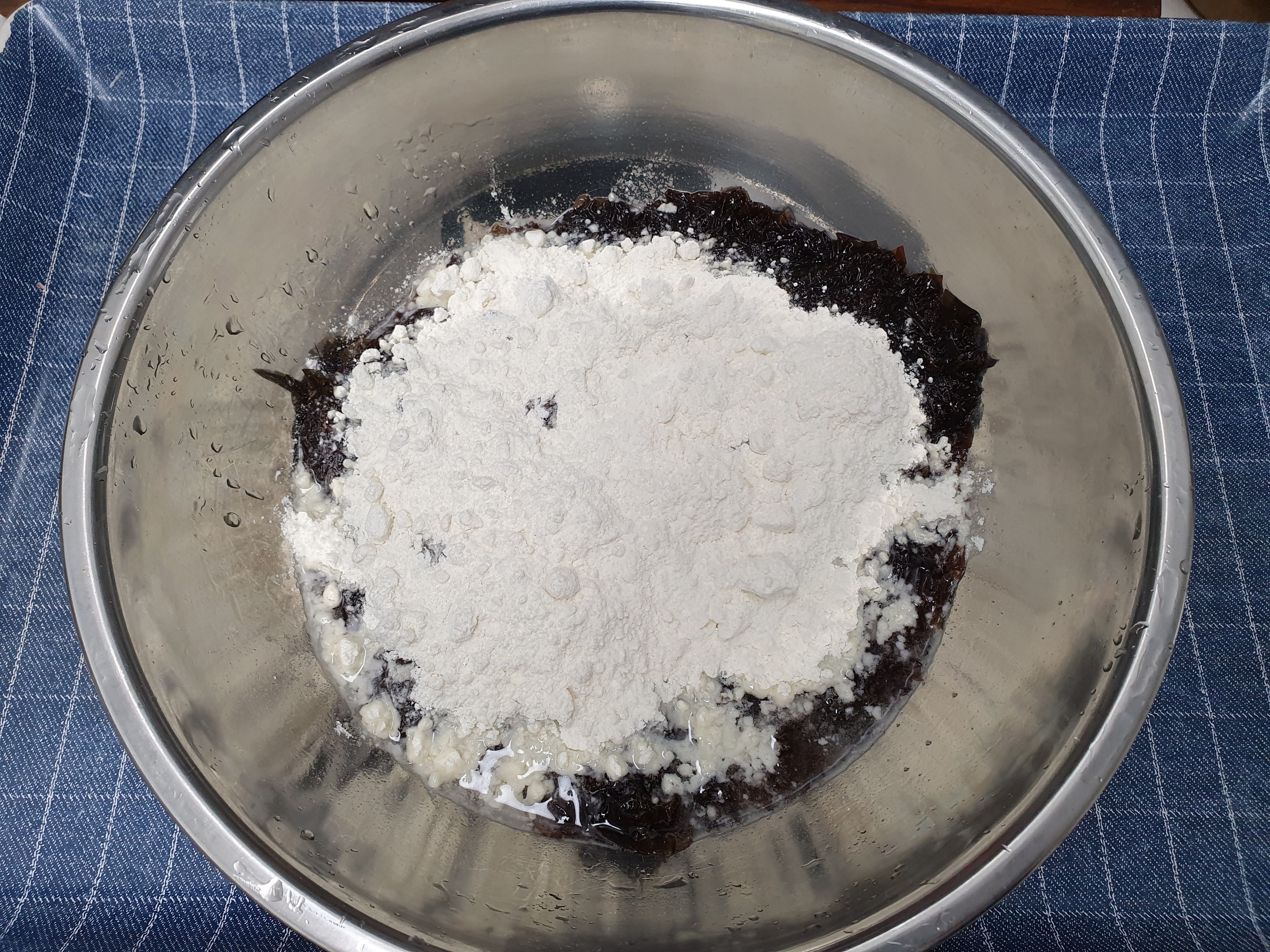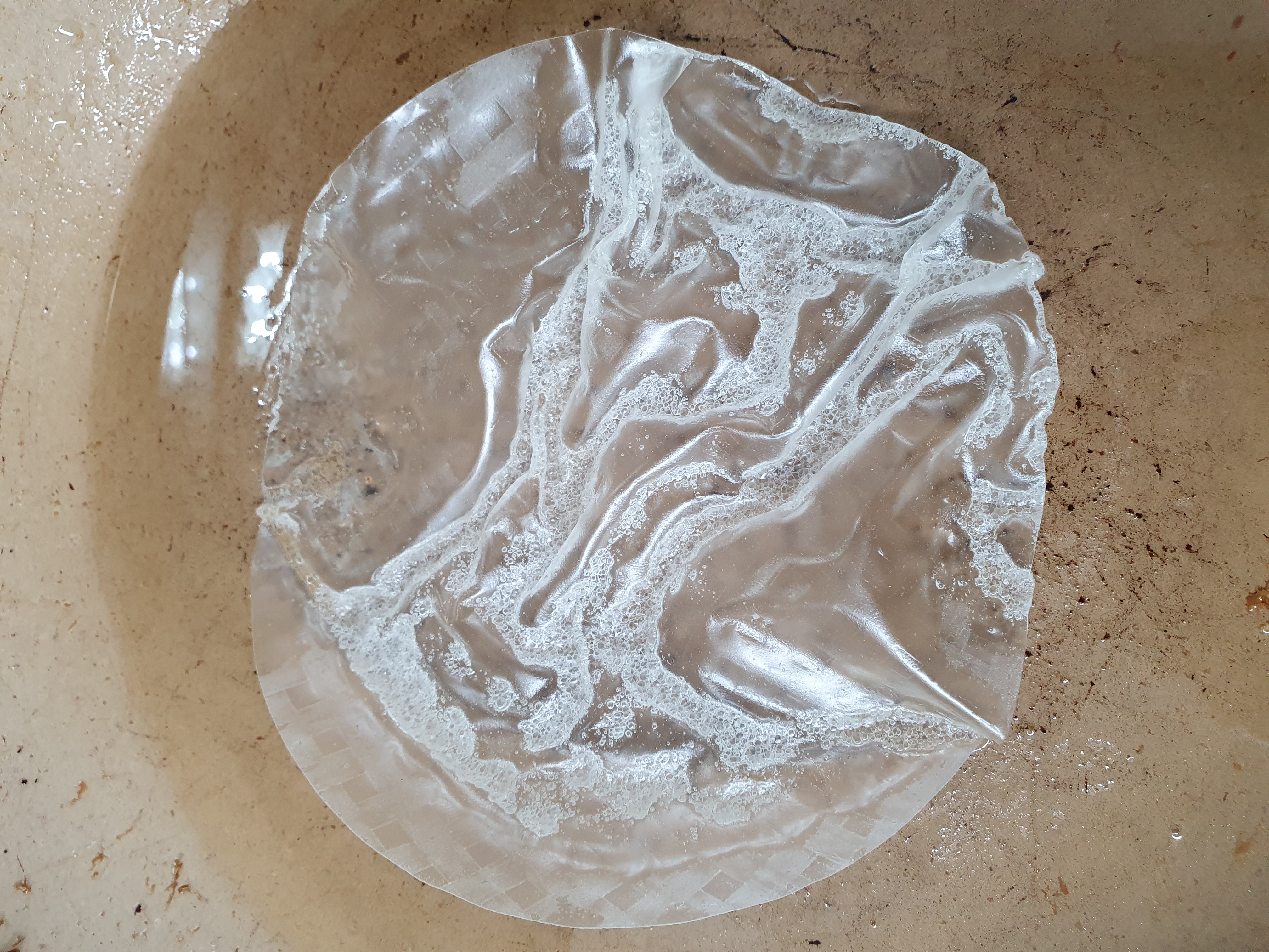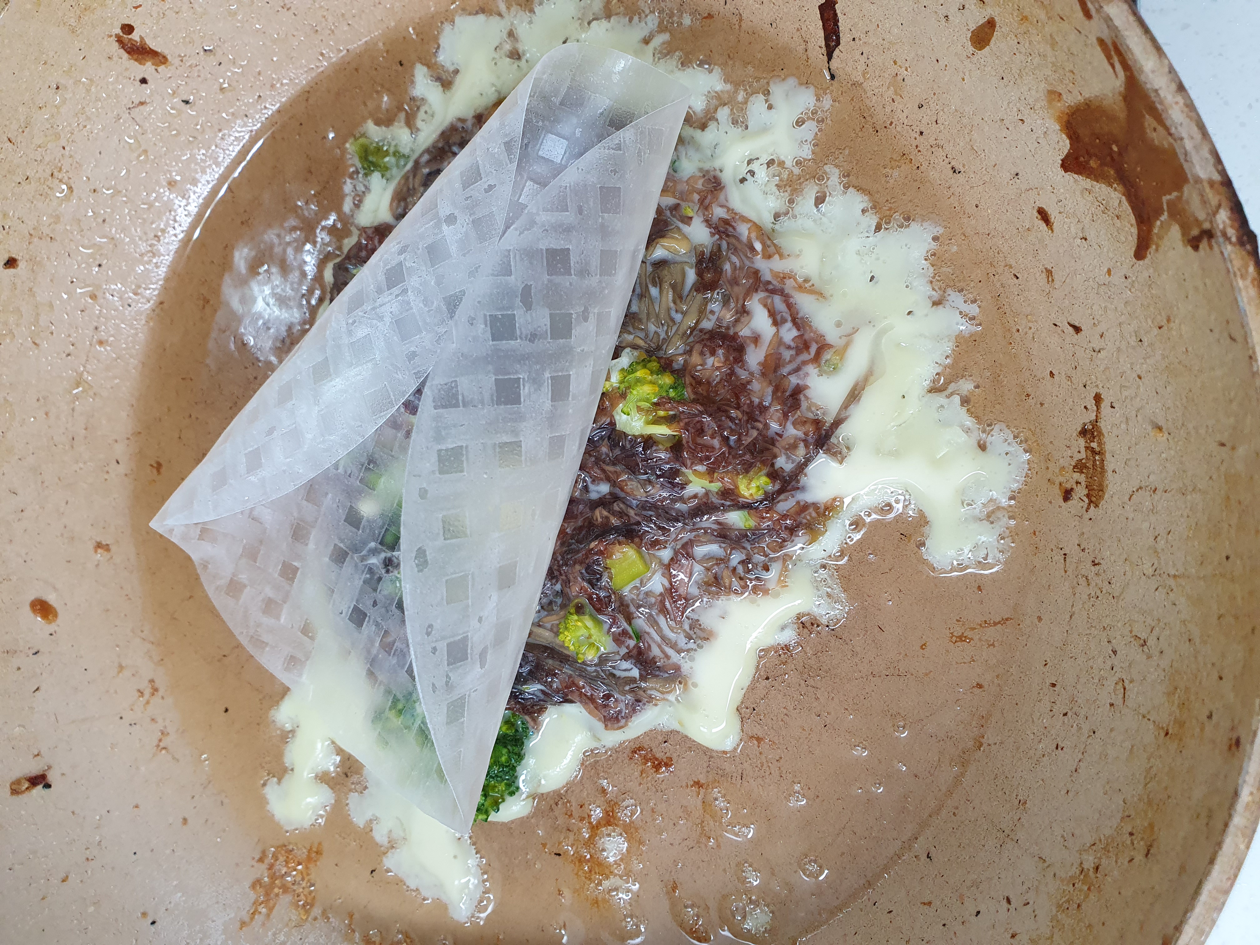 반죽에서 물이 많이 나와서 전 앞뒤로 라이스페이퍼를 깔아 봅니다.