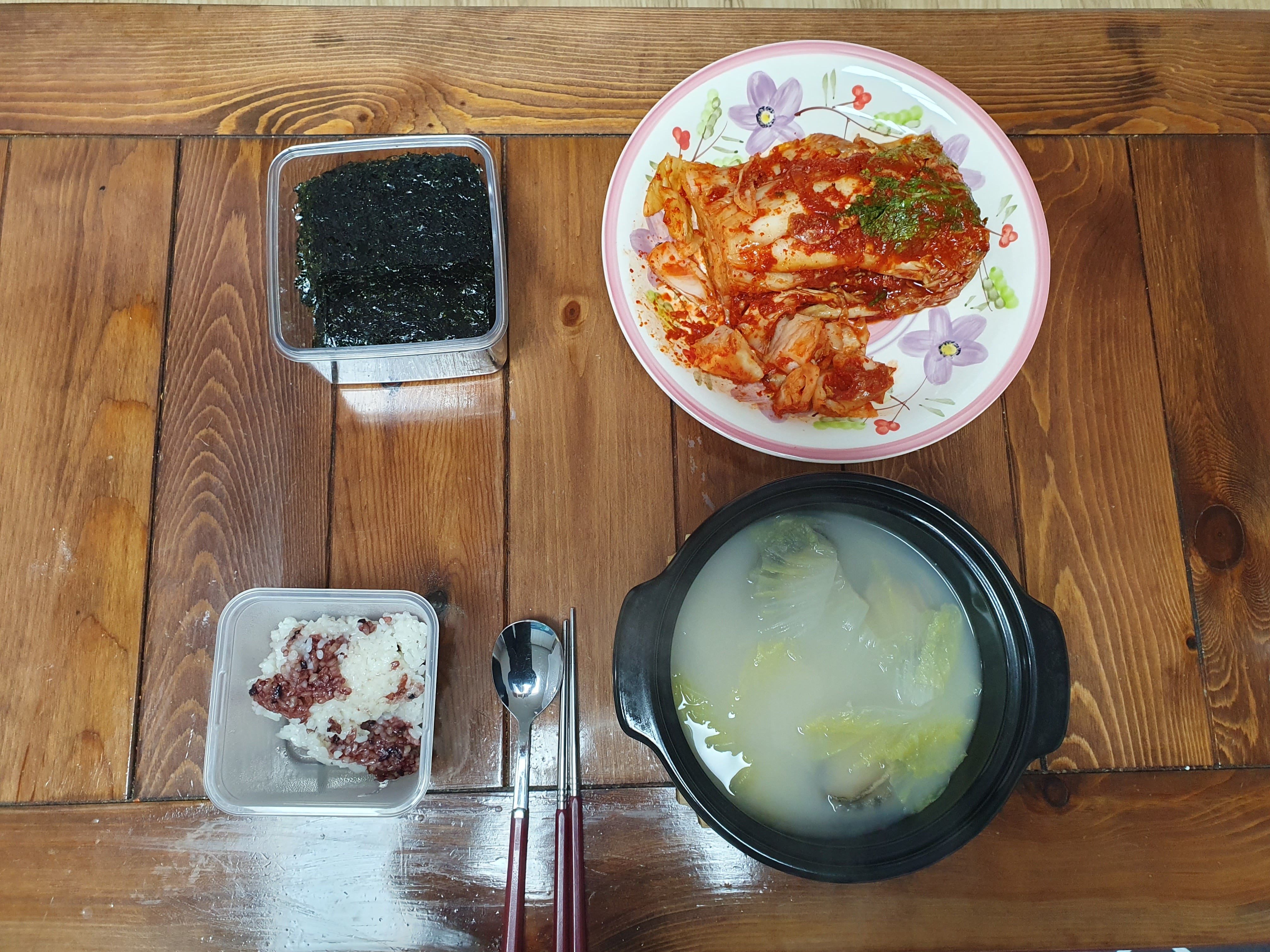 평소에 자주 먹는 사골곰탕에 전복 세 마리 투척! 지난주에 한 김장과 햇김에 검은쌀 섞은 밥에 오늘 아침도 잘 먹었습니다.