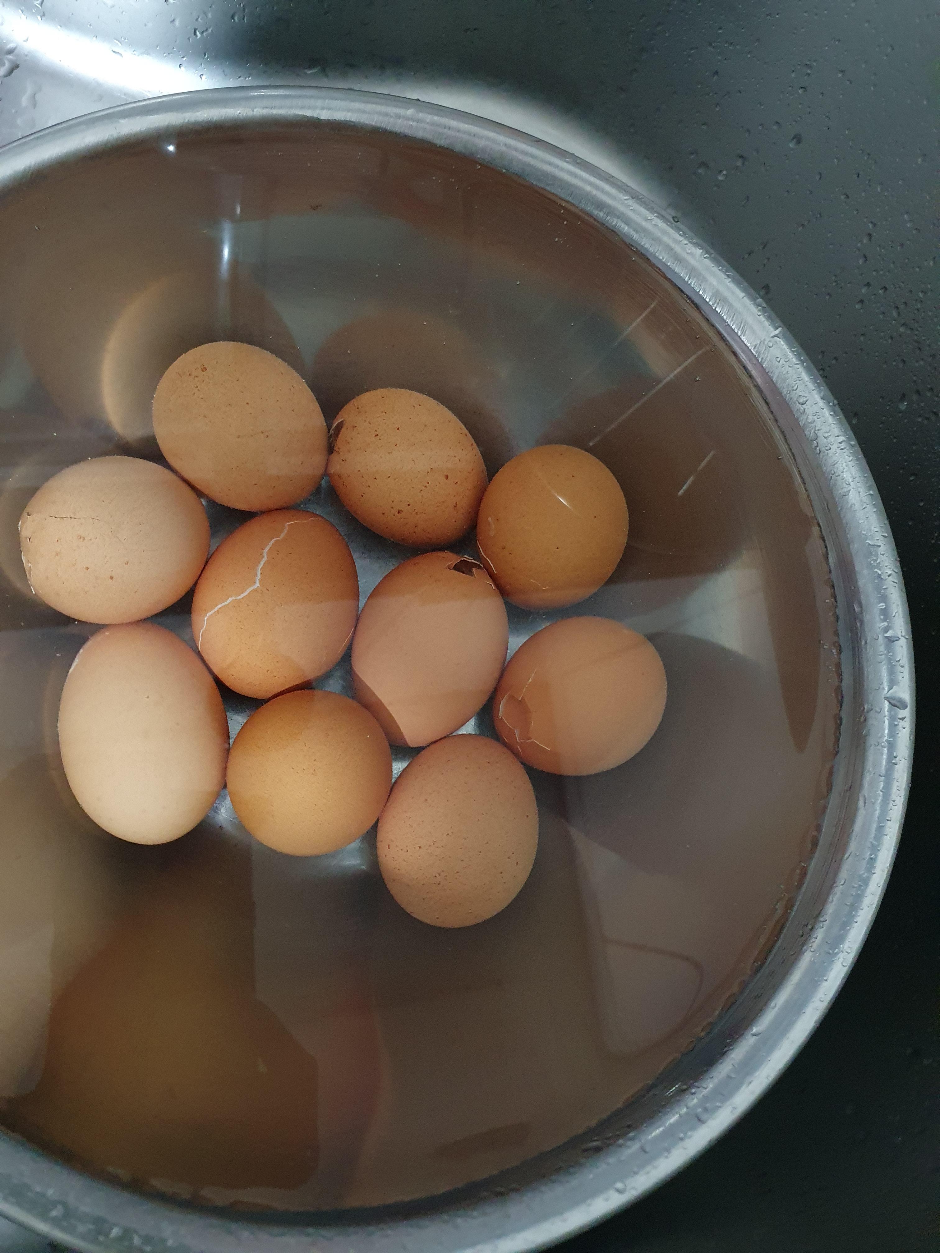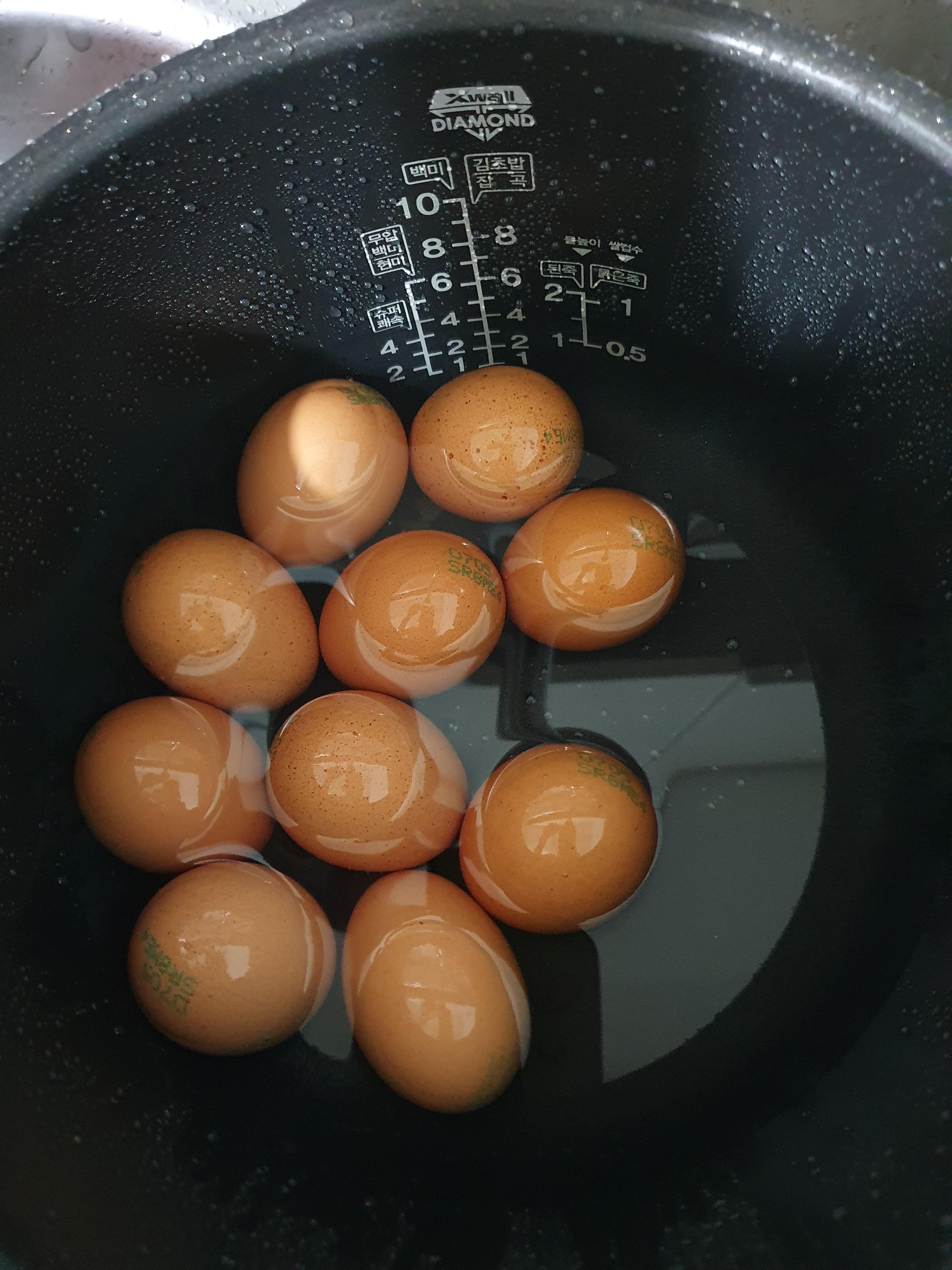 먼저 달걀 10개를 압력밥솥으로 삶아 줍니다. 너무 더워서 될 수 있으면 집안에 열기가 없게 하려고 가스레인지보다는 압력밥솥 찜기능을 이용했습니다. 달걀 삶을 때, 찜기능은 30분 정도로 했습니다.
