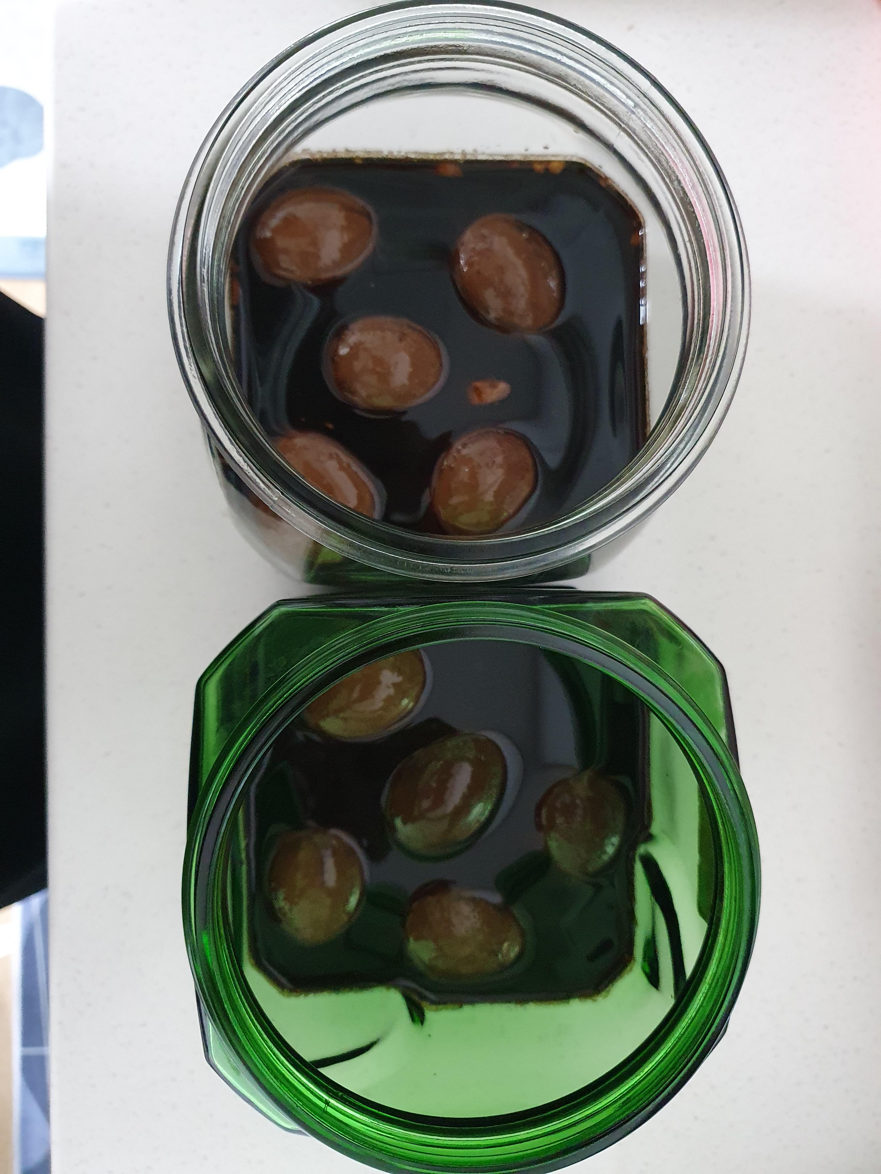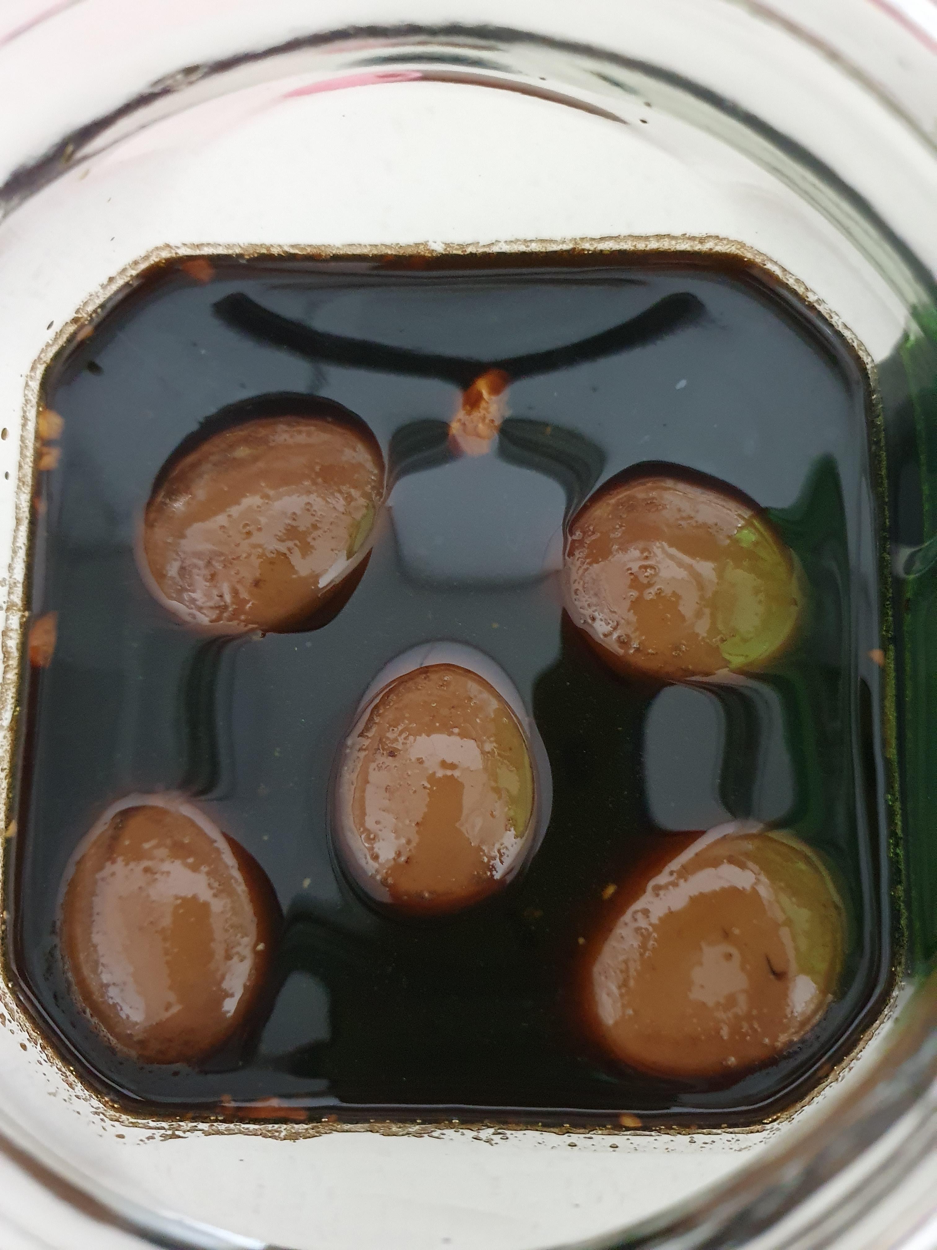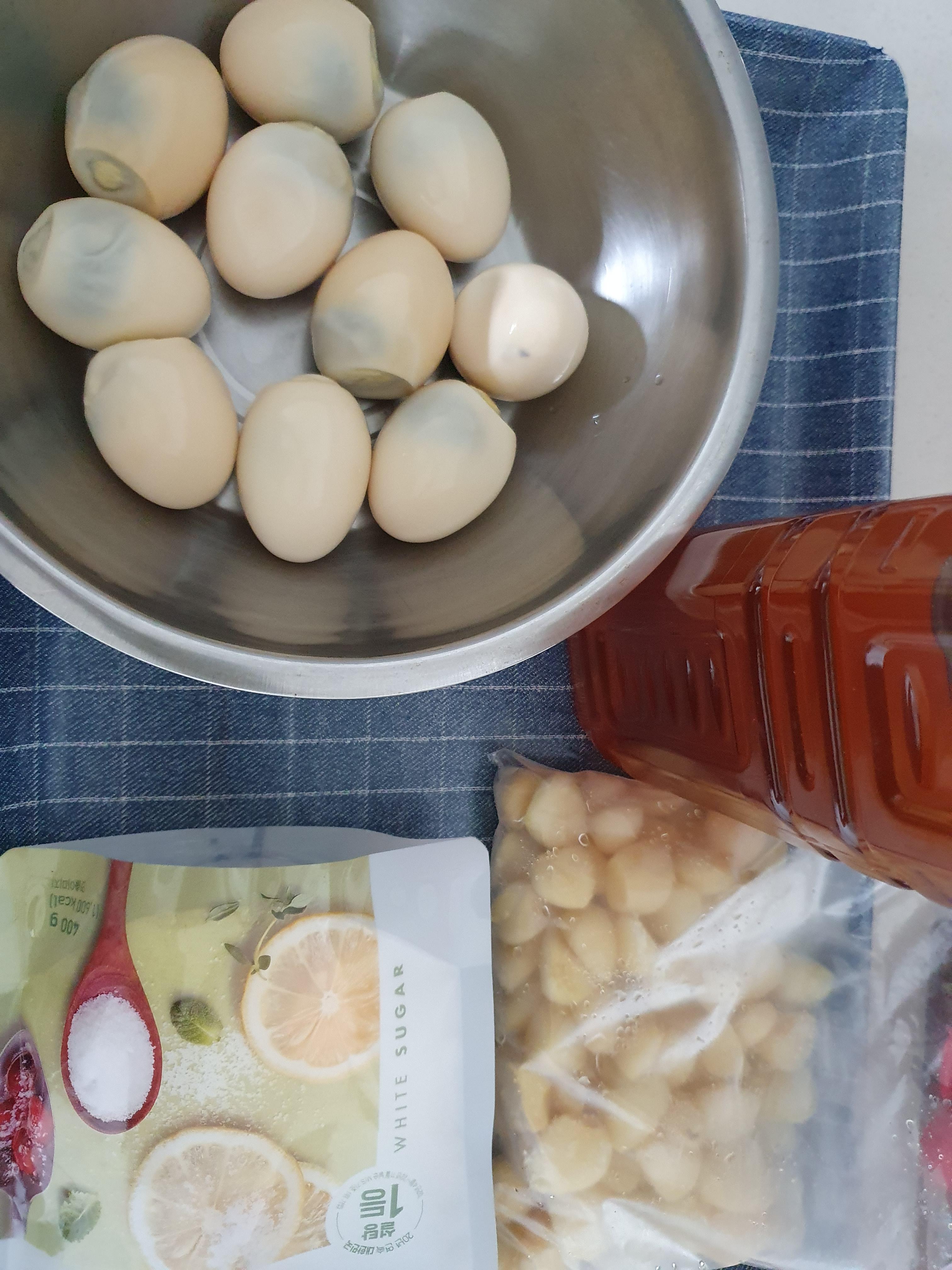간장에 들어갈 재료는 삶은 달걀, 통마늘, 설탕, 매실액을 준비하고