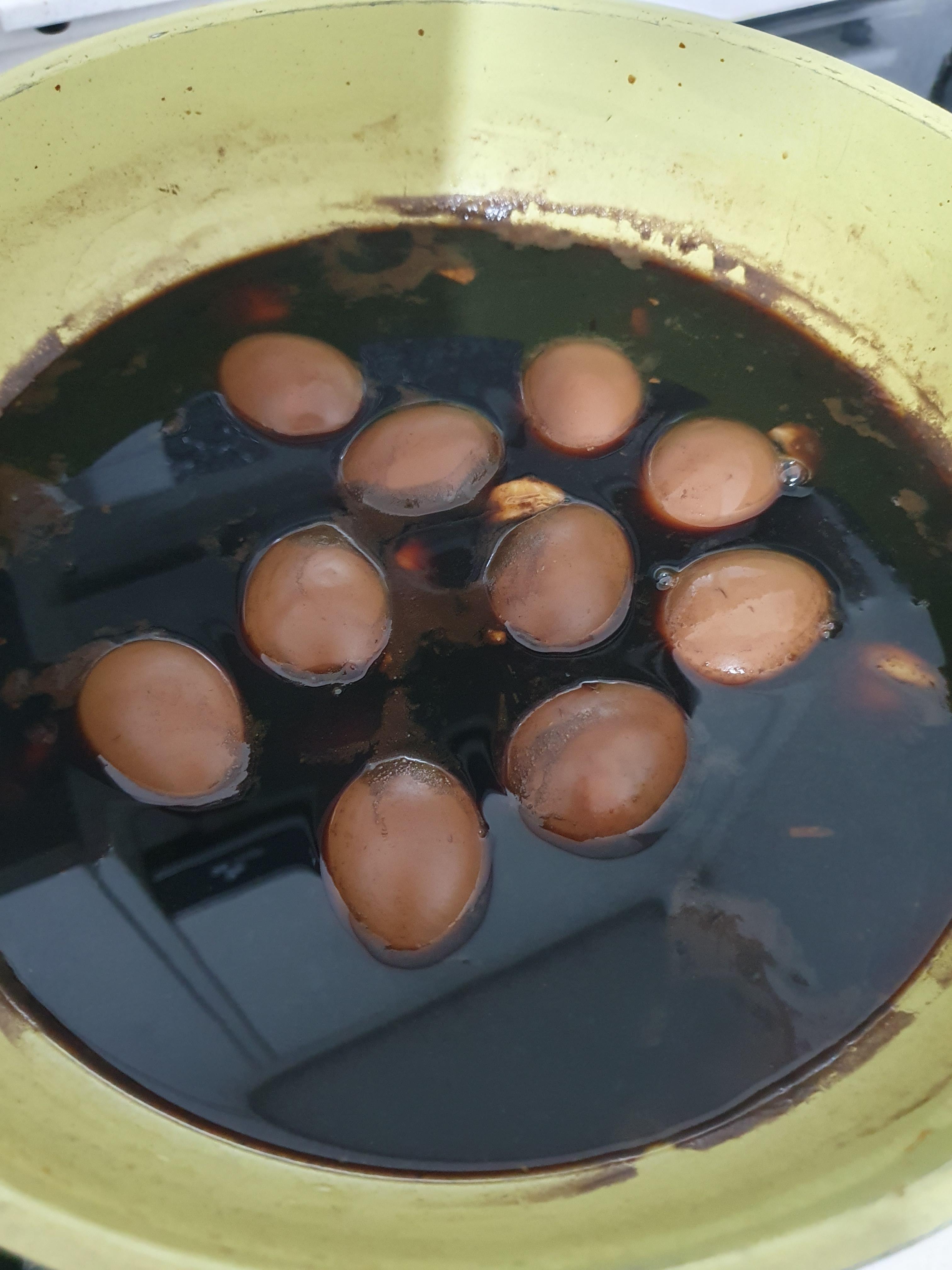 다 만들어진 간장조림은 식히기 위해서 우선은 웍에 담아 놓았습니다.