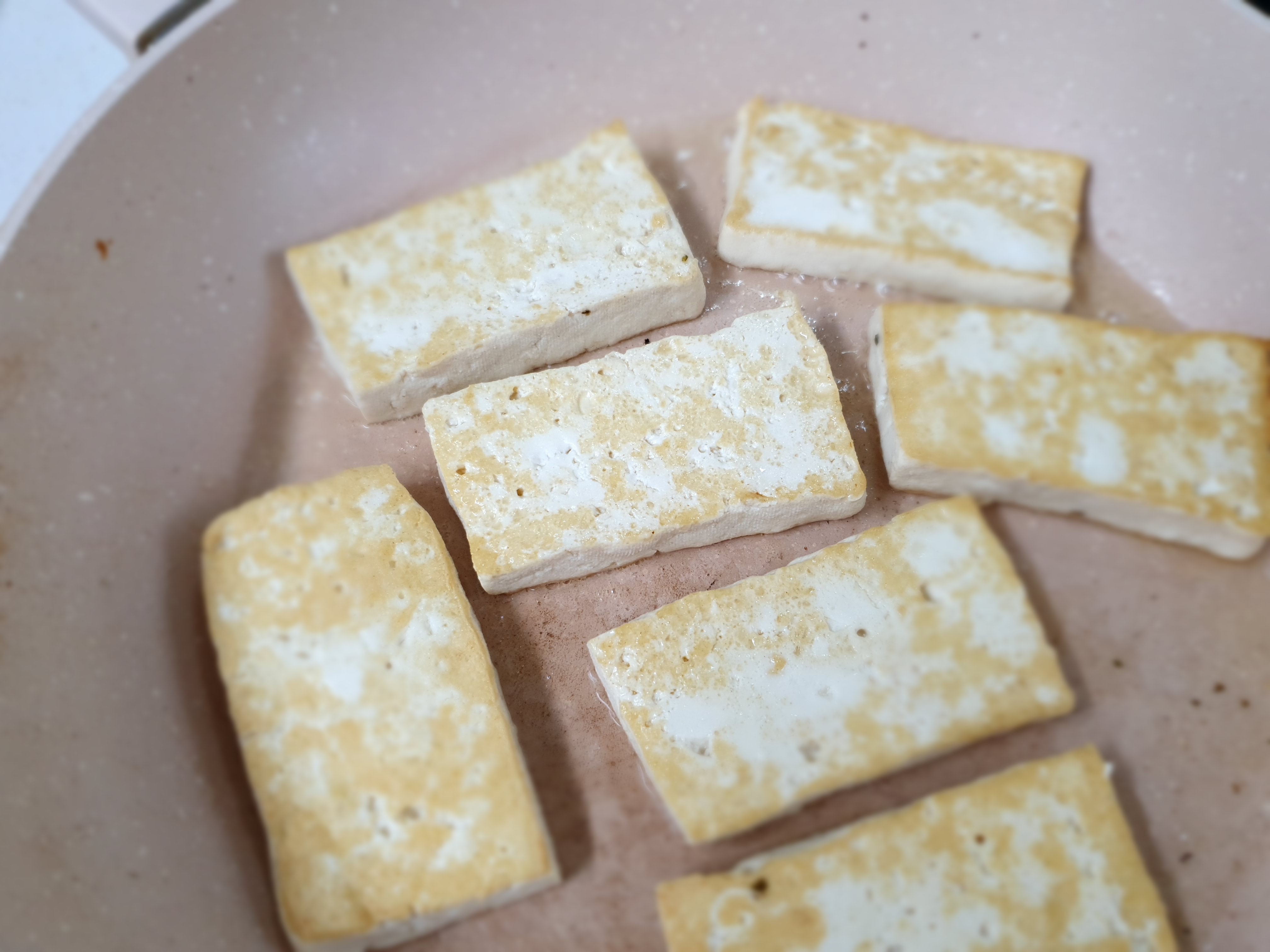 프라이팬 맨 위의 두부는 조금 딱딱해졌습니다. 시간이 더 있었다면 좀더 단단하게 부쳤을 텐데 아쉽습니다.