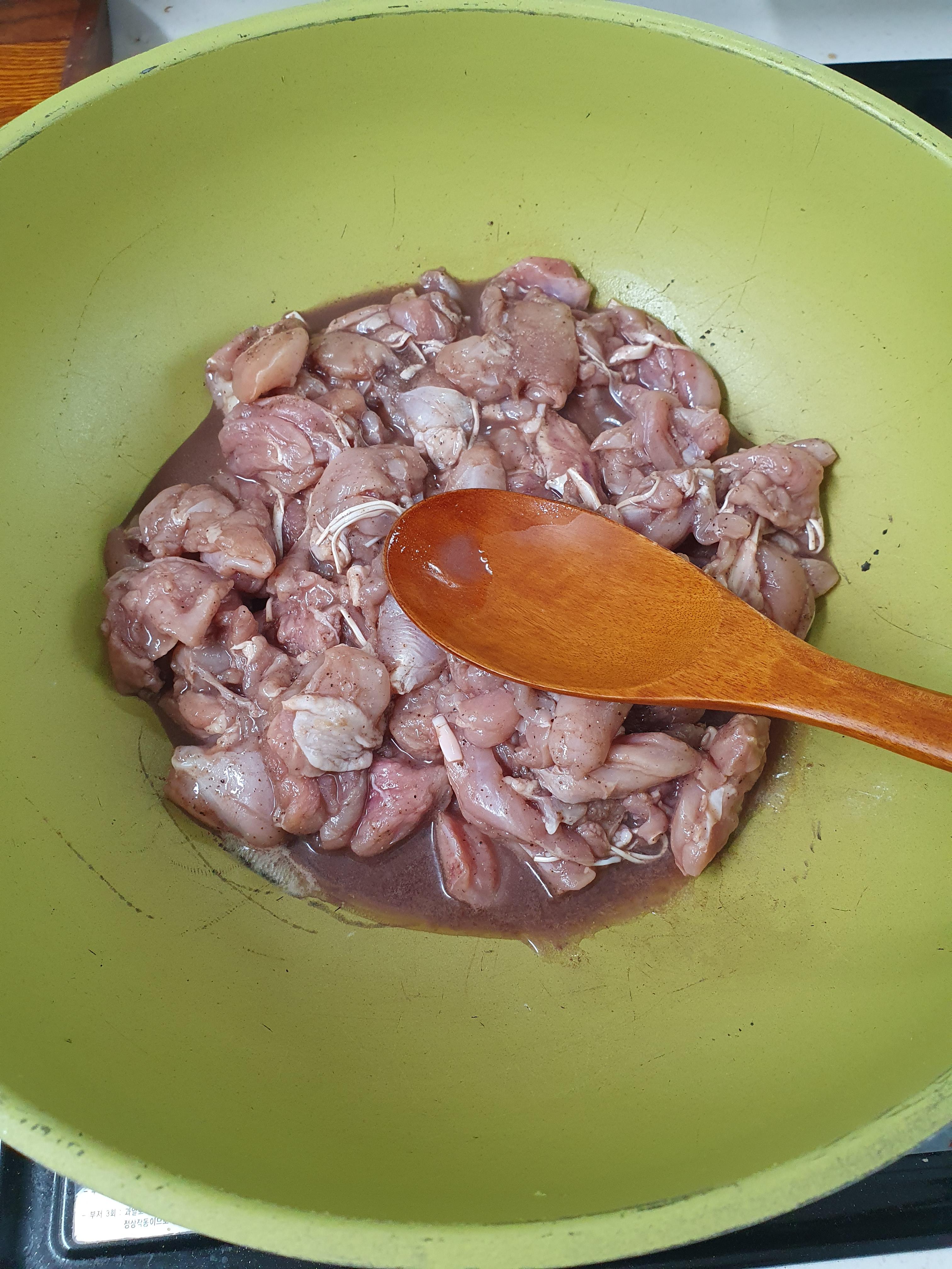 웍에 재어 놓은 닭다리살을 넣고, 가스레인지 불을 중간불로 켜 줍니다.