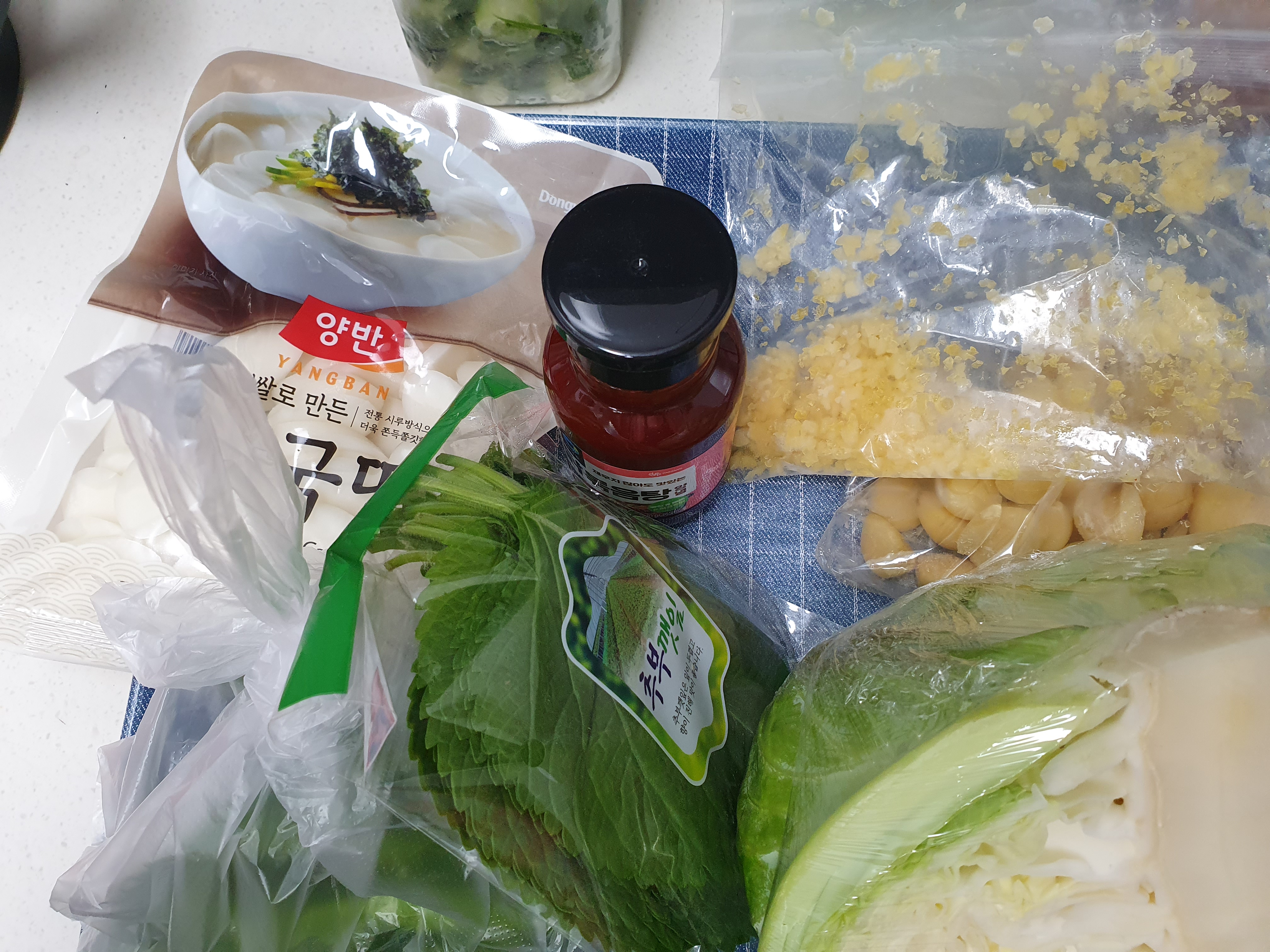 양배추, 깻잎, 떡국떡, 마늘, 고추장, 후추, 소금, 설탕, 매실액, 포도주, 청양고추, 파 재료를 준비해 줍니다.