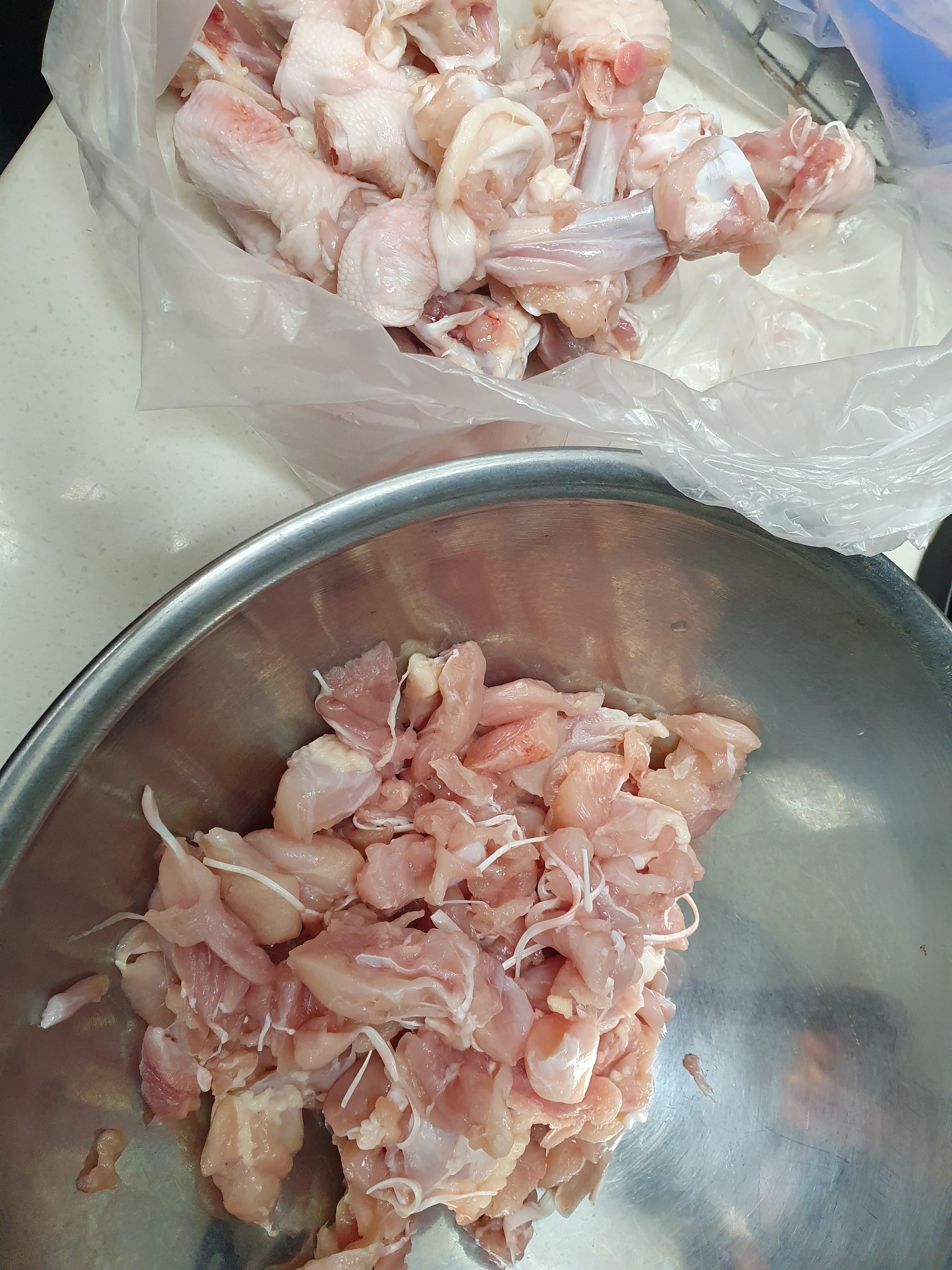 닭다리는 살을 뼈에서 분리해 줍니다.