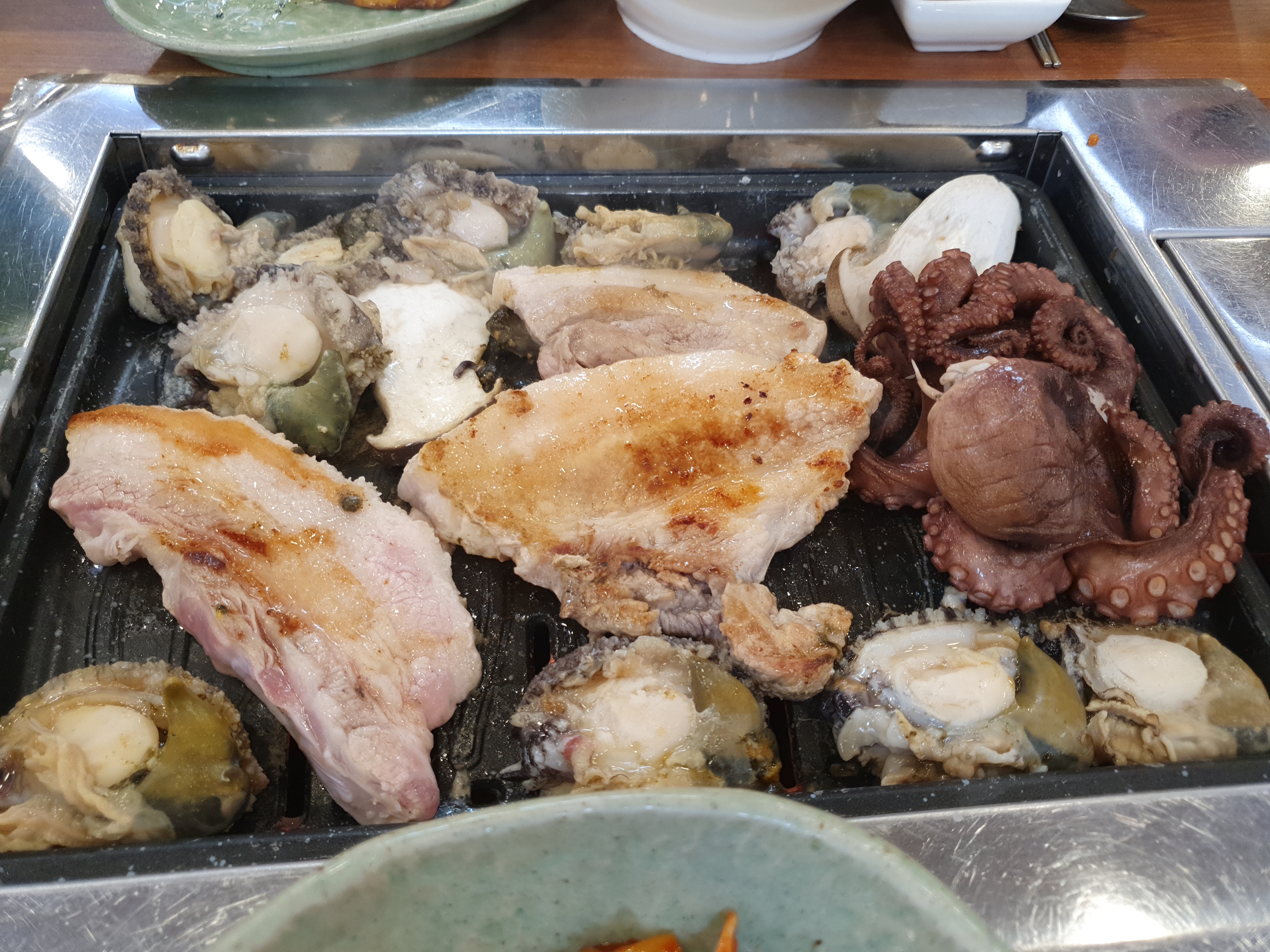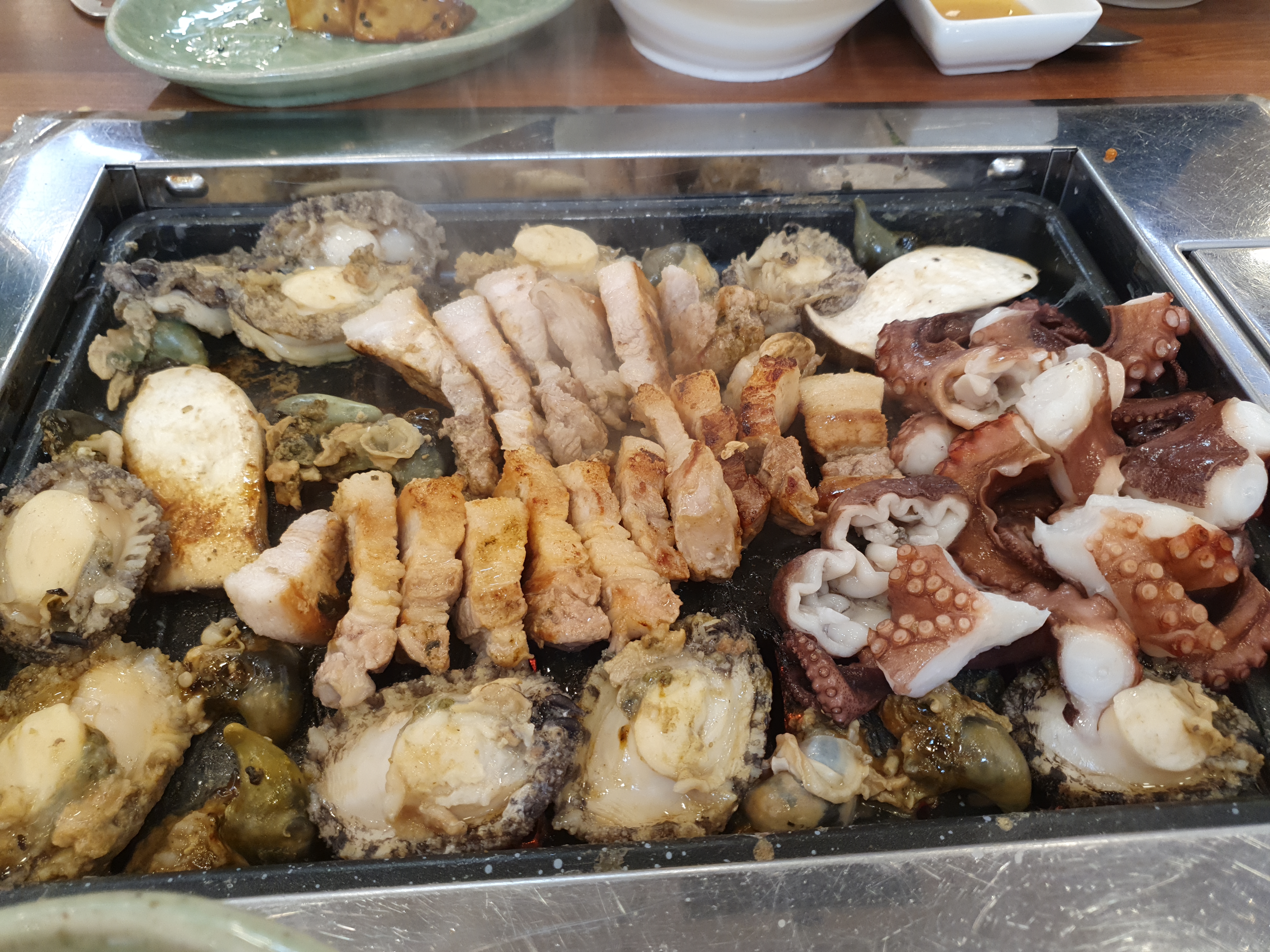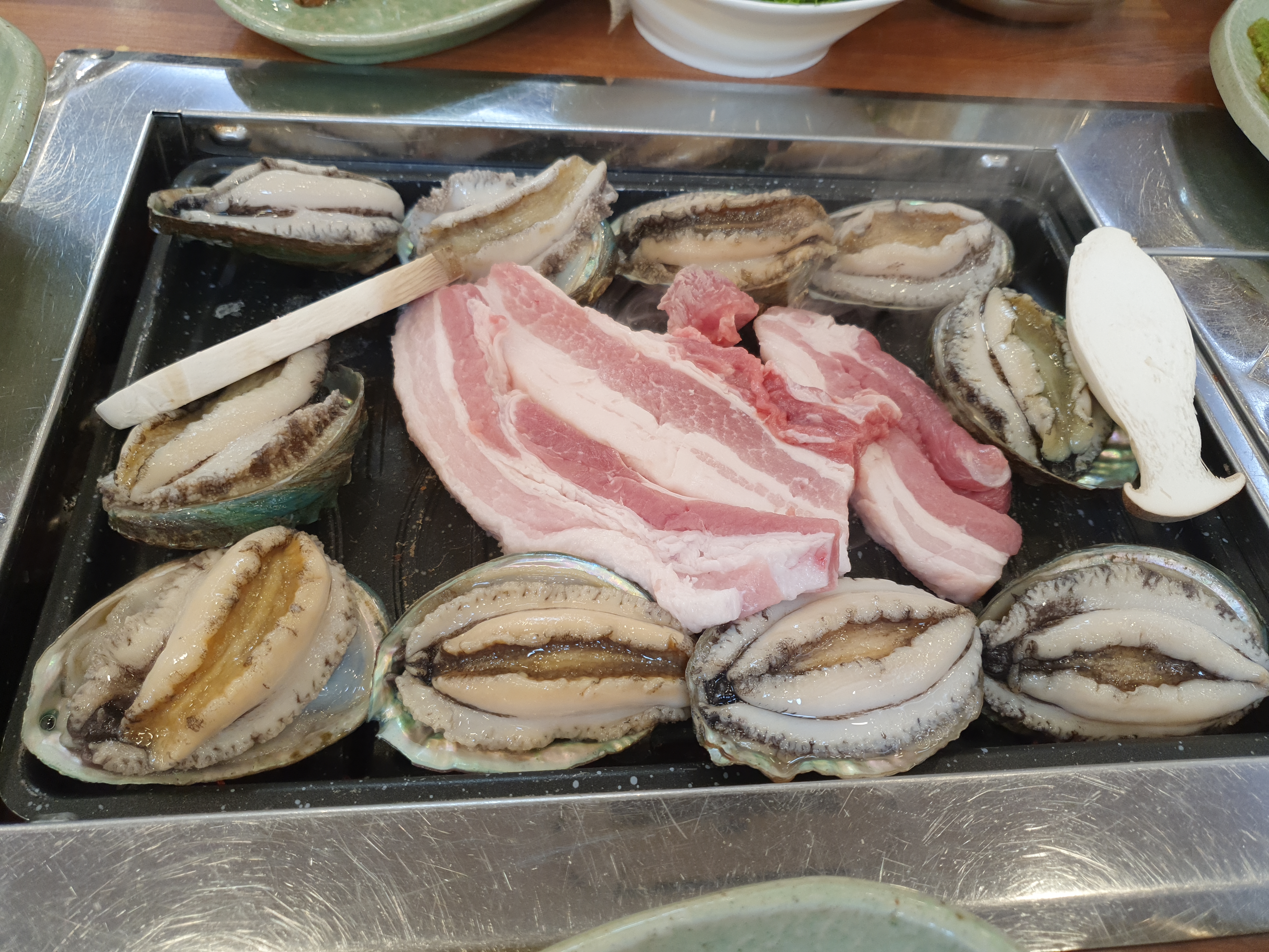 전복을 다 올린 후 안쪽에 삼겹살을 넣어 주네요.