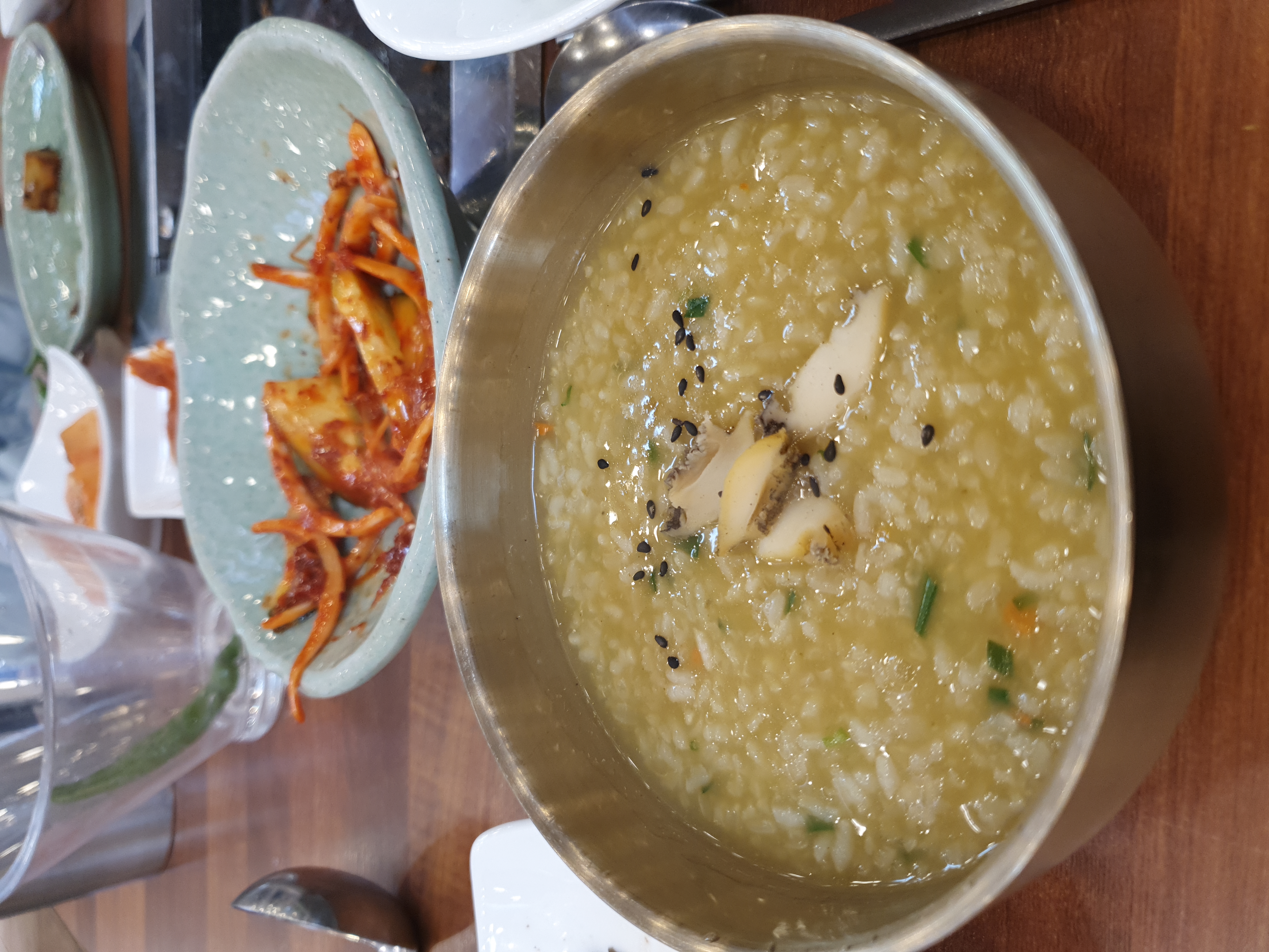 전복죽은 구리그릇에 담겨 있어서 먹음직스러웠습니다. 담백하기도 하고 전복불맛이 나는 거 같기도 했습니다.