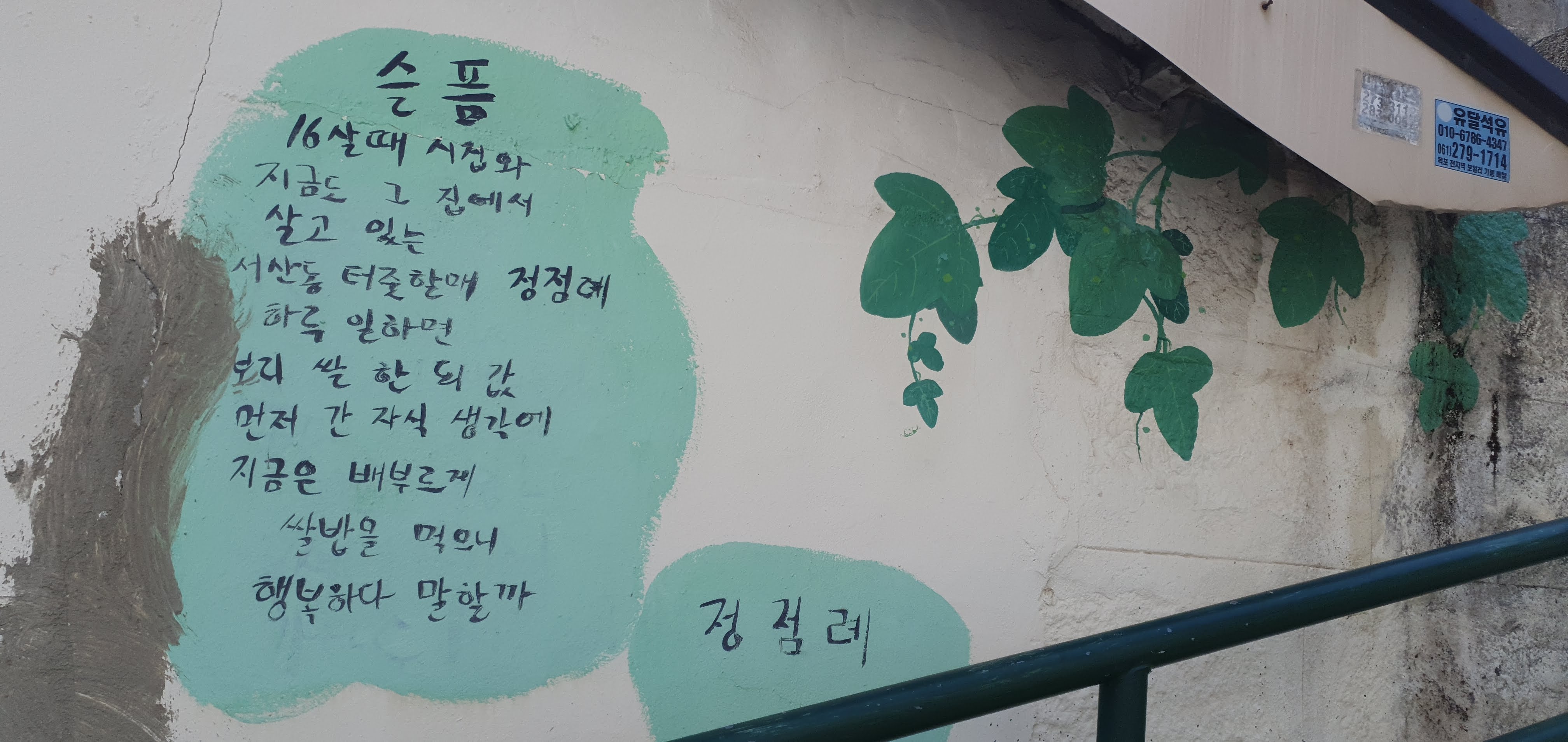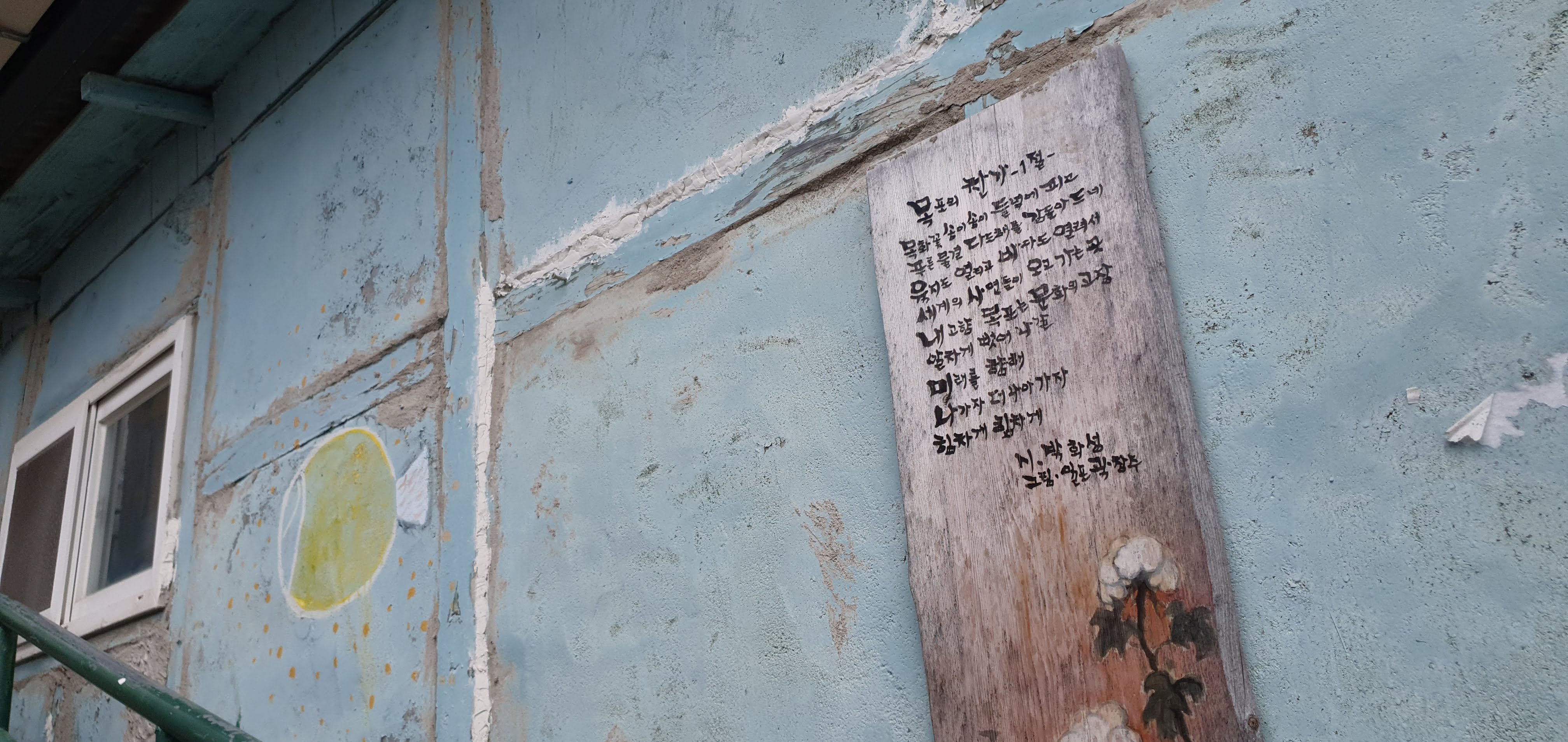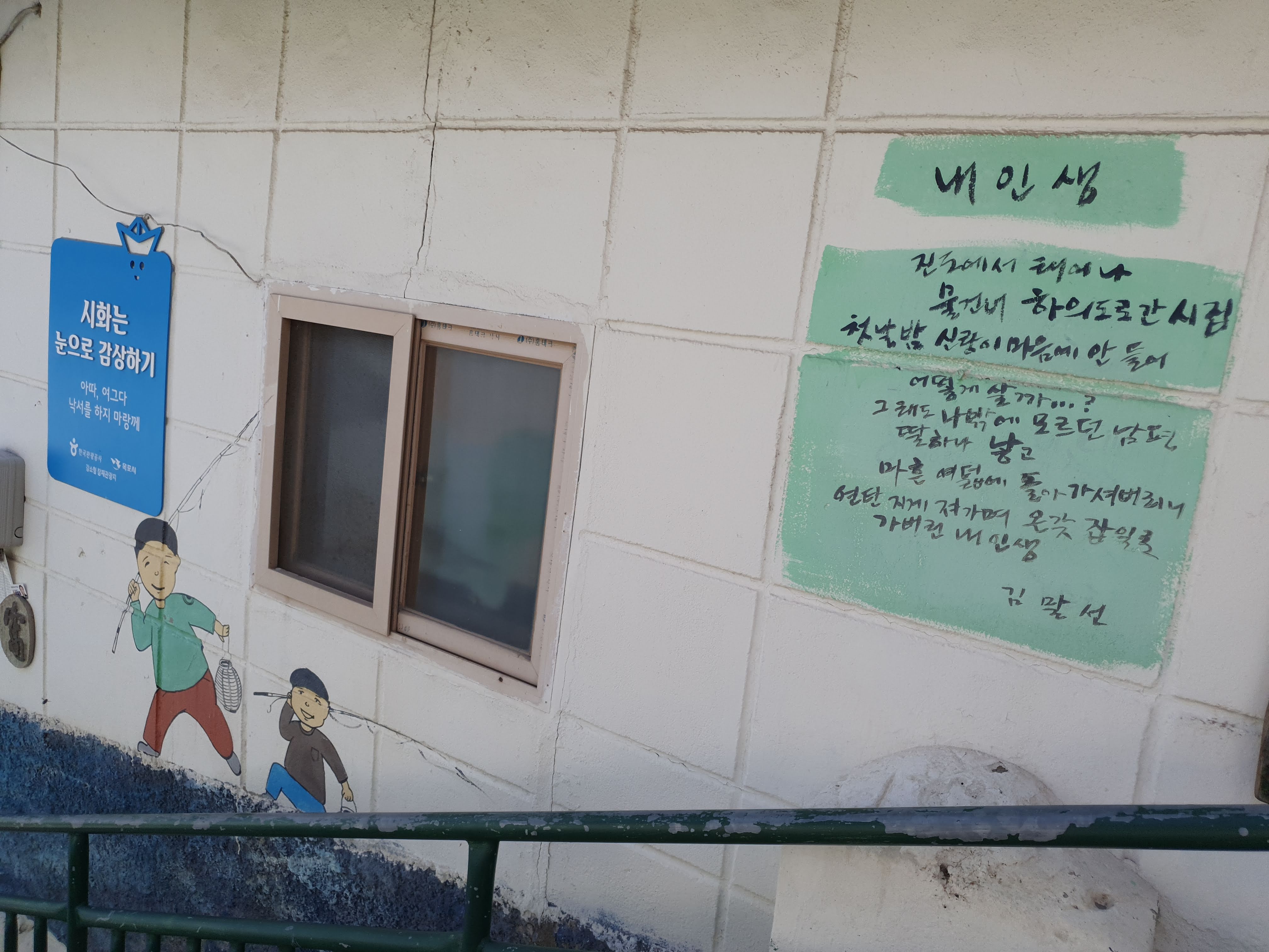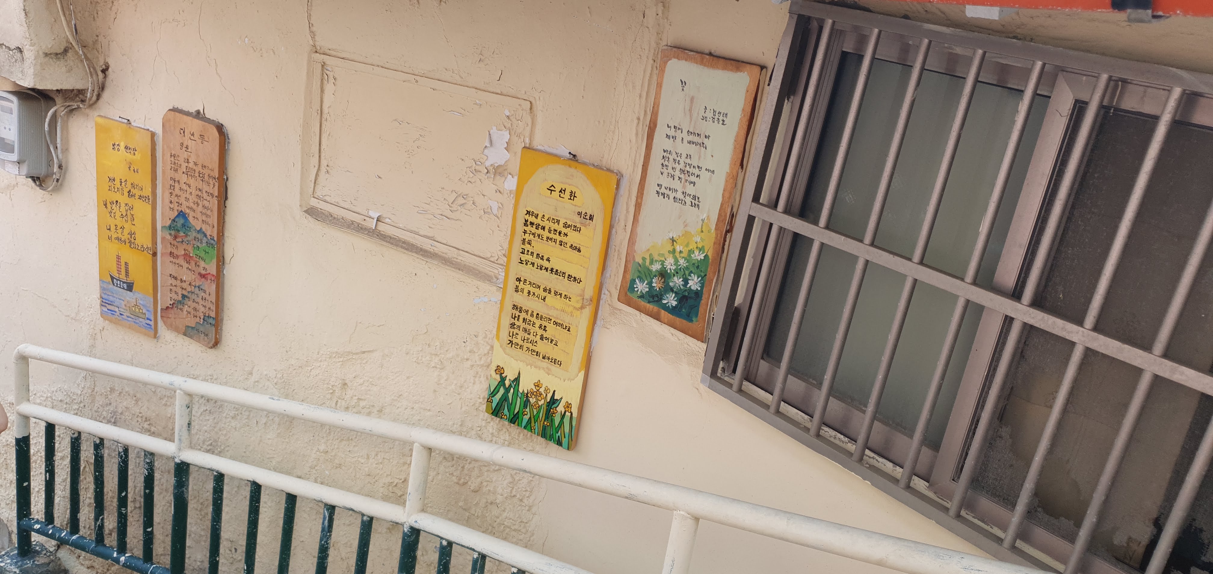'대화는 소곤소곤' 붙어 있는 이유가 이 시화골목에 동네분들이 살고 있기 때문인 거 같았습니다. 골목길을 다니다 보면, 물 내리는 소리나 도란도란 거주하시는 할머니들이 집안에서 얘기하는 소리가 밖에까지 들리곤 했으니까요.