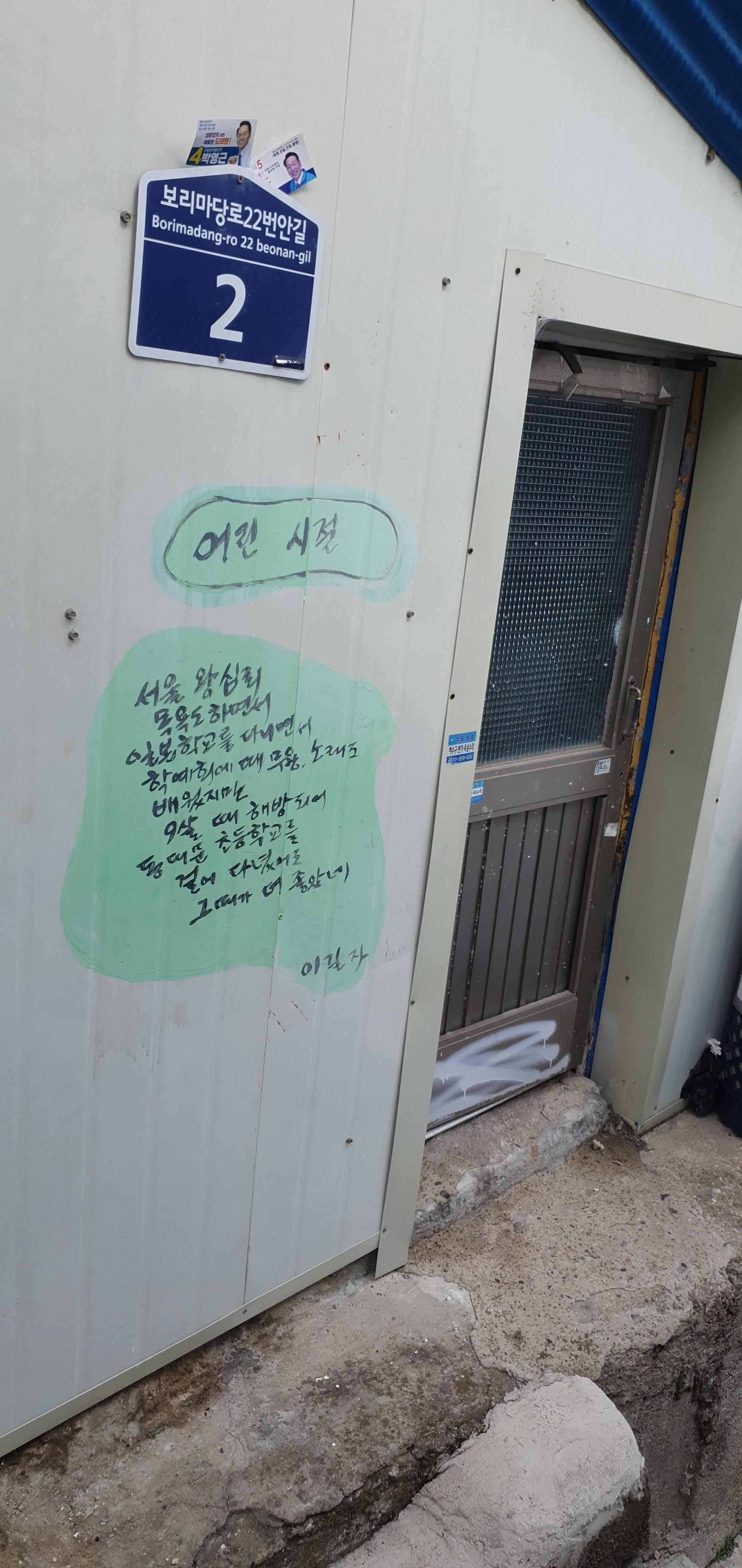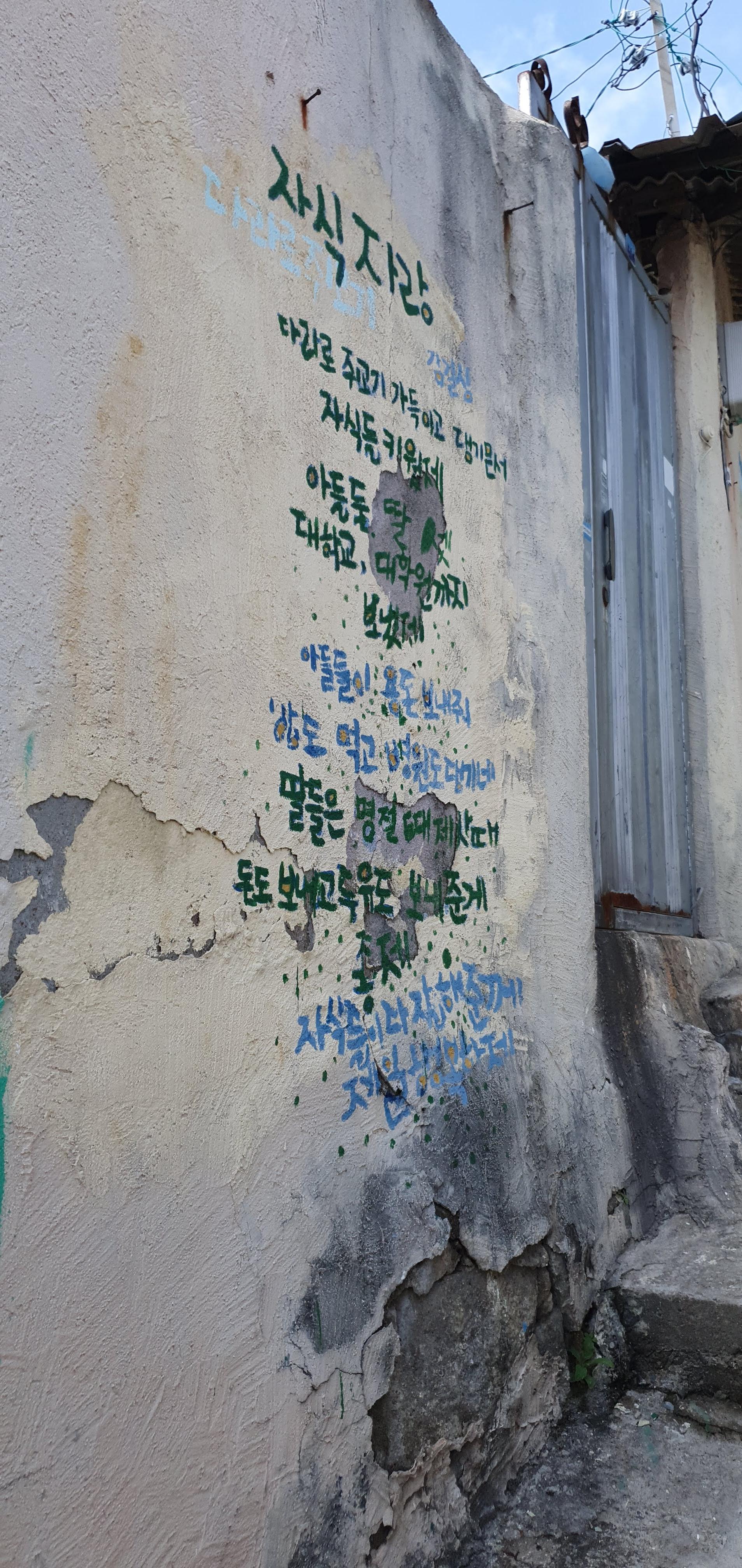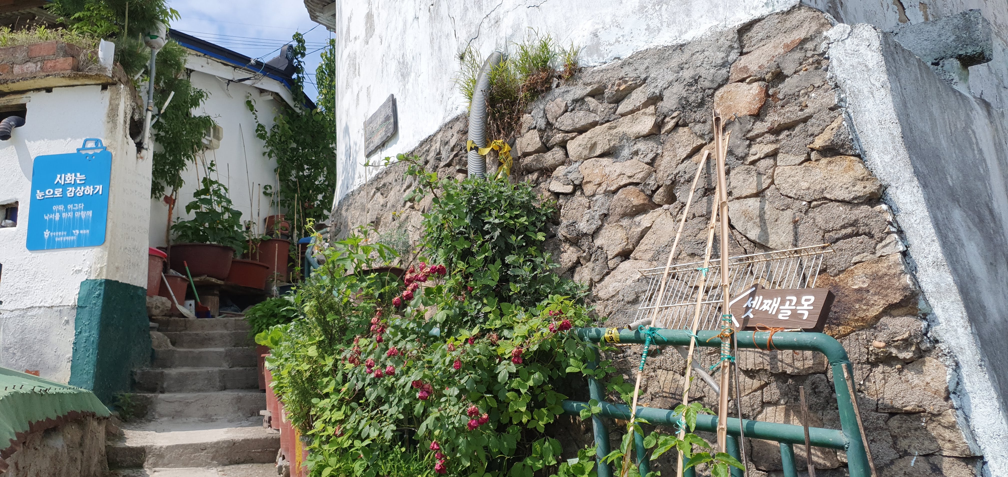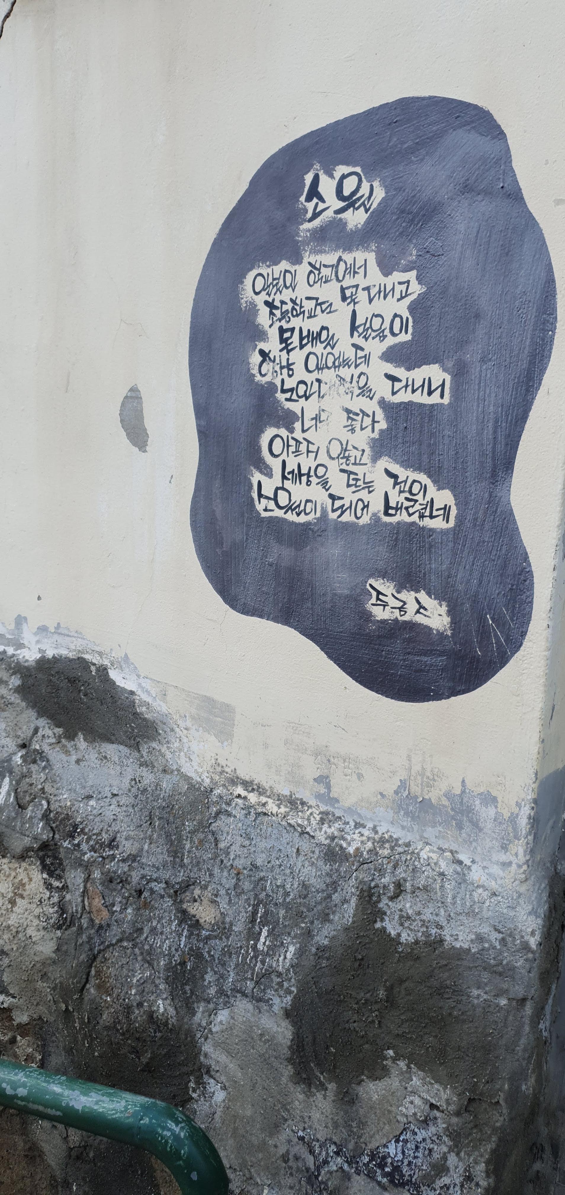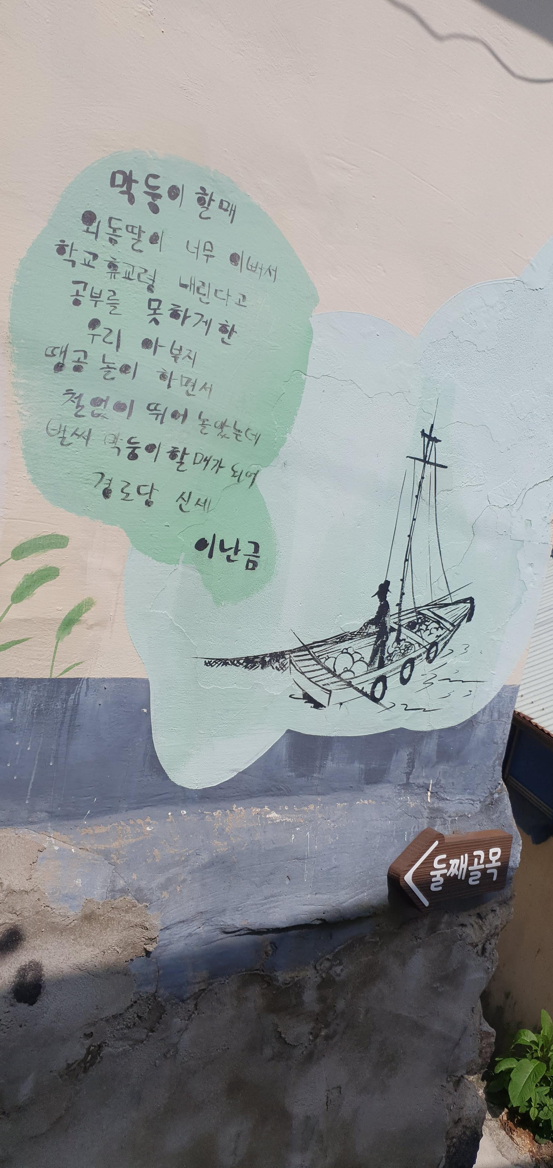 '대화는 소곤소곤' 붙어 있는 이유가 이 시화골목에 동네분들이 살고 있기 때문인 거 같았습니다. 골목길을 다니다 보면, 물 내리는 소리나 도란도란 거주하시는 할머니들이 집안에서 얘기하는 소리가 밖에까지 들리곤 했으니까요.