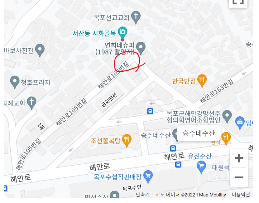 목포해양대쪽에서 걸어오다가 보면 '해안로 163번길' 푯말이 붙어 있는 골목으로 들어가셔도 됩니다. 나오는 차, 일방통행이니까 차 조심하시면서 들어가시면 됩니다. 요즘은 코로나가 풀려서 관광버스도 많이 다니는 거 같네요.