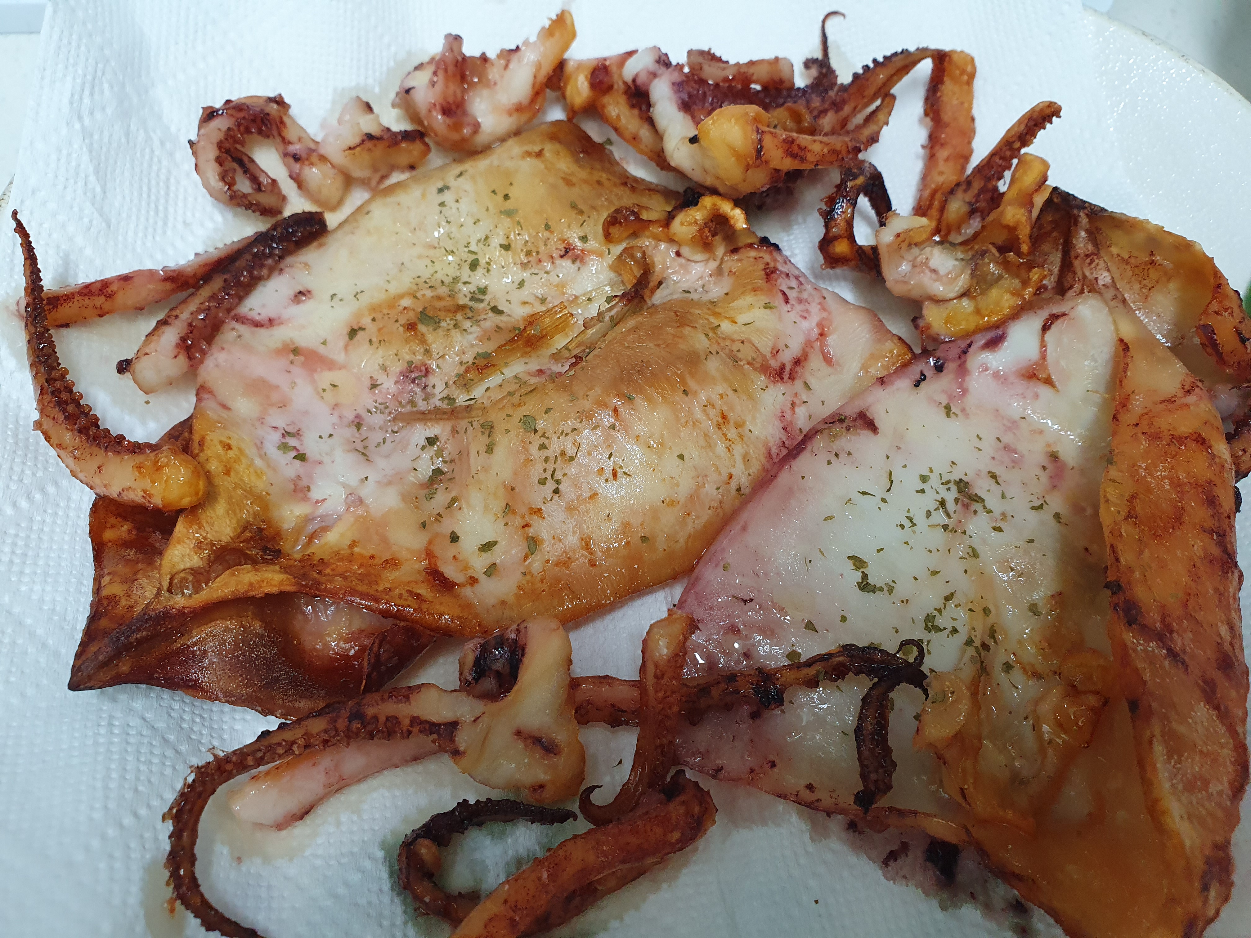 에어프라이어 180도로 20분 정도 돌리니까 구릿빛 오징어가 맛깔스러워 보였습니다.