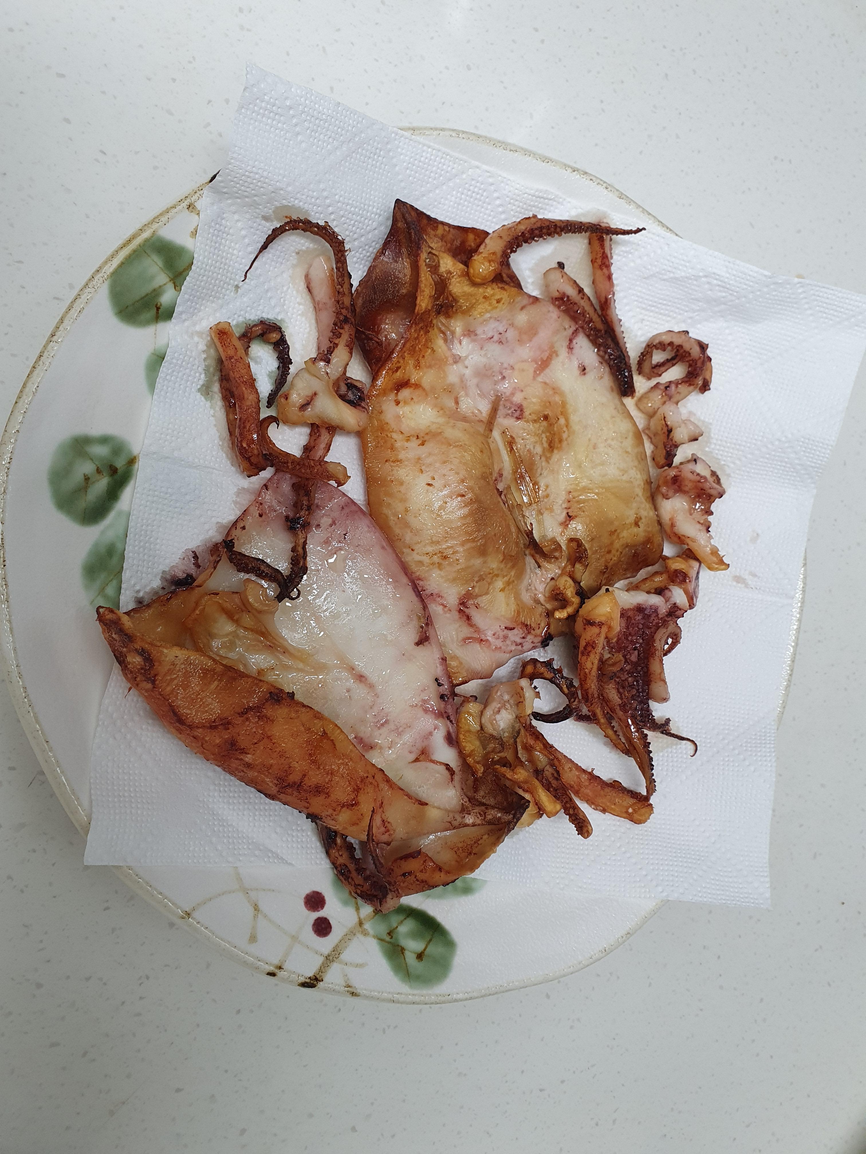 우선 냉동고에 있던 반건조오징어를 물에 씻어서 물기를 뺐습니다.