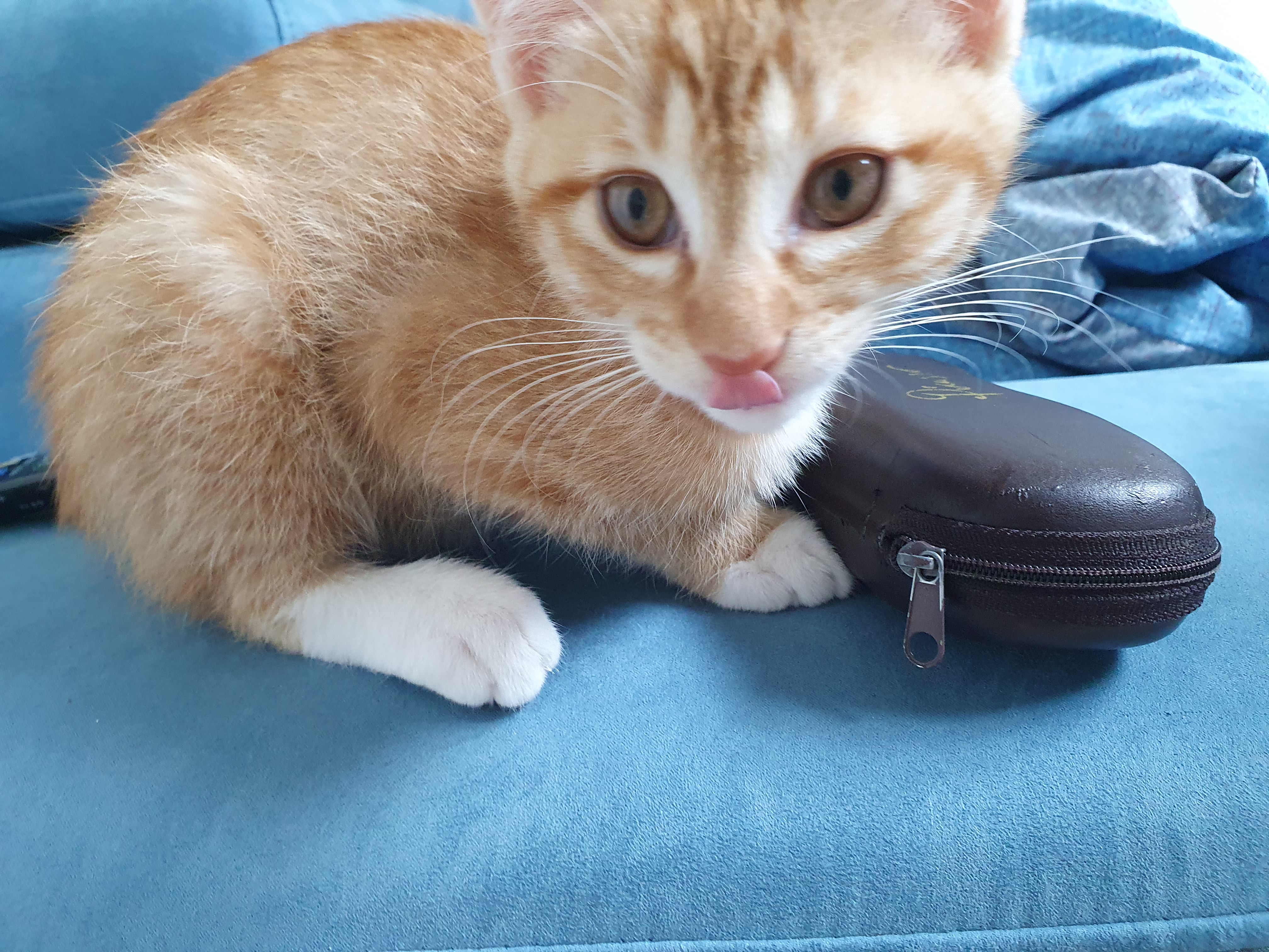 새옹이(치즈태비)는 안경집을 가지고 노는데 송이는 시무룩합니다.
