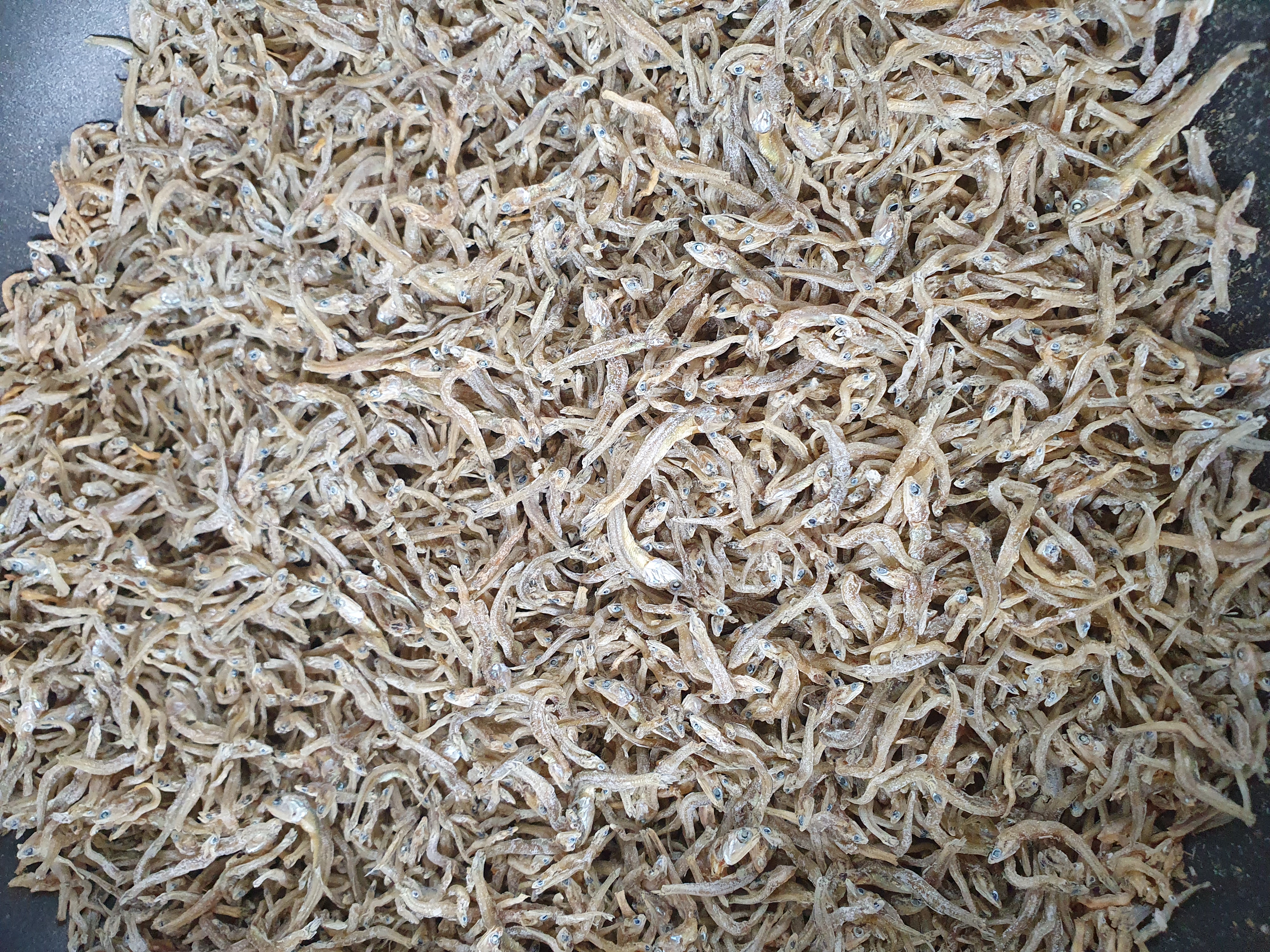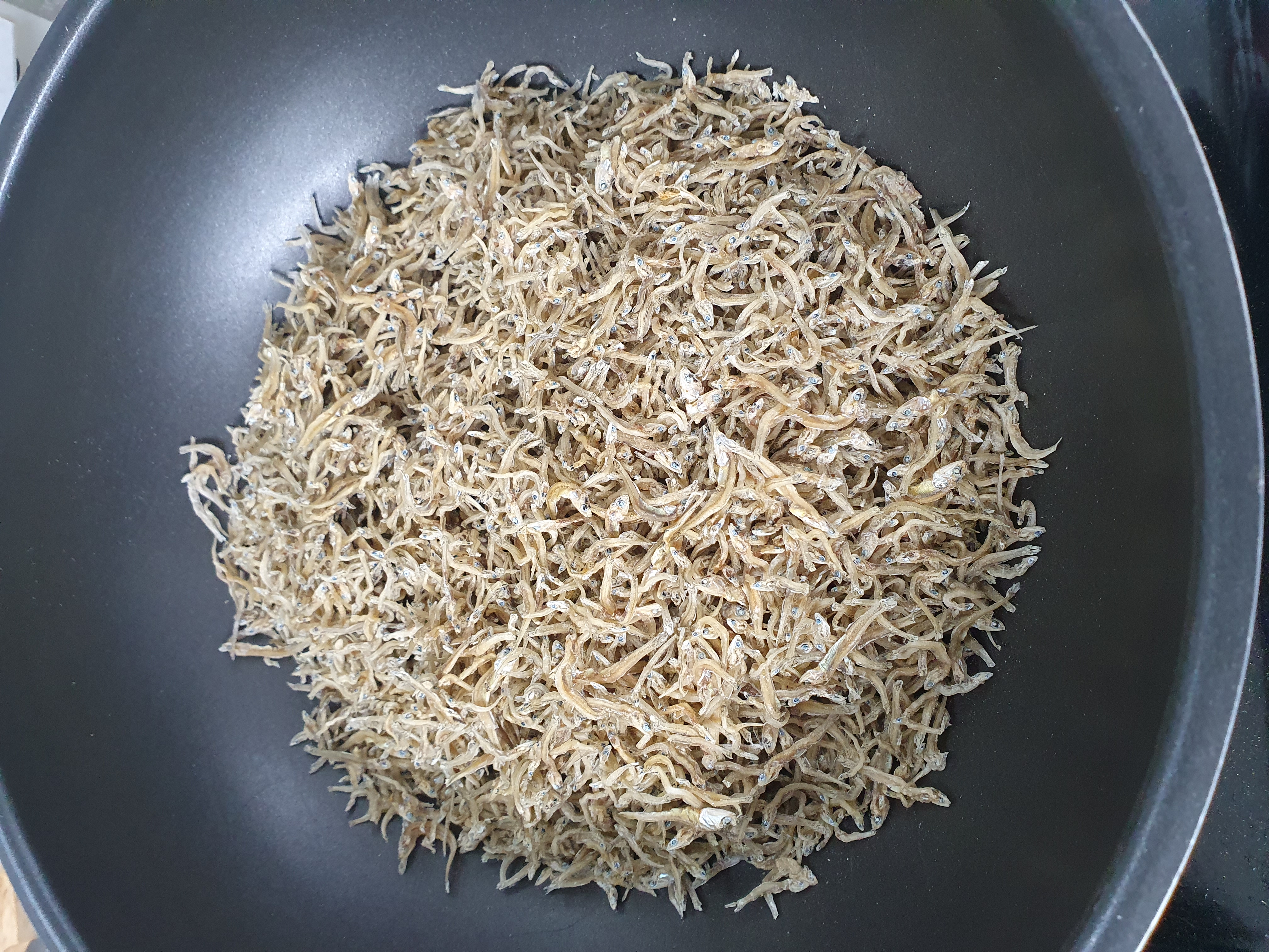 그 사이 잔멸치를 프라이팬에 누렇게 되도록 볶아서 비린내가 날아가도록 합니다.