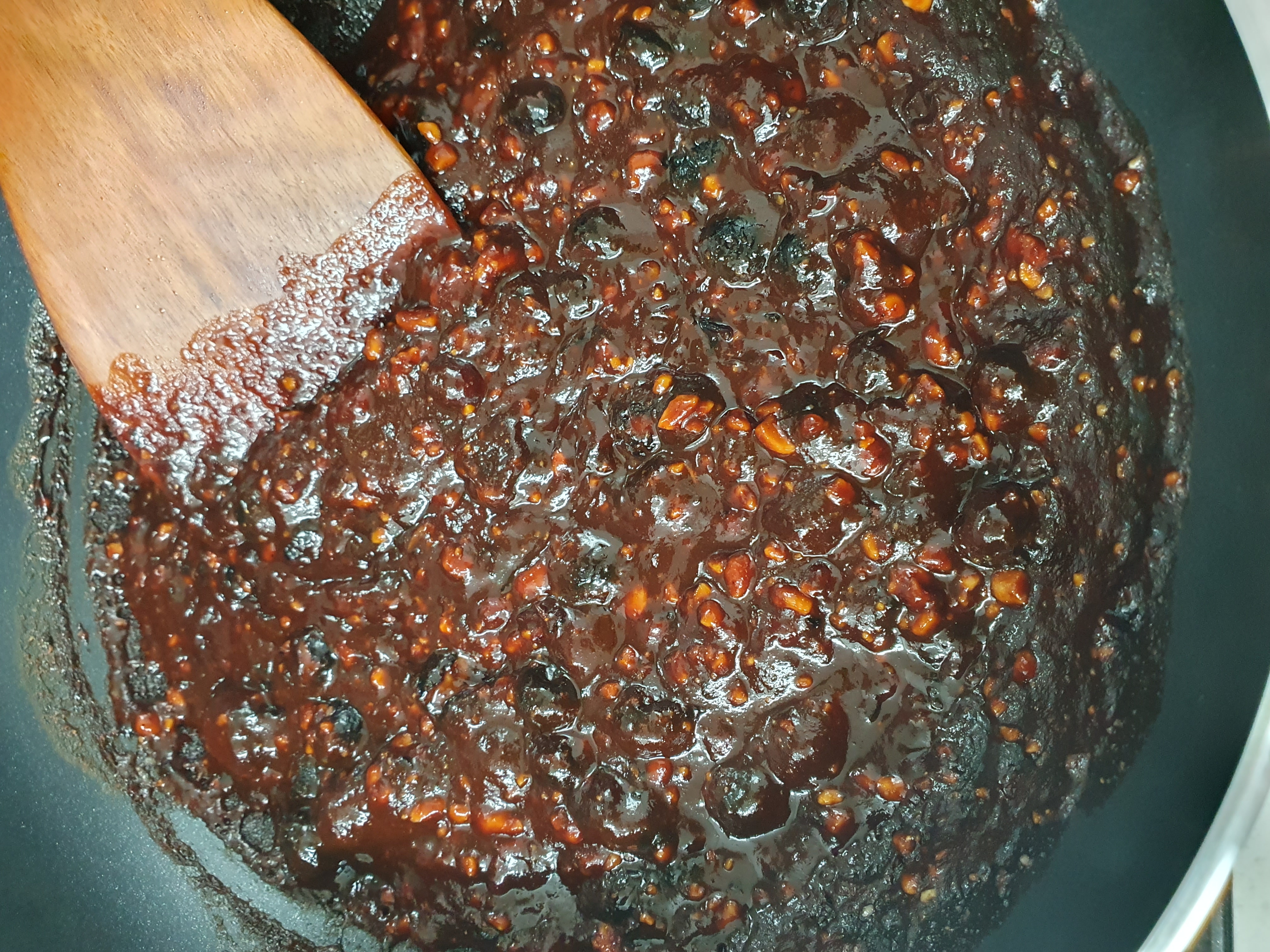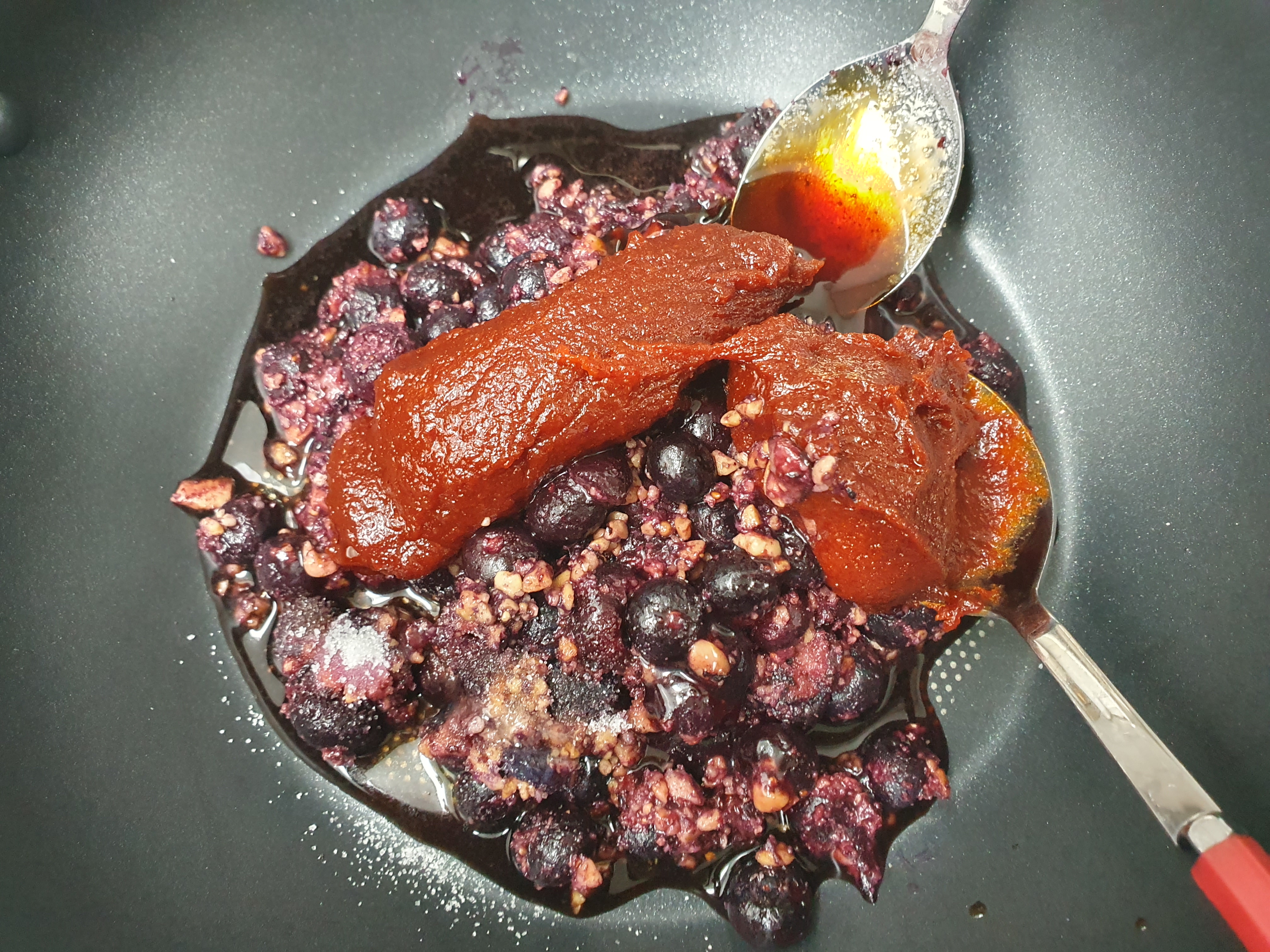 센불에서 양념장을 볶으면서 블루베리를 으깨 줍니다. 양념이 다 섞이면 불을 꺼 줍니다.
