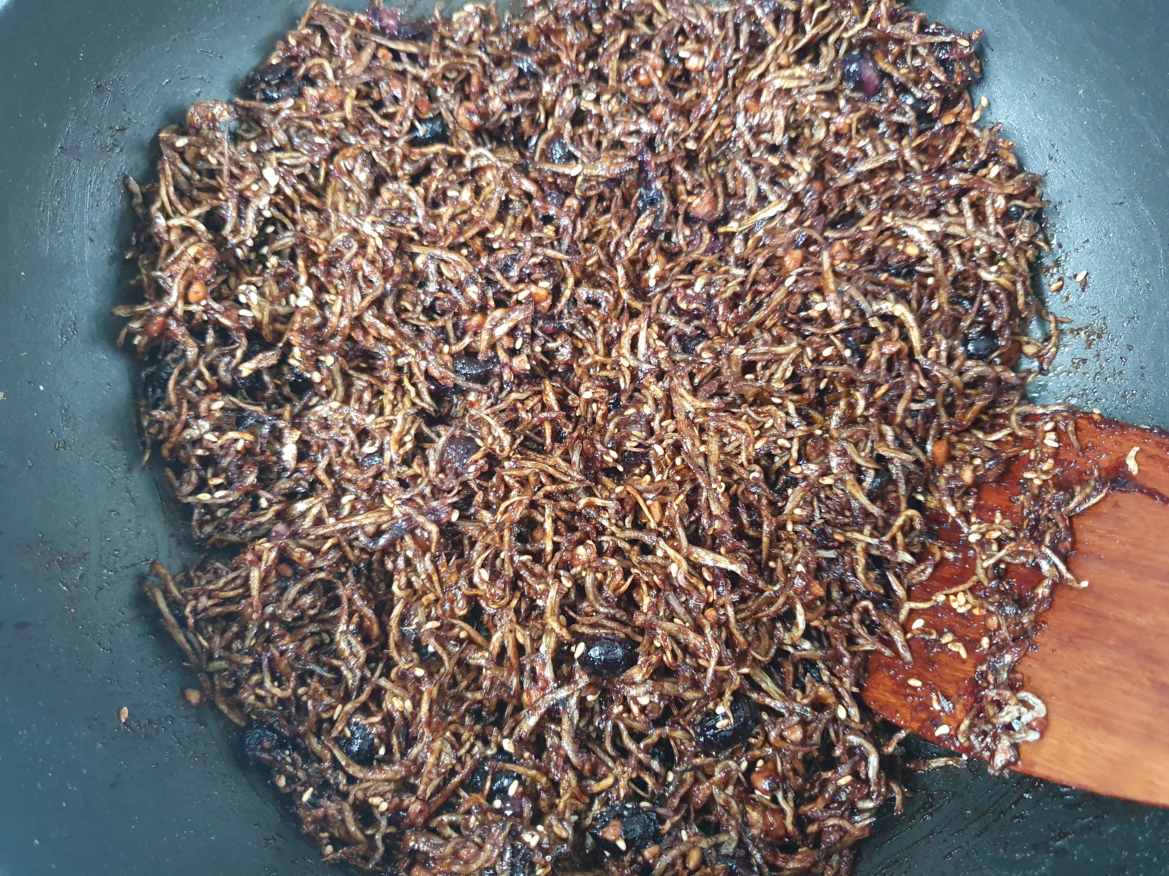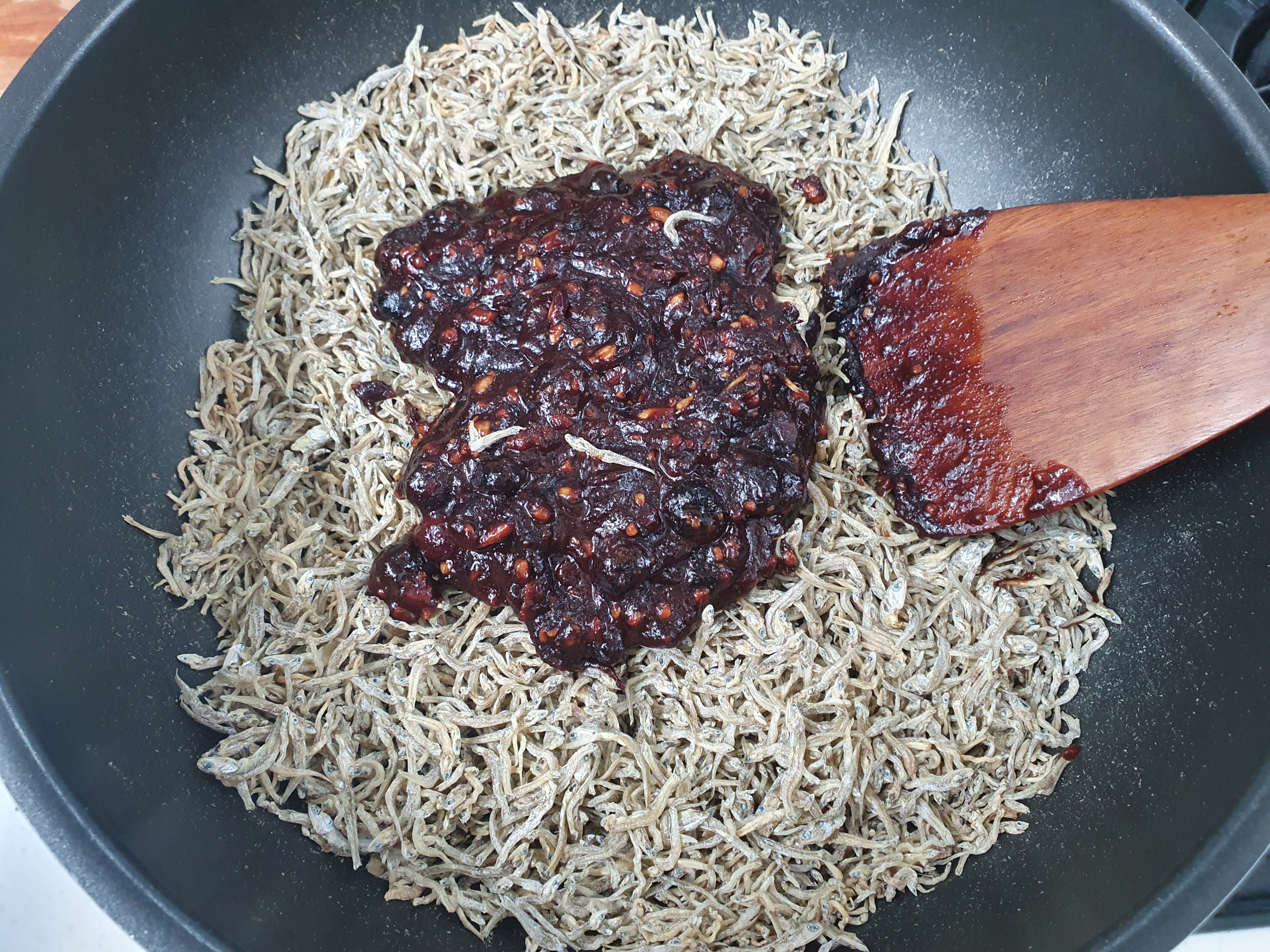 노릇해진 멸치에 양념장을 넣고 잘 섞어 줍니다.