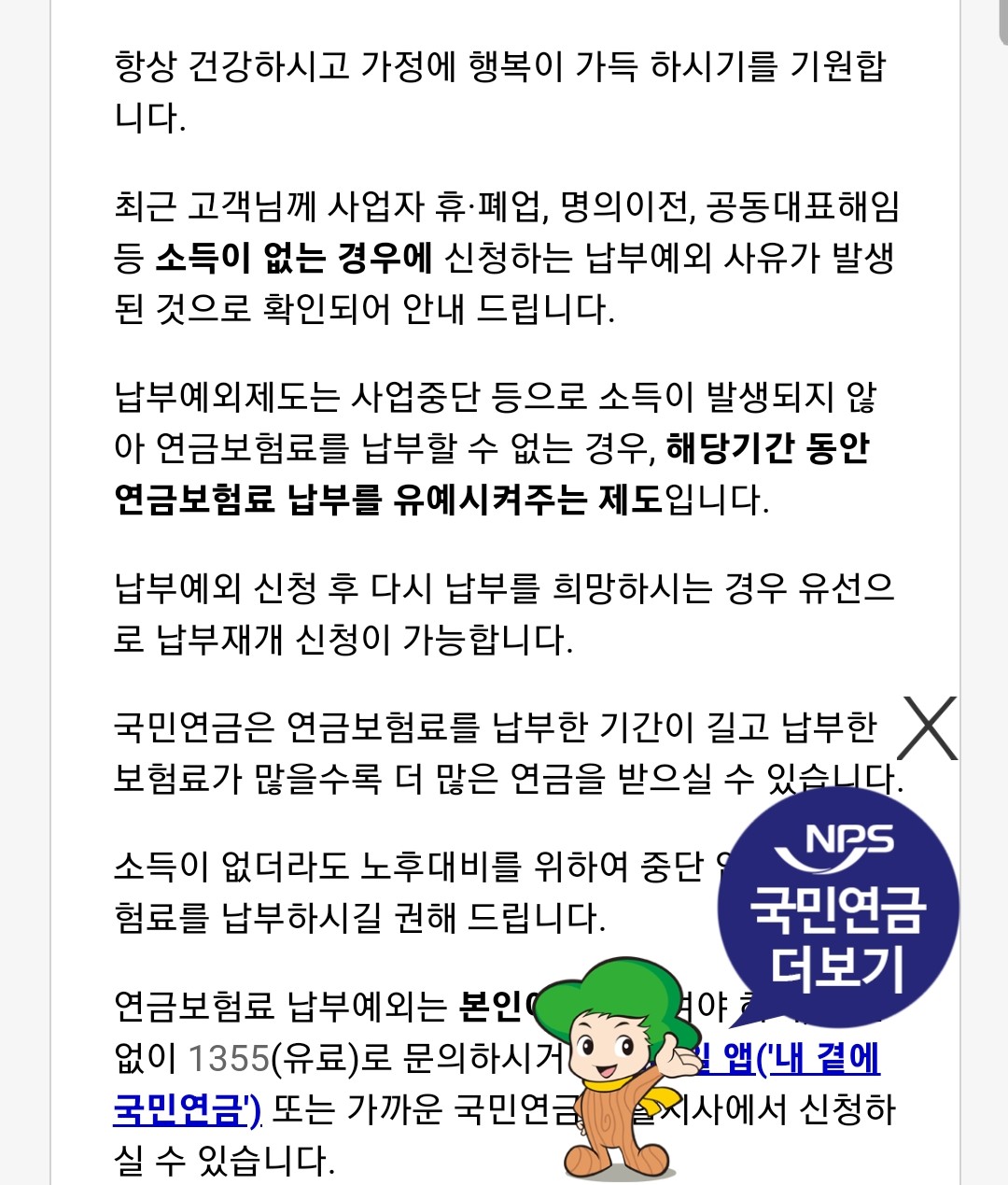 국민연금을 내지 않아도 되는 사유가 되니 납부예외를 신청하라고 합니다. 국민연금 고객센터 1355 또는 '내 곁에 국민연금' 앱에서 신청을 하라고 합니다.
