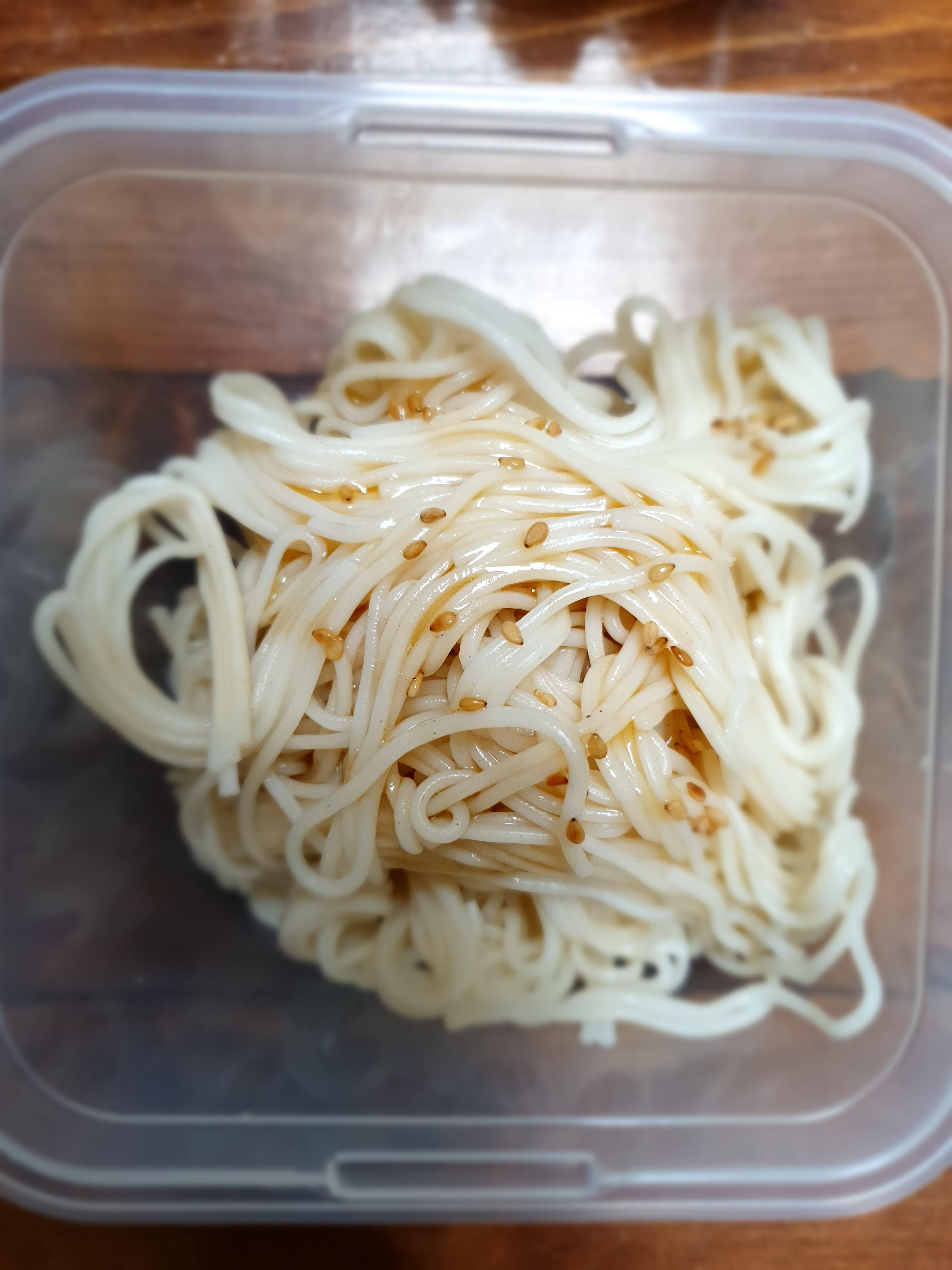그리고 여기에 참기름 몇 방울을 떨어 뜨려서 소면이 달라붙지 않게 잘 섞어 줍니다.