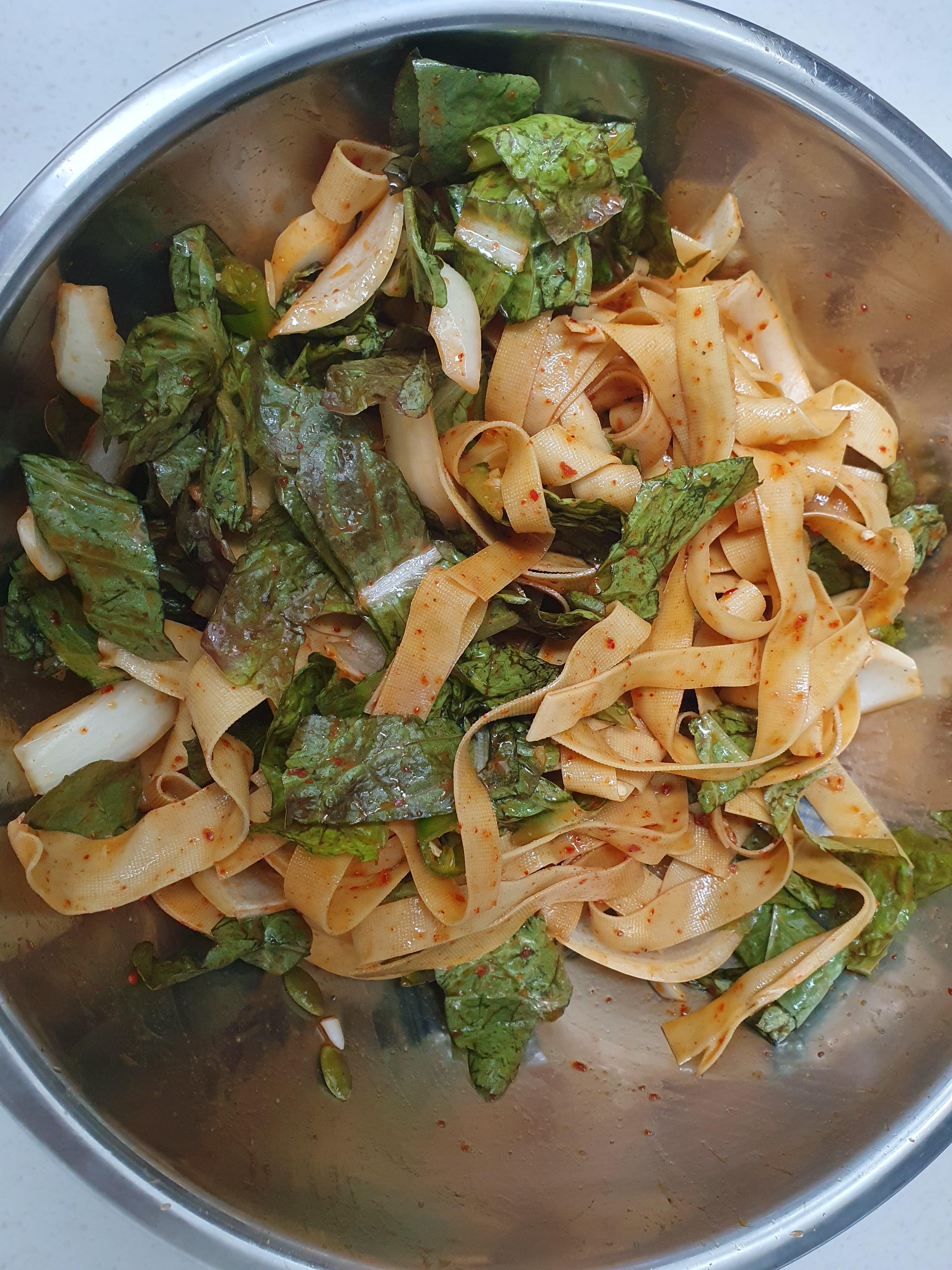 올리브유, 식초, 통깨를 넣고 잘 버무려 줍니다.